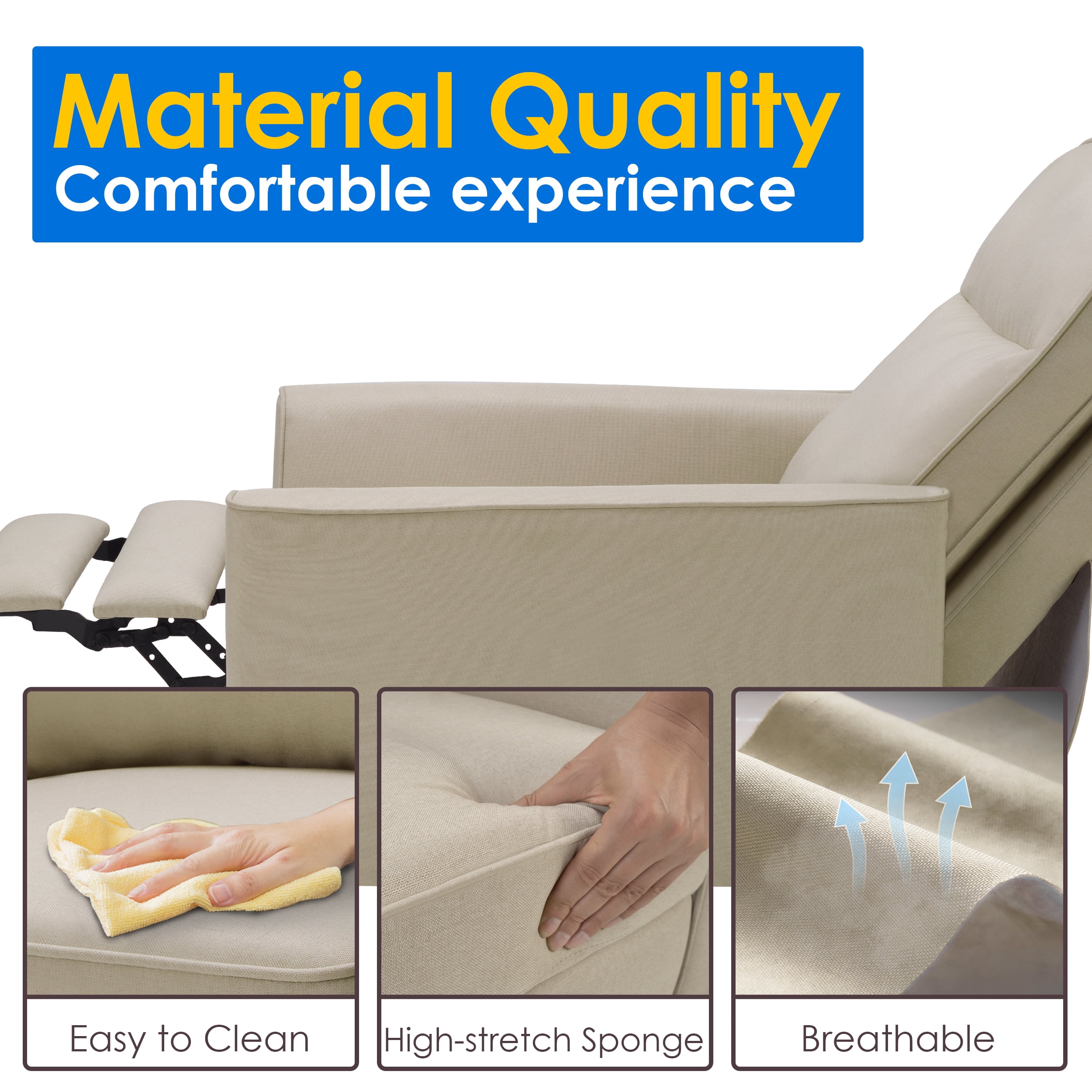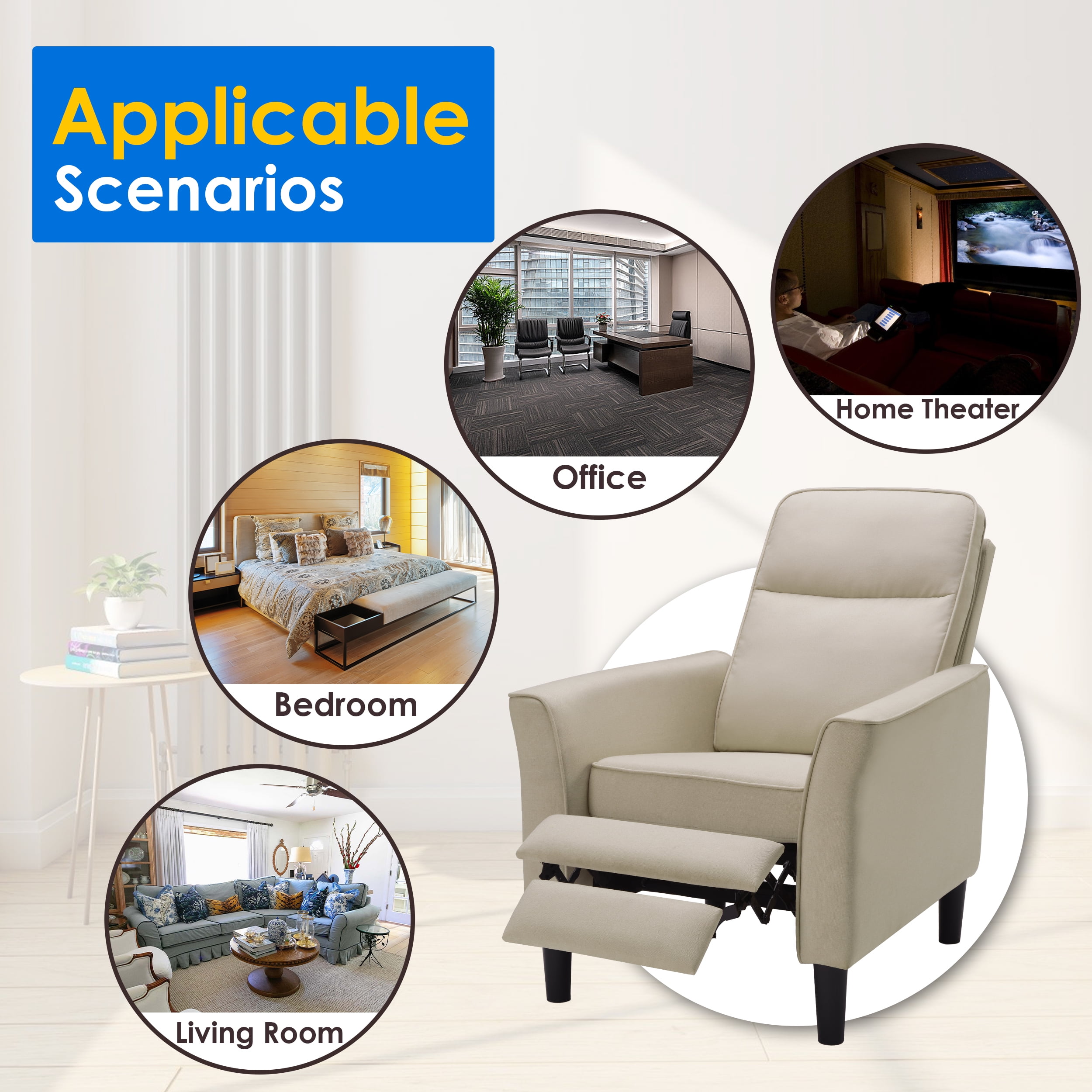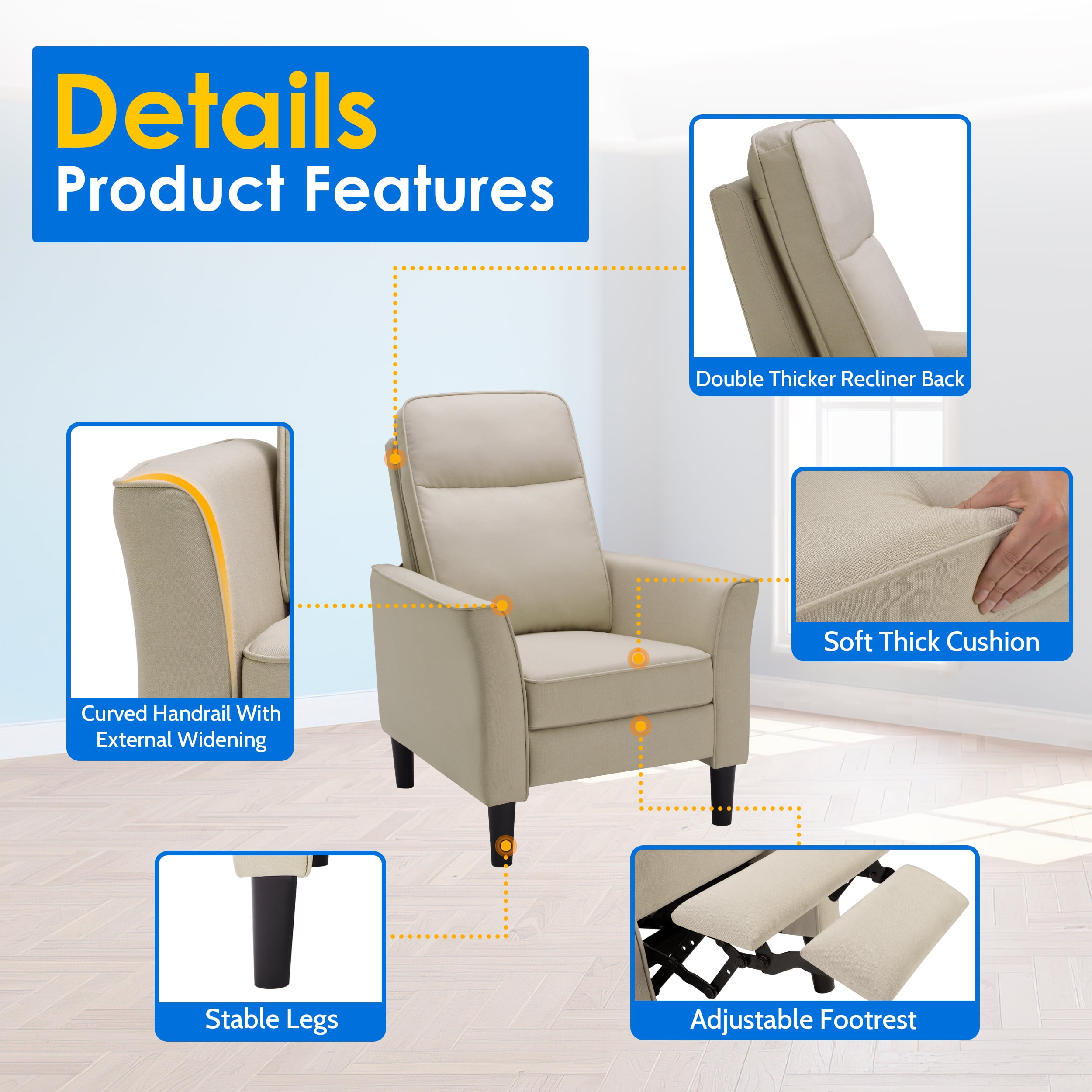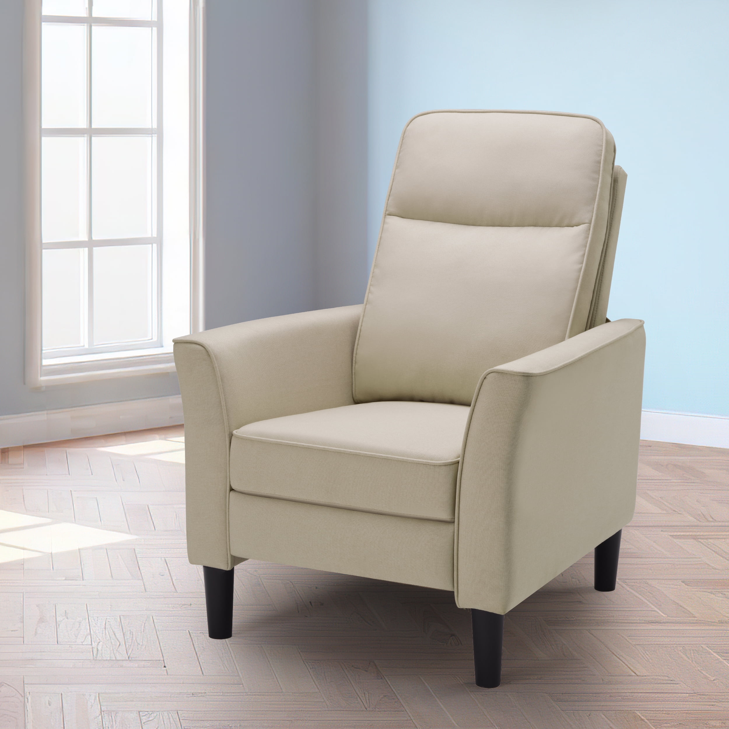 Spruce up your bedroom or living room in a streamlined style with a mid-century modern fabric recliner. This adjustable recliner is constructed of a strong composite wood frame, high-density foam, quality metal spring, and hard-wearing 100% polyester cover. The robust recliner sofa is capable of holding up to 331 lb. The button-tufted details on the back showcase a touch of texture, and its neutral color tone can coordinate with any home decor. A fully reclined back and pop-up footrest lets you relax and kick back with a movie after a long day at work. You can enjoy your favorite sitting positions on this adjustable reclining chair, no matter whether you prefer sitting up straight with your legs up or lying flat. With a simple push at the backrest, the footrest instantly pops up and stops at any angle from 0 to 90 degrees. Our fabric reclining chair can be your private sofa in the living room, office, or bedroom to relax and take a load off, or a perfect spot to spend your leisure time with games, movies, TV dramas, and music. Push-Back Recliner Chair Design With Adjustable Footrest, Wider Armrests With a Curved Shape, Larger-Size Seat Cushion, Thicker Recliner, Beige Specification: