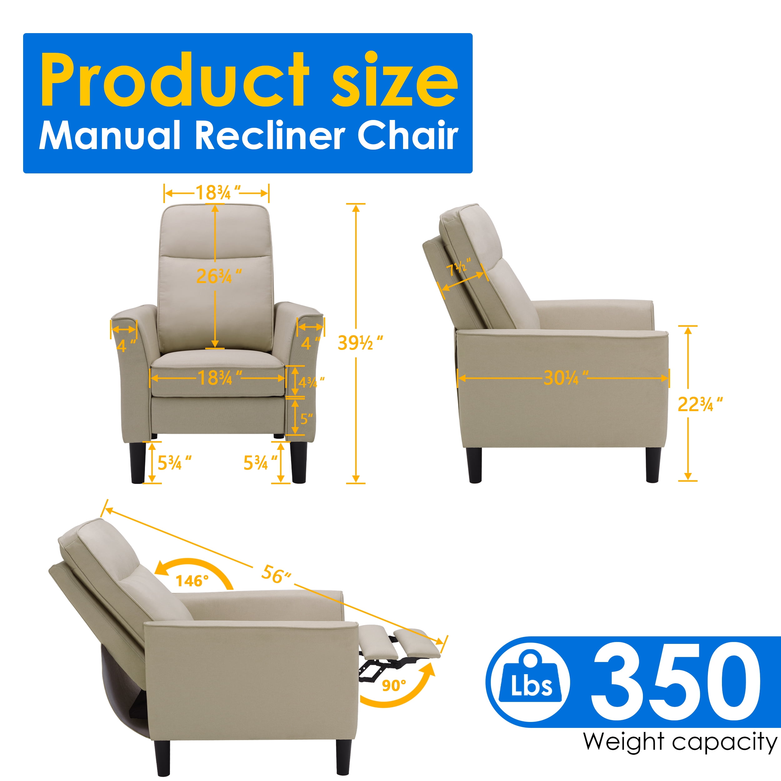 3 angle adjustments: Push back can from 110 degrees to 160 degrees Material: Made of 100% Fabric, High Density Memory Foam, Metal Spring, Wood, Metal Dimensions: 26.5″W x 33.5″D x 40″H Dimensions when reclined: 26.5″W x 61.8″D x 30.5″H Maximum weight capacity 350 lb Extras: Highly resilient, thickly padded seat cushion and thickened backrest, upgraded footrest is better for enjoying your favorite TV shows or rest. Easy assembly: Assembly is necessary, but very simple. This lounge chair is divided into two parts, the backrest and the base. It only takes a few minutes to put them together, and then tighten the legs. If necessary, it is also easy to disassemble. Warranty: In addition to the 90 days warranty of , we will prolong the warranty period to 1 year to enhance your shopping experience.