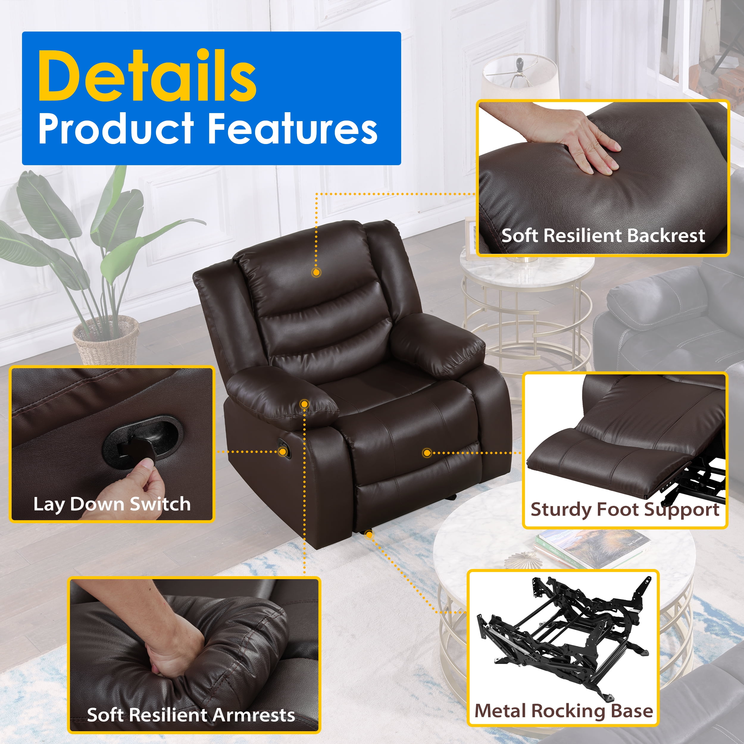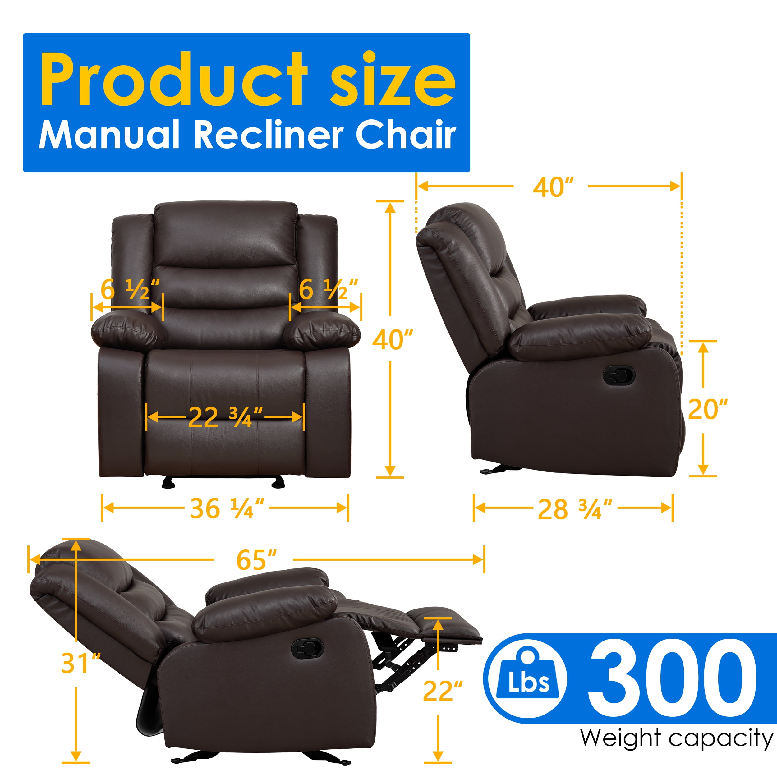 This Manual Oversized Recliner is made of doll cotton, PVC, wooden frame, iron frame, and sponge. It features a full chaise pad between the chair and the leg rest to support the legs for a truly comfortable recliner. Offering full range reclining, upholstered seating, and ultra-padded armrests, and the leg rest has deep cushioning to take the pressure off your lower body, this is a rocking chair that is perfect for watching TV, reading, or relaxing. With one swift action using the manual handle, you can instantly recline, stretch out, and take a deep breath. This high-level styled chair will be a great choice for a living room, bedroom, theater room, media room, and home theater.