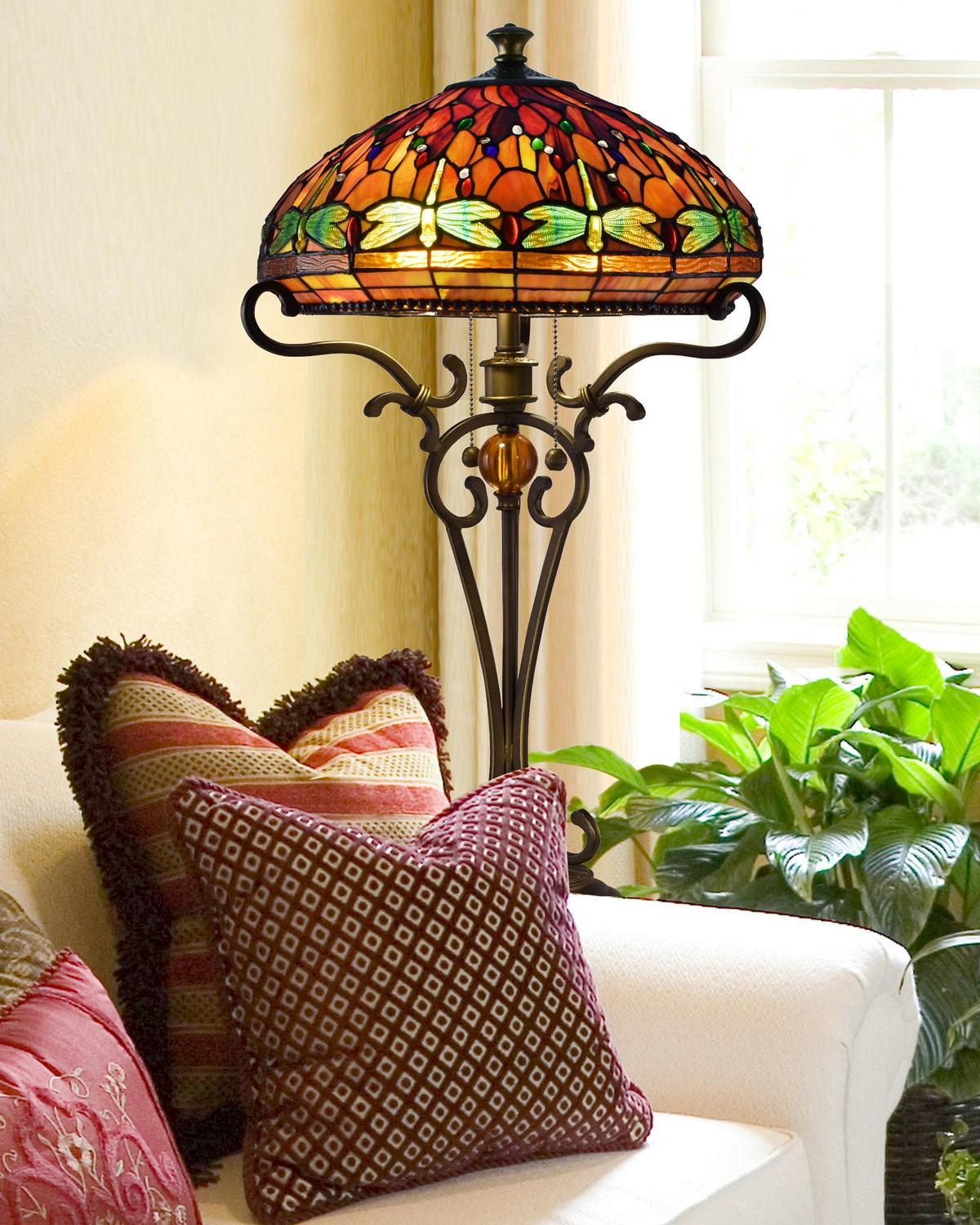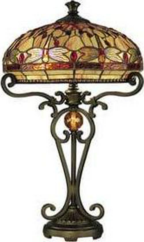 Dale Tiffany Lighting-TT10095-Collection: Briar Dragonfly, Material: Metal, Finish Color: Antique Golden Sand, Width: 16″, Height: 24″, Length: 16″, Number Of Bulbs: 2, Wattage: 60 Watts, Moisture Rating: Dry Rated, Desc: Dragonflies rim the shade just above a bold band of amber art glass panels. A background of amber art glass is a lovely setting for the vivid art glass jewels in jewel tone shades of red, green, blue, amber and white, which are interspersed throughout for added texture and color. The shade rests atop flowing scrolled arms. The metal base, finished in antique golden sand, features elongated scrolls atop a pedestal which come together surrounding a hand cut amber glass jewel. Stunning displayed on its own, try displaying it with the torchiere for a true statement piece your family will enjoy for generations to come. Shade Included. / Cube: 4.96. ,-Briar Dragonfly – Two Light Table Lamp