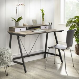 The Tucker Desk is a modern contemporary desk and makes the perfect writing and/or computer desk. The sleek design features mixed media of wood and metal. Fashioned with Laminated MDF with Driftwood look and Metal Legs with two drawers and one open shelf. Overall dimensions: 47.2″L x 23.6″W x 33.7″H. Drawers feature a polished cut out puller in antique silver. The upper back piece features an outlet to route wires and cables. Removable drawers can be used without drawer so there is three open shelves. Drawer dimensions: 10.5 W x 2.55 H x 6 D Open shelf dimensions :17.25 W x 2.75 H x 6 D