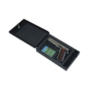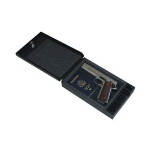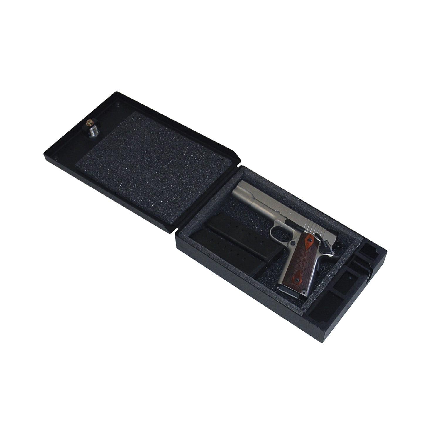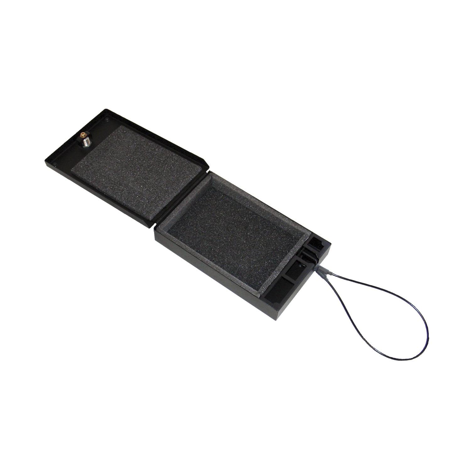 Weighing less than 4 lbs., this lockable welded steel storage box can be used to secure a firearm and protect valuables while carrying it by hand between locations, during travel, inside a vehicle, home or office. Keyless entry is provided by Tuffy’s 3 digit combination lock with a two-point steel cam for added security. The included 2 ft. long, 2000 pound test, steel security cable secures the safe to any sturdy mounting surface by attaching to the 1/8 inch steel security cable anchor point. The inside is lined with low-density foam to protect the contents, while compression bumpers keep the lid vibration-free when closed.