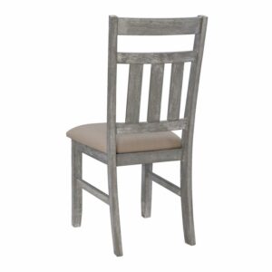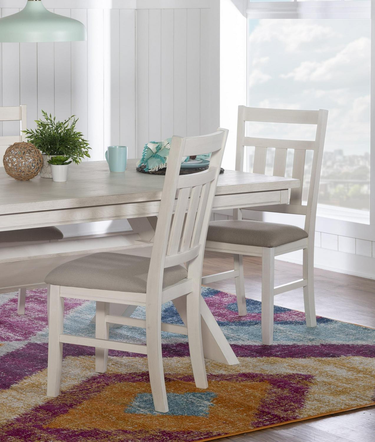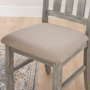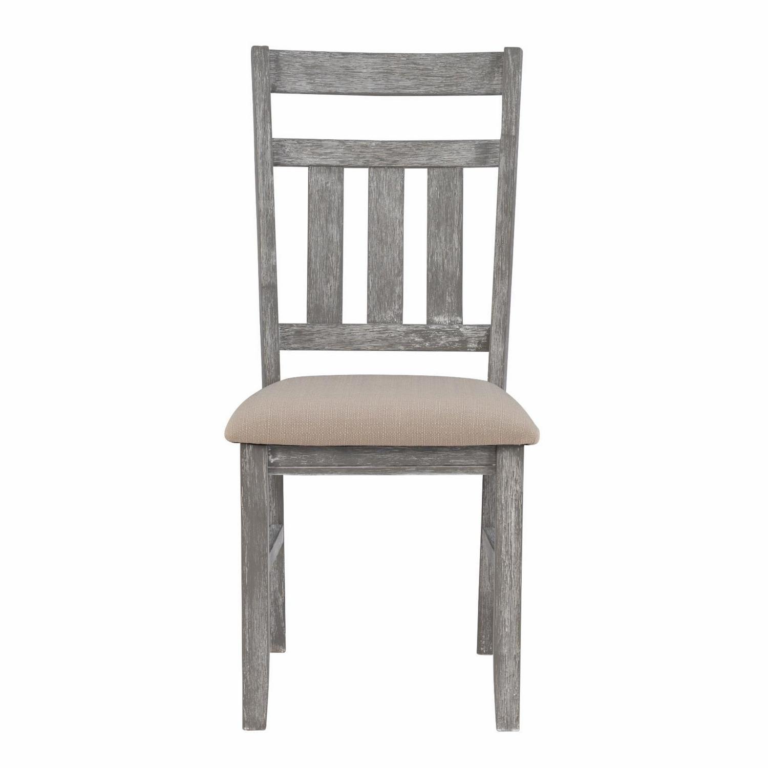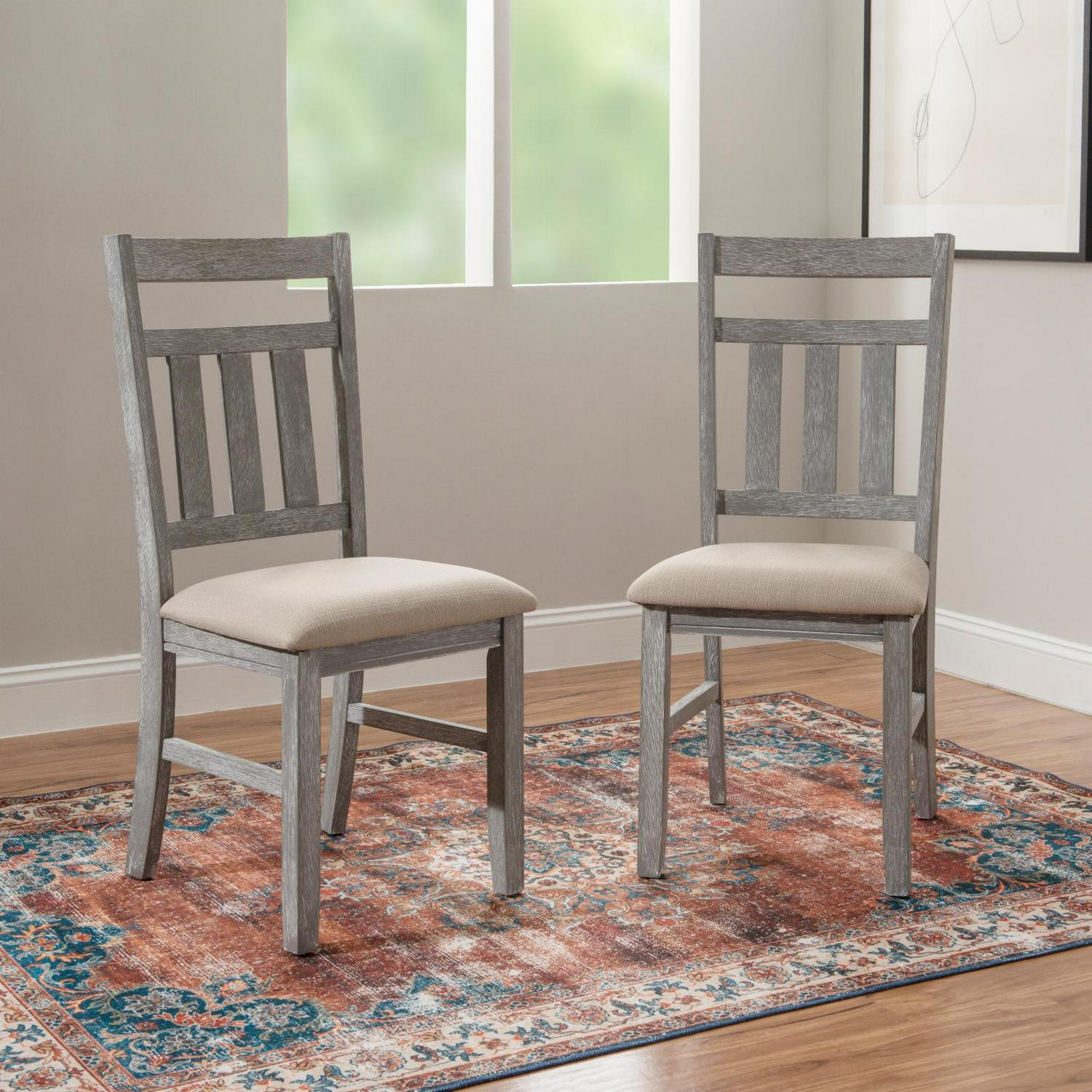Outfit any room with this perfect Powell Turino 2-piece chair set. It features traditional straight lines and a simplistic slat back style. A solid tan fabric in a basketweave construction covers a plush, comfortable seat. It has a durable rubberwood, MDF and Ash veneer construction in a smokey white finish, which delivers an updated farmhouse vibe. Some assembly required.