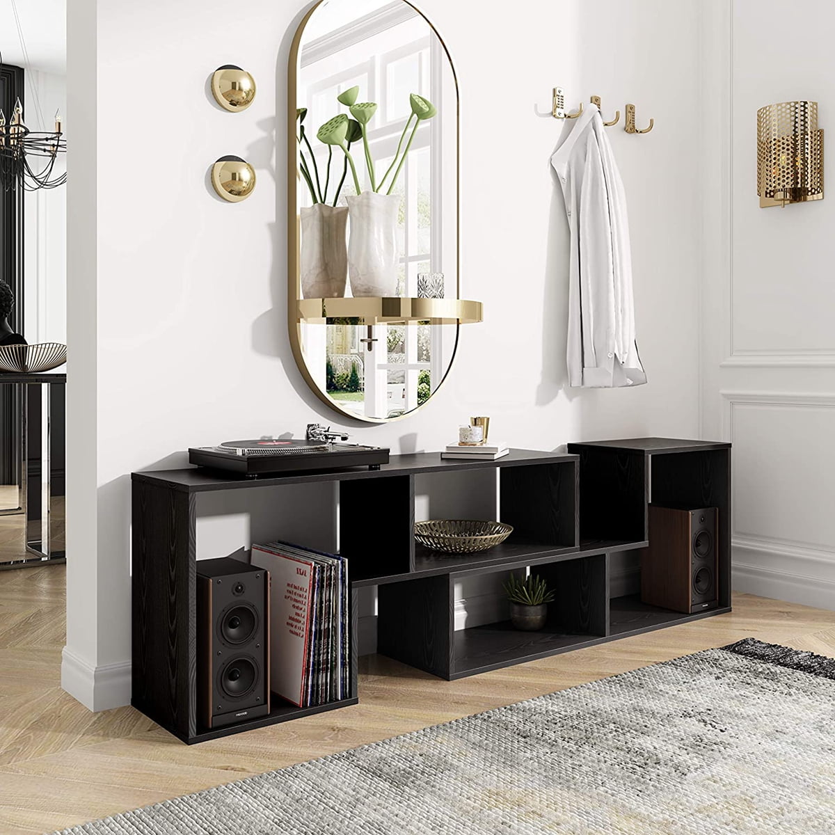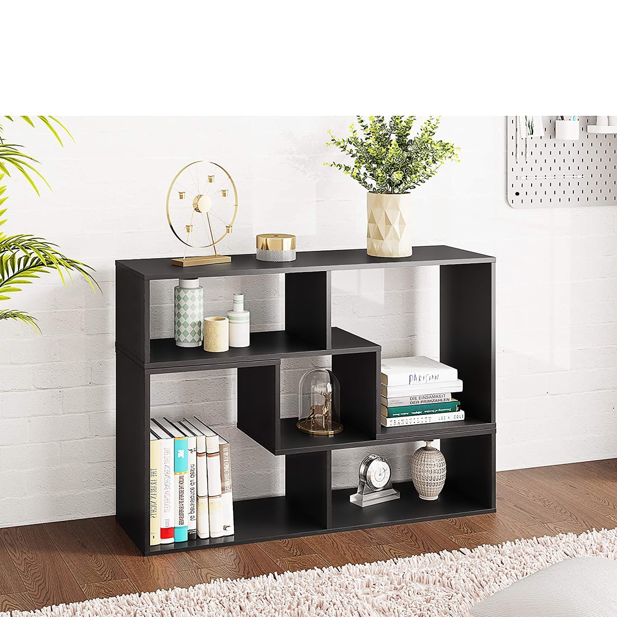 Perfect for various uses, this TV console is fabulously versatile. Its versatile design allows you to switch between various bookcase and TV stand configurations effortlessly. The L-shaped shelves are arranged in striking geometric designs, giving it a modern look. The asymmetrical arrangement of shelves creates an intriguing silhouette while offering ample storage space. Constructed with particle board and laminate, this piece is both stylish and functional.