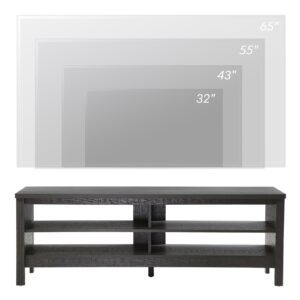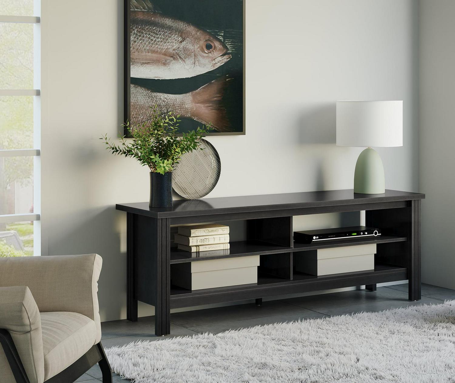 The black wood grain and simple lines on this tv stand make it look classic and elegant. It can be not only used as televison stands, also perfect for sofa table, entertainment center, media stand, storage console table, tv console etc.This TV stand is perfect for TVs up to 65inch TV.4 open shelves with big capacity allow you to storage the books, magazines, CDs and any other media or gaming devices.The media console table made of high quality MDF which is durable and sturdy enough to be used for a long time. Plus, four wooden legs further enhance stability, preventing the TV stand from wobbling. Max load capacity: 175lbs.The black entertainmen center for 76 inch tv with smooth surface is waterproof and easy to keep clean with a damp cloth.The tv table is 3.9 in high height off the ground which adequate for robot vacuum cleaner can passing freely. No more headaches from dust under the cabinet.