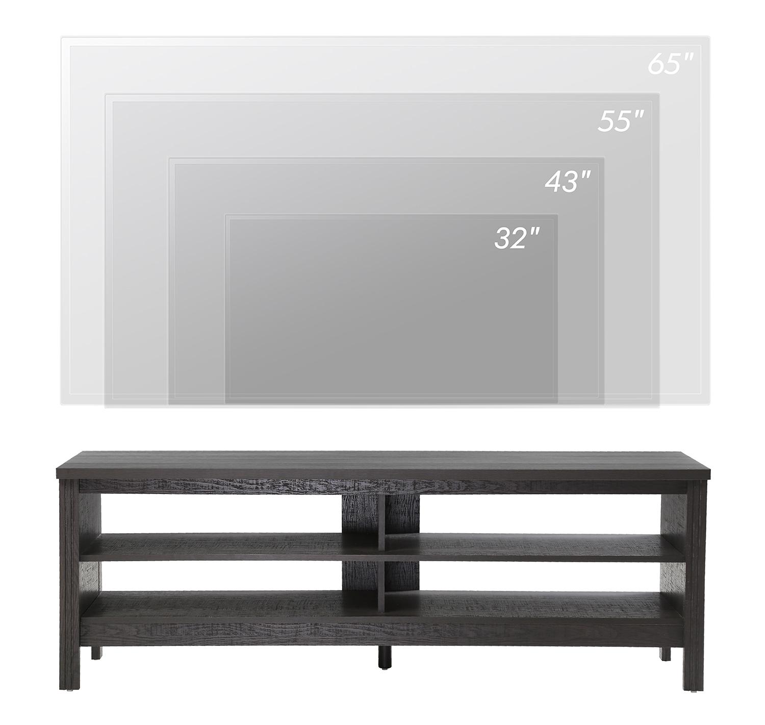 Large Capacity This TV stand is perfect for TVs up to 65 inch TV.4 open shelves with big capacity allow you to storage the books, magazines, CDs and any other media or gaming devices.
