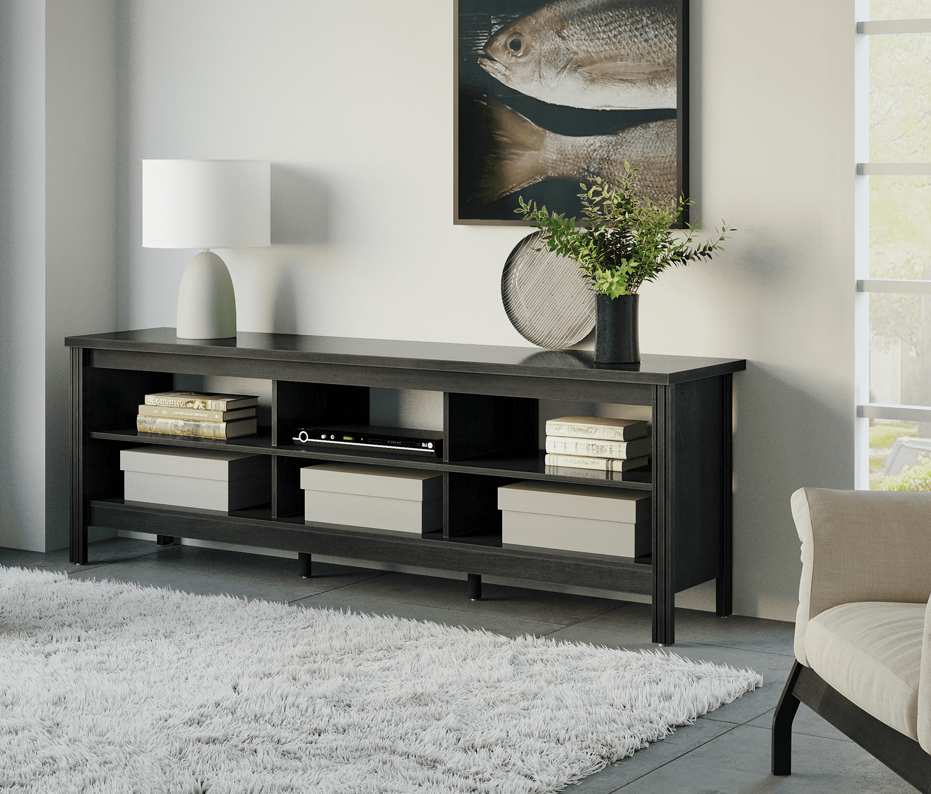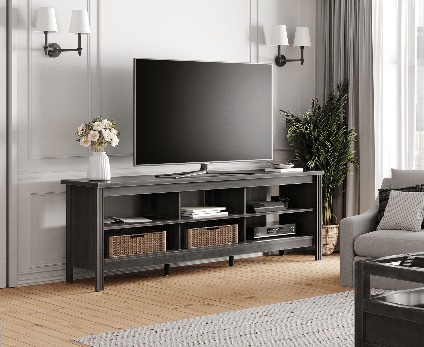 Dimension: 70″L x 15.5″W x 23.6″H. Complement a variety of contemporary decors with this sophisticated classic TV stand, perfect for the modern home. Superior Construction: Made of high quality MDF and wood material, this 70 inch TV stand features a sturdy and strong frame that boasts natural wood grain laminate, Offering long life span. Large Storage Space: The TV unit stand is perfect for 75 inch tv. And 6 open shelves with big capacity allow you to storage the books, magazines, CDs and any other media or gaming devices. It provides space for loose media accessories and a set-top box. Keeping your living room clean and tidy is the mission of our TV media cabinet. Versatile Entertainment Center: The perfect piece for living rooms, bedrooms, and lounge areas, this media console accommodates your entertainment essentials with ease while supporting TVs up to 75″. Easy to Assemble: The assembly of this tv console table is very simple. We provide all the required accessories and detailed instructions for the installation. Simply follow the instructions and you can quickly assemble it.