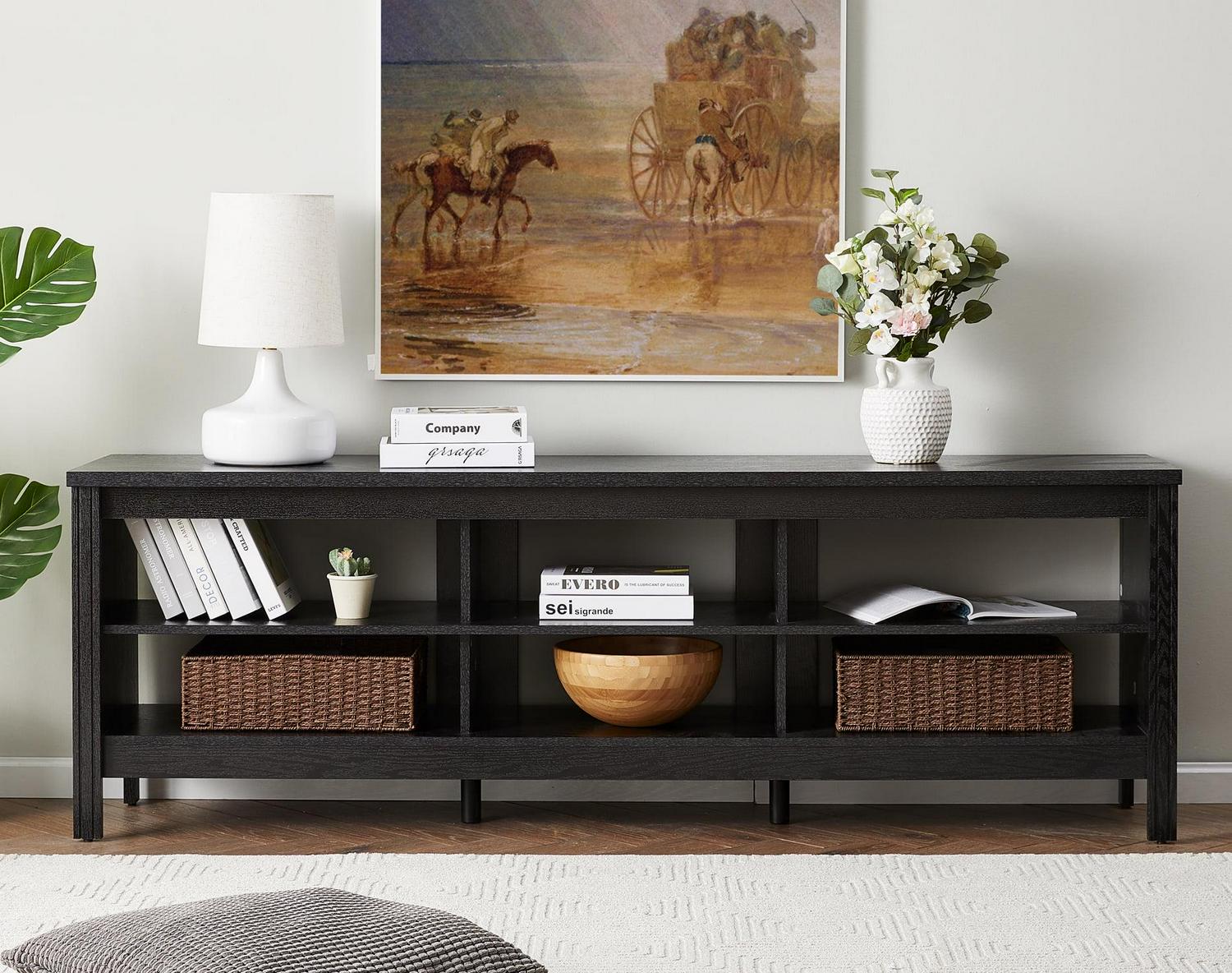 The black wood grain and simple lines on this tv stand make it look classic and elegant. It can be not only used as televison stands, also perfect for sofa table, entertainment center, media stand, storage console table, tv console etc. This TV stand is perfect for TVs up to 75 inch TV.6 open shelves with big capacity allow you to storage the books, magazines, CDs and any other media or gaming devices. The media console table made of high quality MDF which is durable and sturdy enough to be used for a long time. Plus, four wooden legs further enhance stability, preventing the TV stand from wobbling. Max load capacity: 260 lbs. The black entertainmen center for 75 inch tv with smooth surface is waterproof and easy to keep clean with a damp cloth. The tv table is 3.9 in high height off the ground which adequate for robot vacuum cleaner can passing freely. No more headaches from dust under the cabinet.
