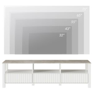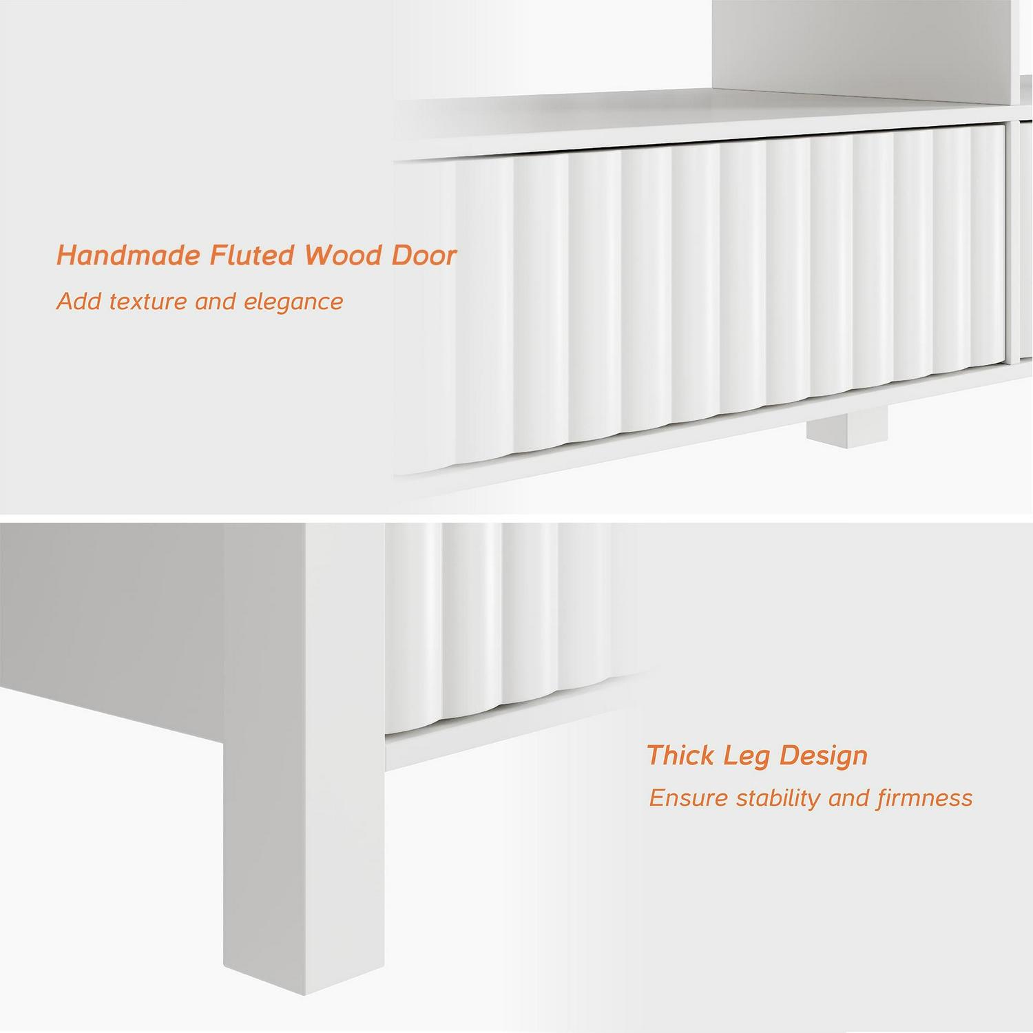 The white tv console comes with a LED light strip, creating amazing lighting effect and warm atmosphere to your room. Plus, without the limitation of the back board, the wood tv & media furniture allows you to organize the wires of audio-visual equipment effortlessly. Overall Dimension: 70 ×15.6 ×23.2 (L×W×H) Featuring custom stone pattern tabletop and handmade fluted wood door, the elegant led tv stand will be the most eye-catching piece of furniture in the room.