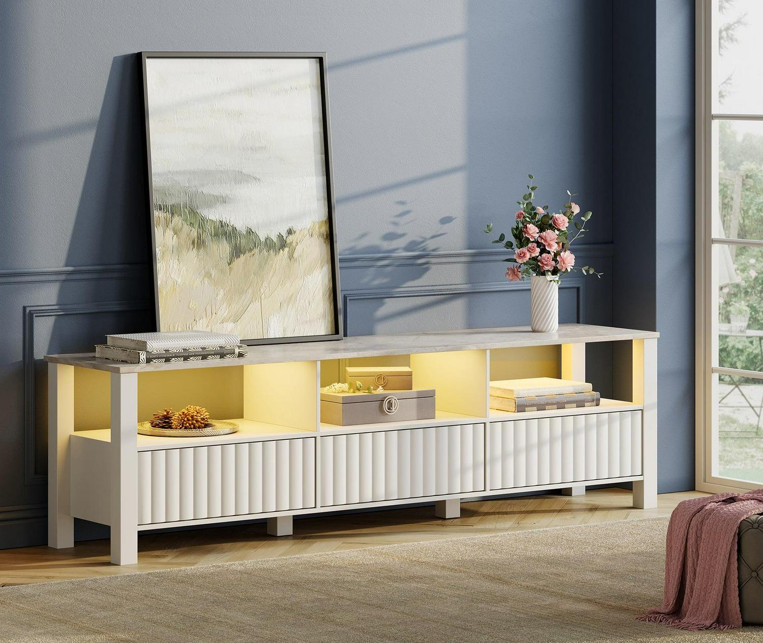 – LED Morden TV Stand The white tv console comes with a LED light strip, creating amazing lighting effect and warm atmosphere to your room. Plus, without the limitation of the back board, the wood tv & media furniture allows you to organize the wires of audio-visual equipment effortlessly. Overall Dimension: 70 ×15.6 ×23.2 (L×W×H)