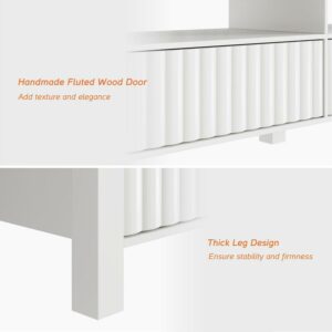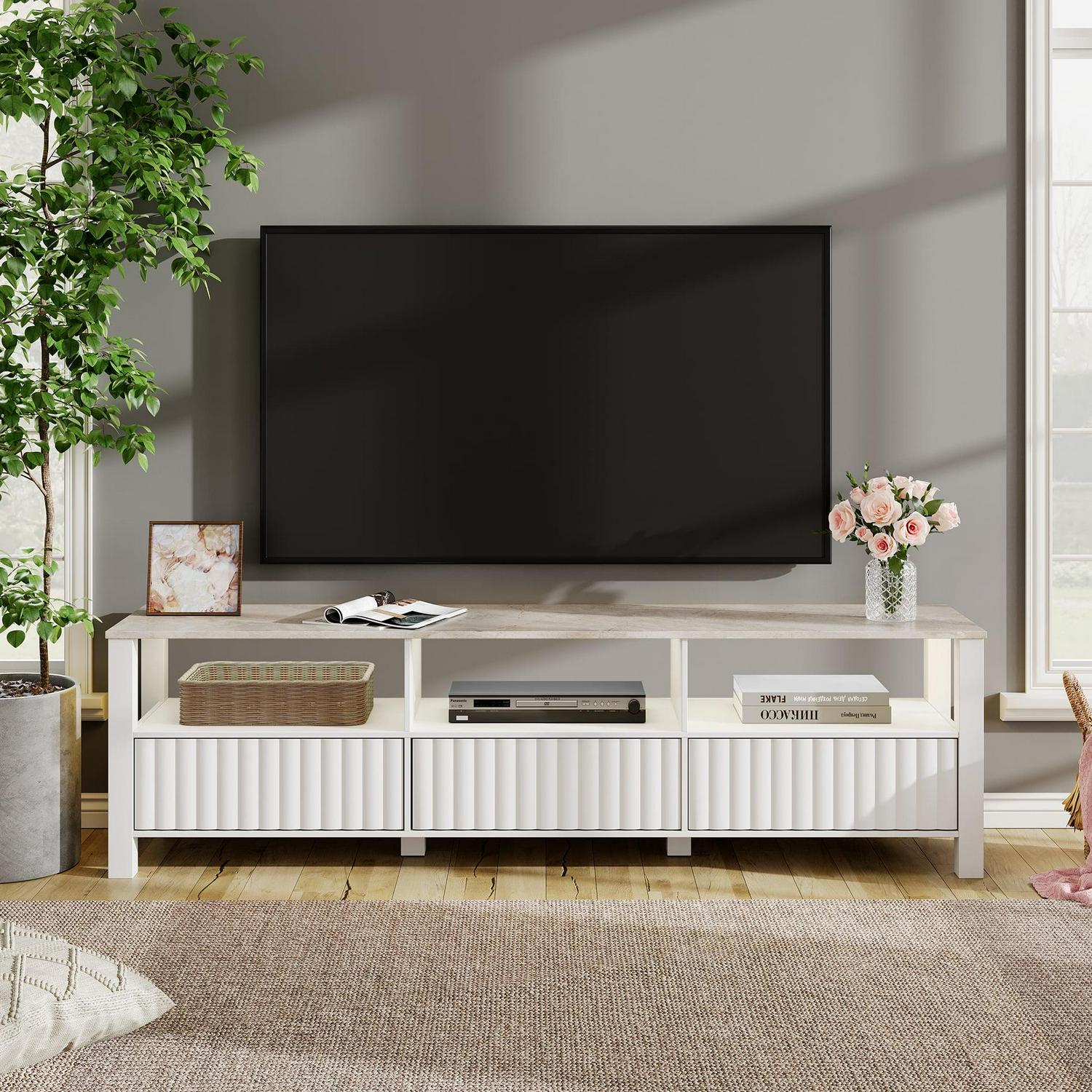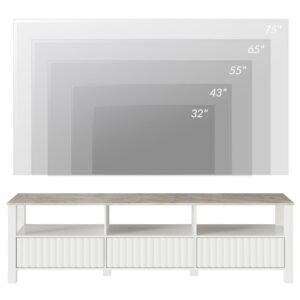 The white tv console comes LED light strip, creating amazing lighting effect and warm atmosphere to your room. Featuring custom stone pattern tabletop and handmade fluted wood door, the elegant led tv stand will be the most eye-catching piece of furniture in the room.Overall Dimension: 70 ×15.6 ×23.2 (L×W×H) .Designed with 3 open shelves and 3 storage cabinets offer ample storage space to you. And the cabinet door is equipped with hydraulic door closer for smoother and quieter user experience.Characterized by a wide tabletop, can accommodate TVs up to 75 inch.