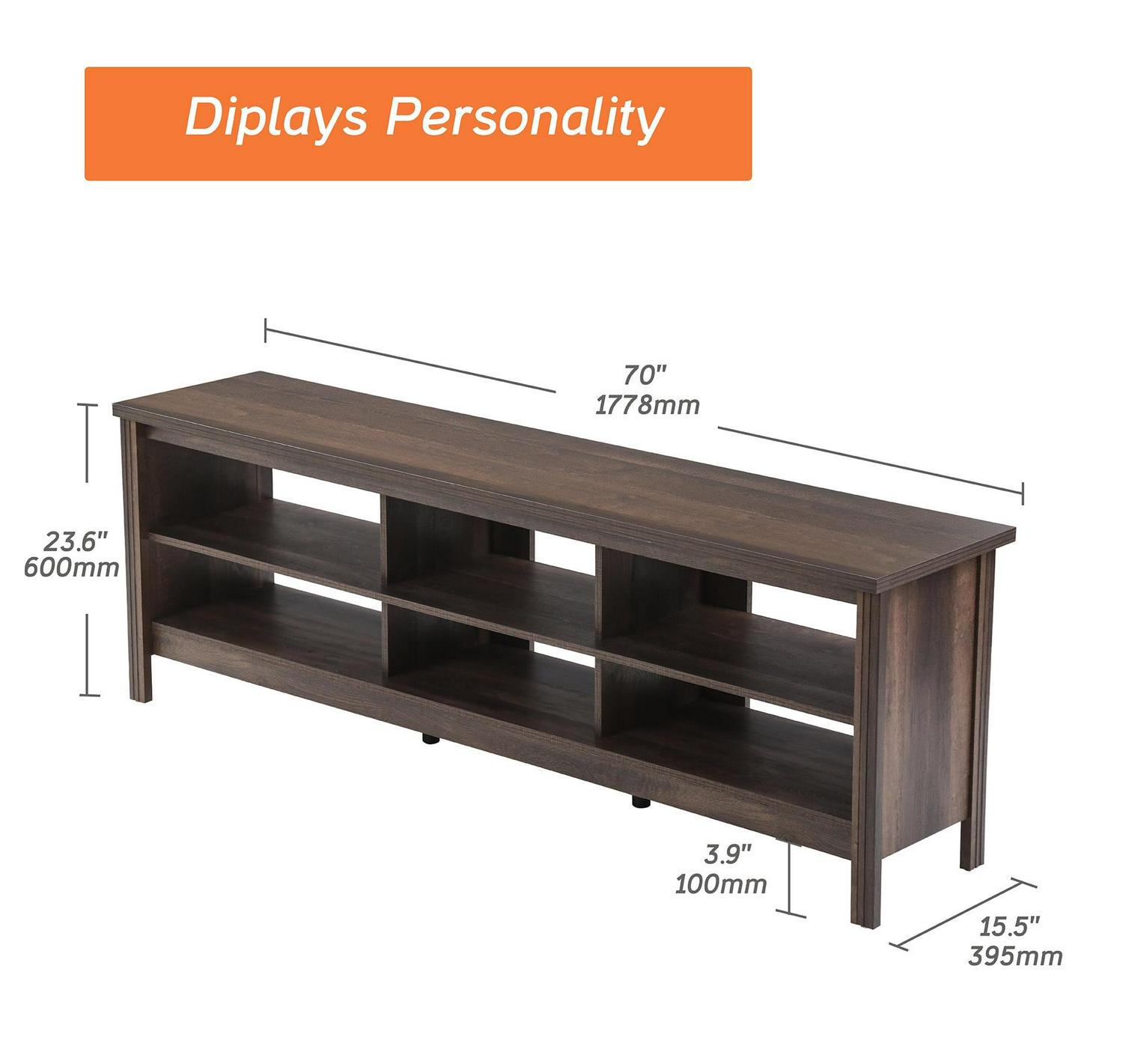 The espresso wood grain and simple lines on this tv stand make it look classic and elegant. It can be not only used as televison stands, also perfect for sofa table, entertainment center, media stand, storage console table, tv console etc. This TV stand is perfect for TVs up to 75 inch TV.6 open shelves with big capacity allow you to storage the books, magazines, CDs and any other media or gaming devices. The media console table made of high quality MDF which is durable and sturdy enough to be used for a long time. Plus, four wooden legs further enhance stability, preventing the TV stand from wobbling. Max load capacity: 260 lbs. The espresso entertainmen center for 75 inch tv with smooth surface is waterproof and easy to keep clean with a damp cloth. The tv table is 3.9 in high height off the ground which adequate for robot vacuum cleaner can passing freely. No more headaches from dust under the cabinet.