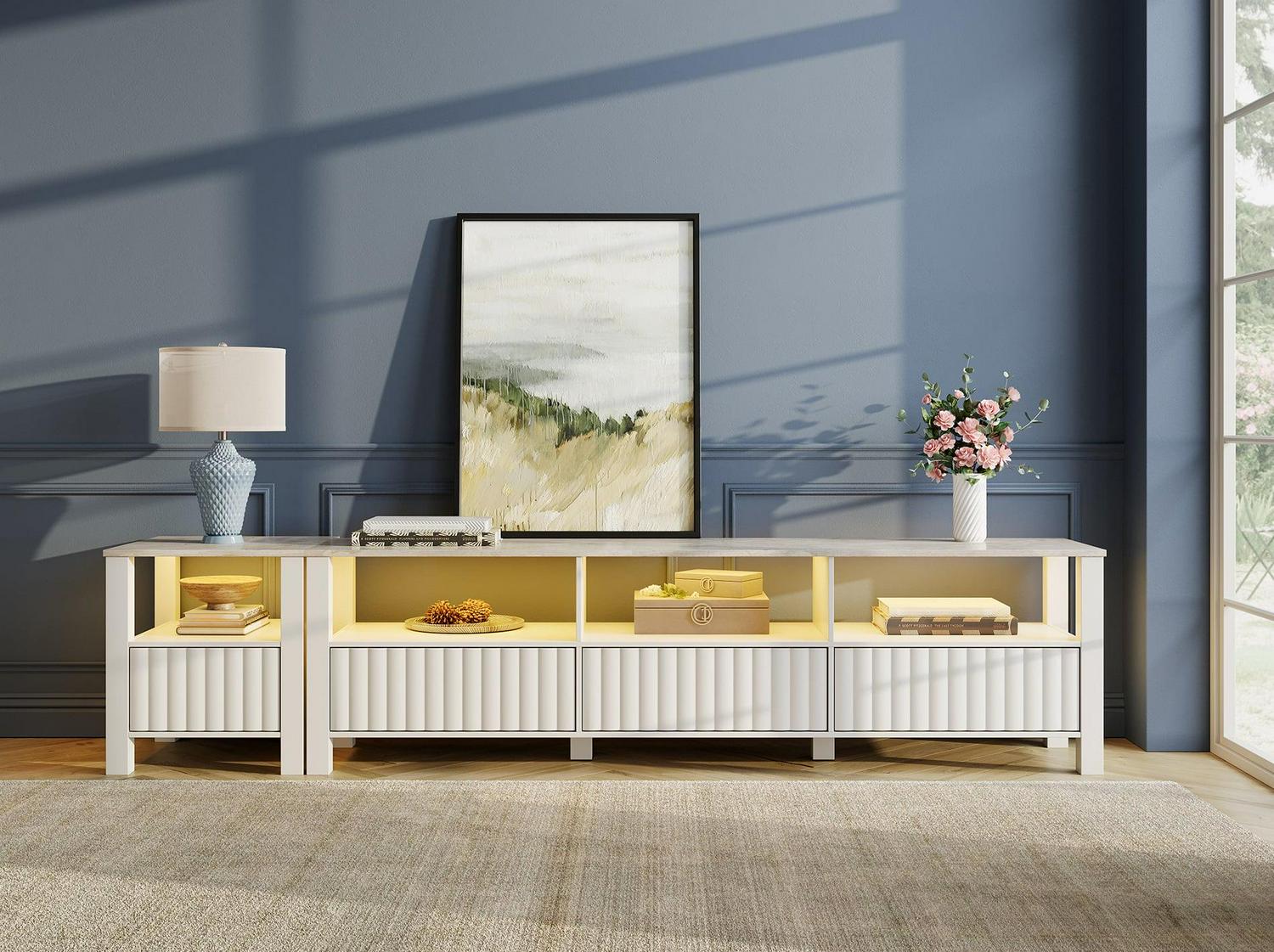 Note: The item is sent in two packages, so you may receive three packages at different timesFeaturing custom stone pattern tabletop and handmade fluted wood door, the elegant tv cabinet will be the most eye-catching piece of furniture in the room. Coming with a warm white LED light strip will create amazing lighting effect.The tv stand can be used together as a large tv stand for 85+ inch tv. And it also can be used separately as one 70 inch tv stand and one small side table suitable for living room, bedroom, lounge, office and many other places.Overall Dimension: 87.6 ×15.6 ×19.7 (L×W×H)