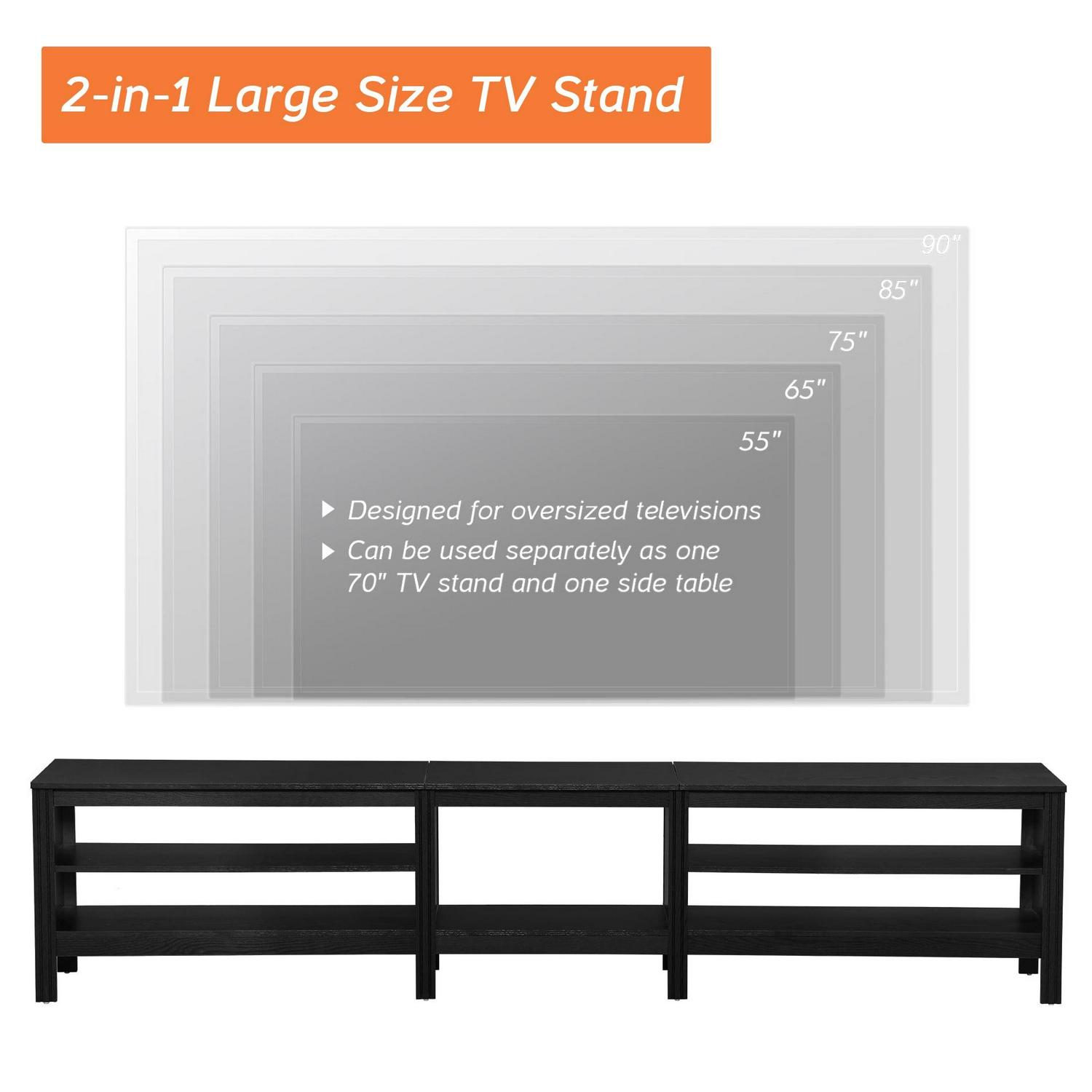 2-in-1 Large Size TV Stand Designed for 85+ inch TVs fits most 75 80 85 90 95 100 Inch TV screens.And it also can be used separately as 1 TV console which fit for 65 inch TV and 1end table .
