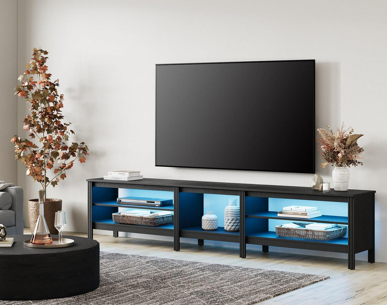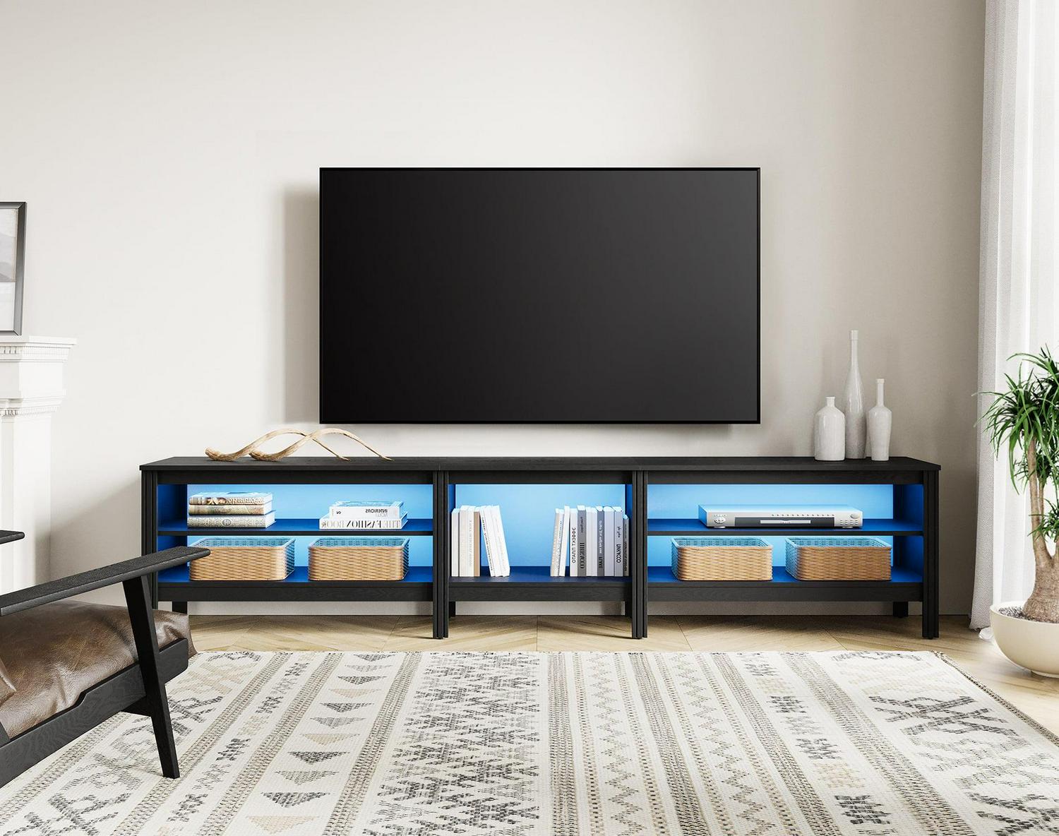 Note:This TV cabinet is sent in two packages,so you may receive them at different times.Designed with wide tabletop and 6 Storages to meet your storage requirements.Fits most 75 80 85 90 95 100 Inch TV screens.And it also can be used separately as 1 TV console which fit for 65 inch TV and 1end table .Dimensions: 82.6″ L x 15.6 W x 23.6” H. Weight limit of top board is 270 lbs.