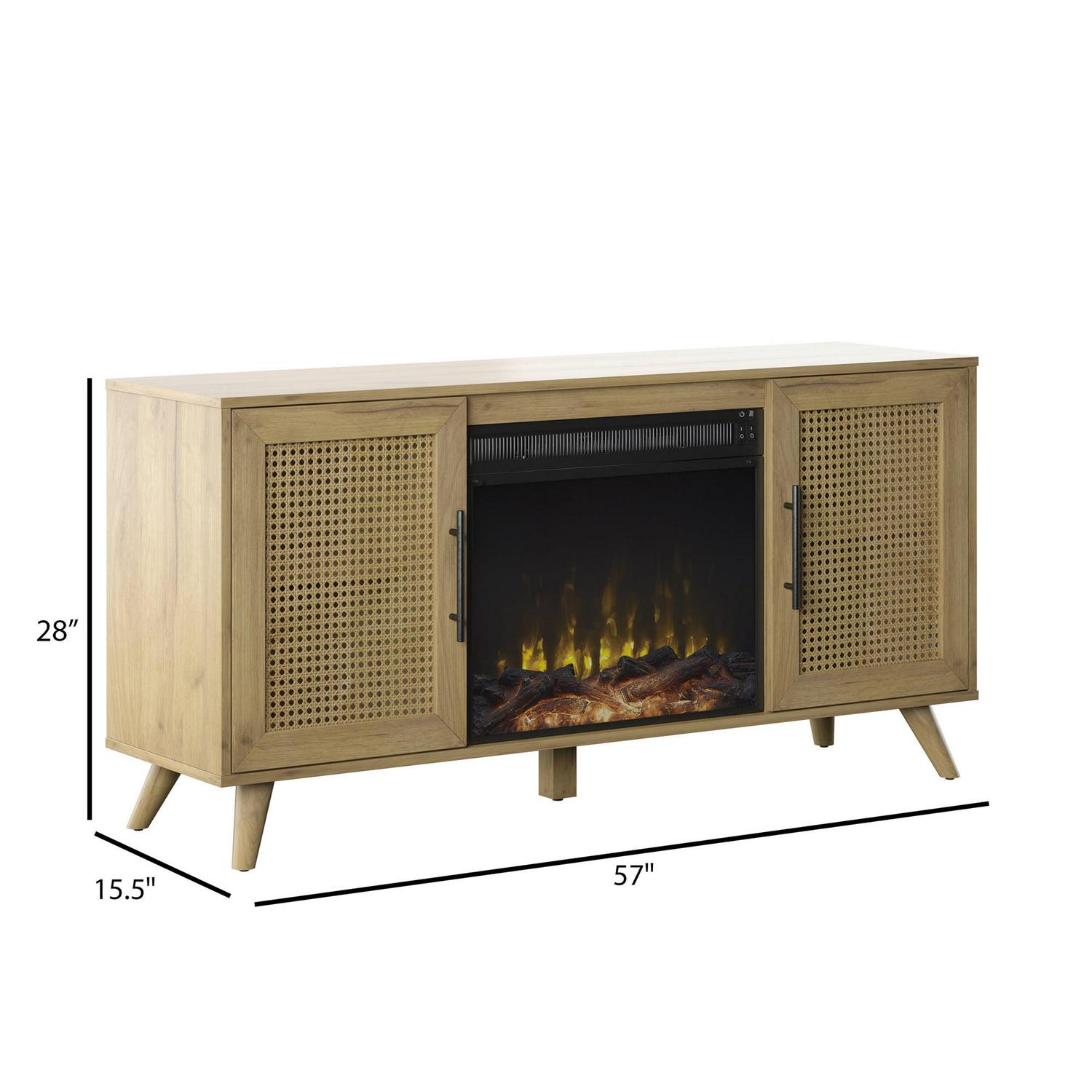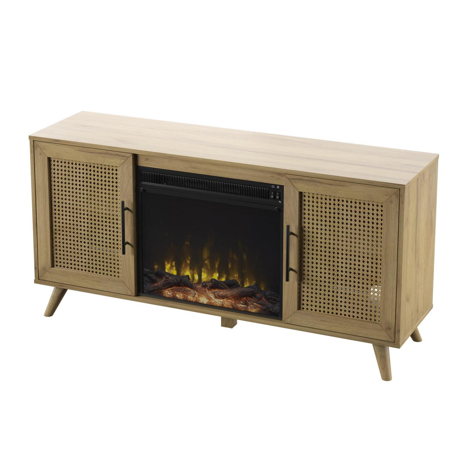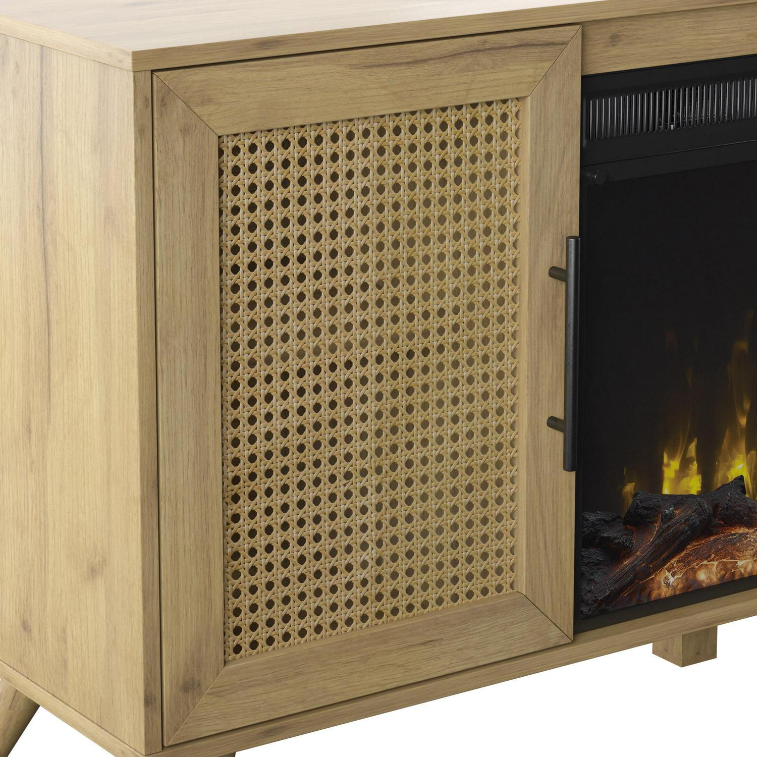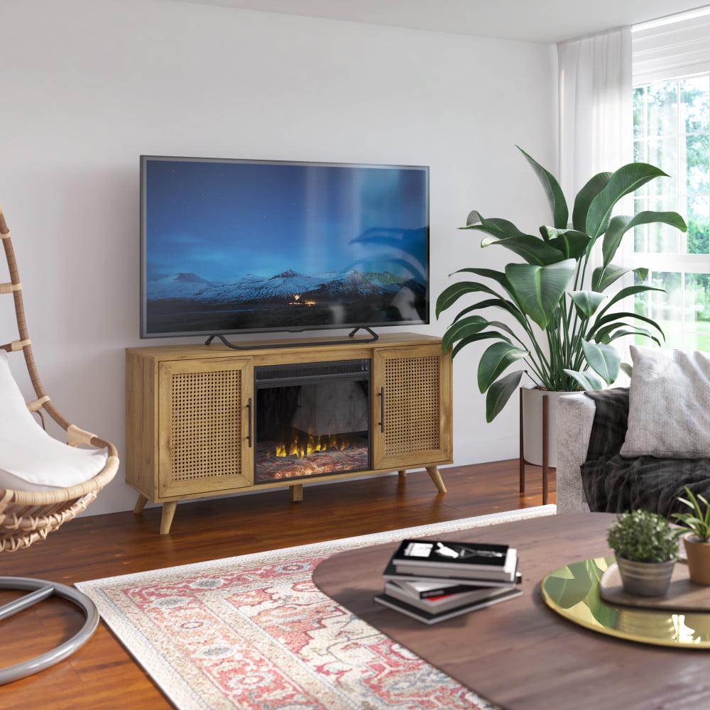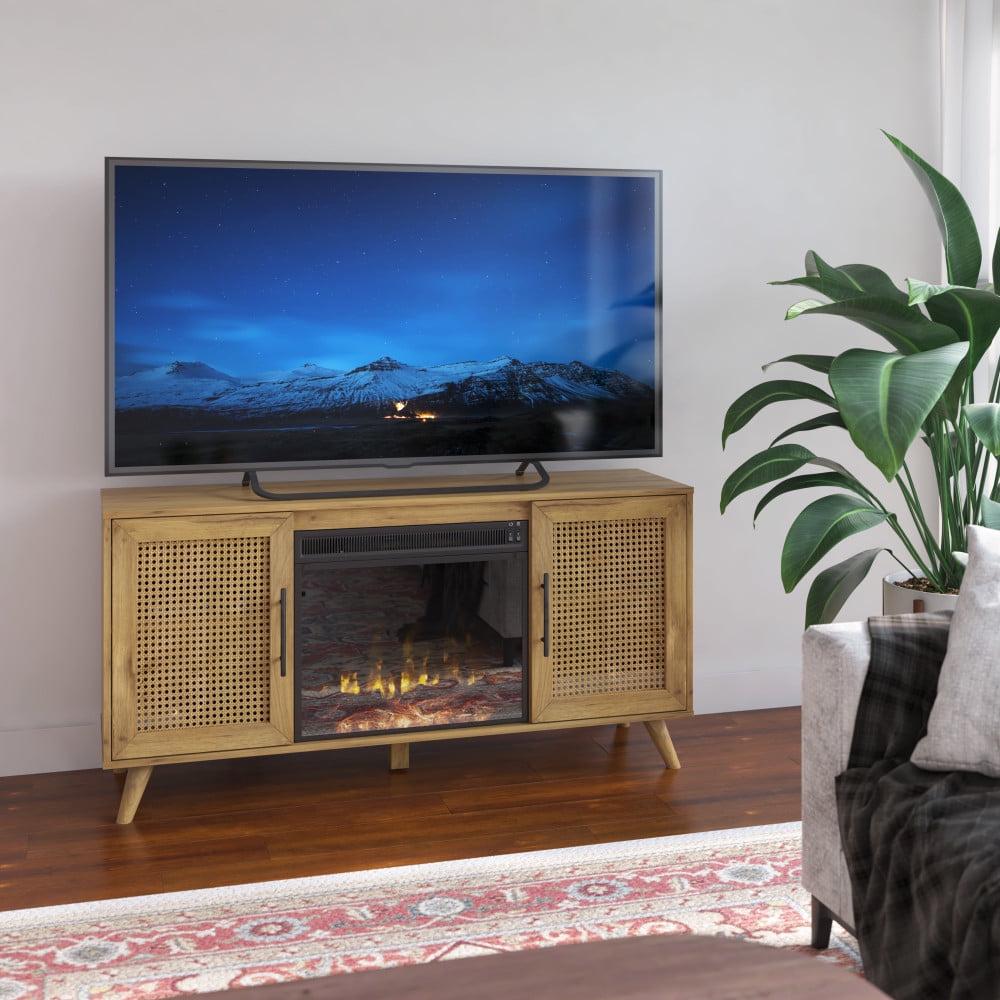 Give your home a stylish upgrade with this mid-century modern TV stand and electric fireplace. Designed to securely hold most TVs up to 60 inches and 50 pounds, this TV stand is ready for all your movie nights and TV binge-worthy sessions. Snuggle up to your favorite shows while flames provide warmth for a cozy night in. The flame effect works with or without heat, so you can have the ambiance of a gentle fire any time of year. Best of all, you can customize the look of your electric fireplace with either contemporary fire crystals or a realistic log set with ember bed both are included! With woven cane door panels and helpful cutouts in the back for all your cables, this boho-inspired TV stand blends both function and fashion in one piece.