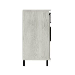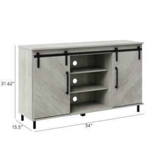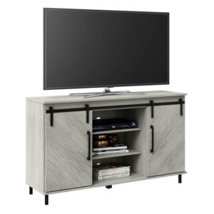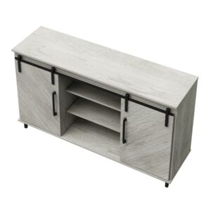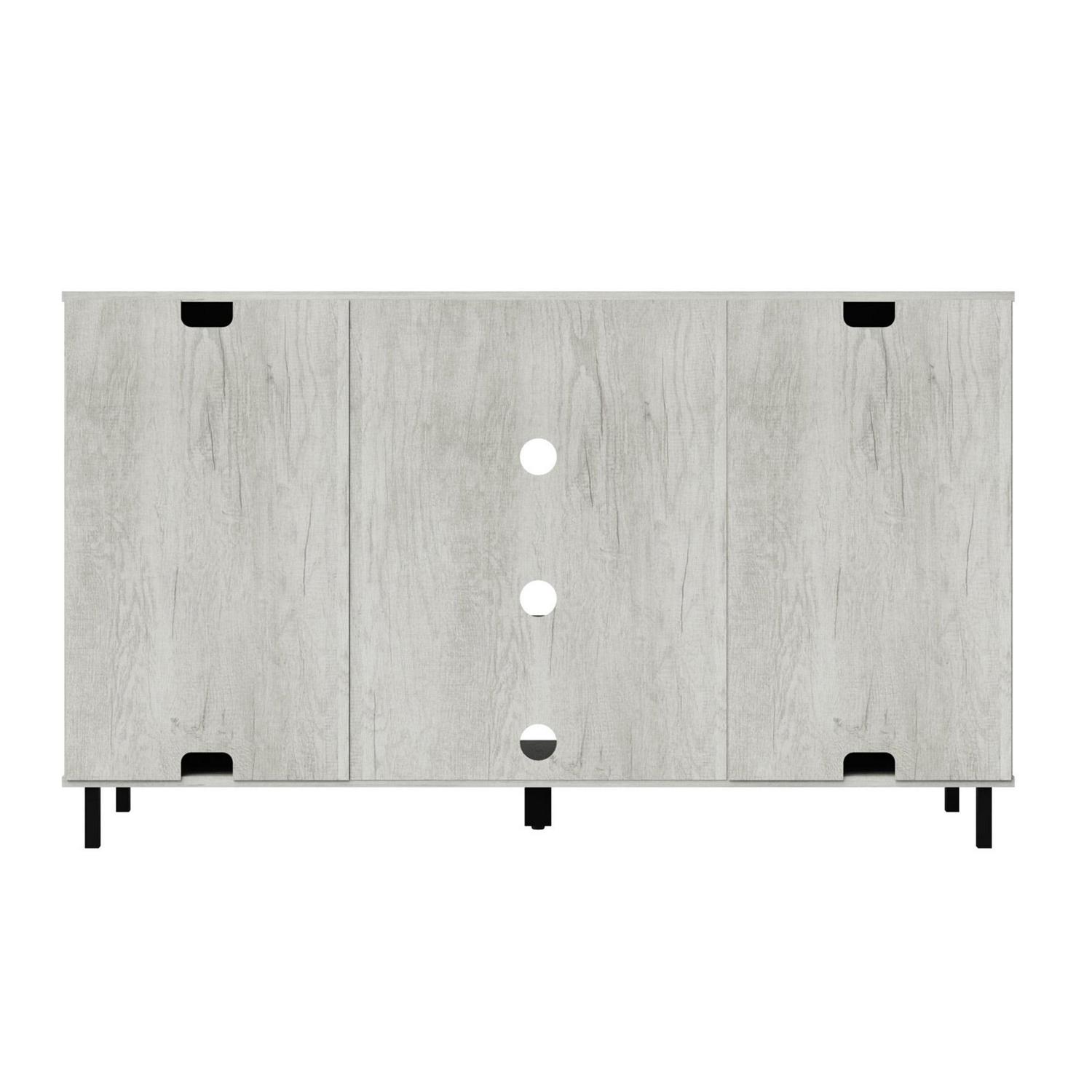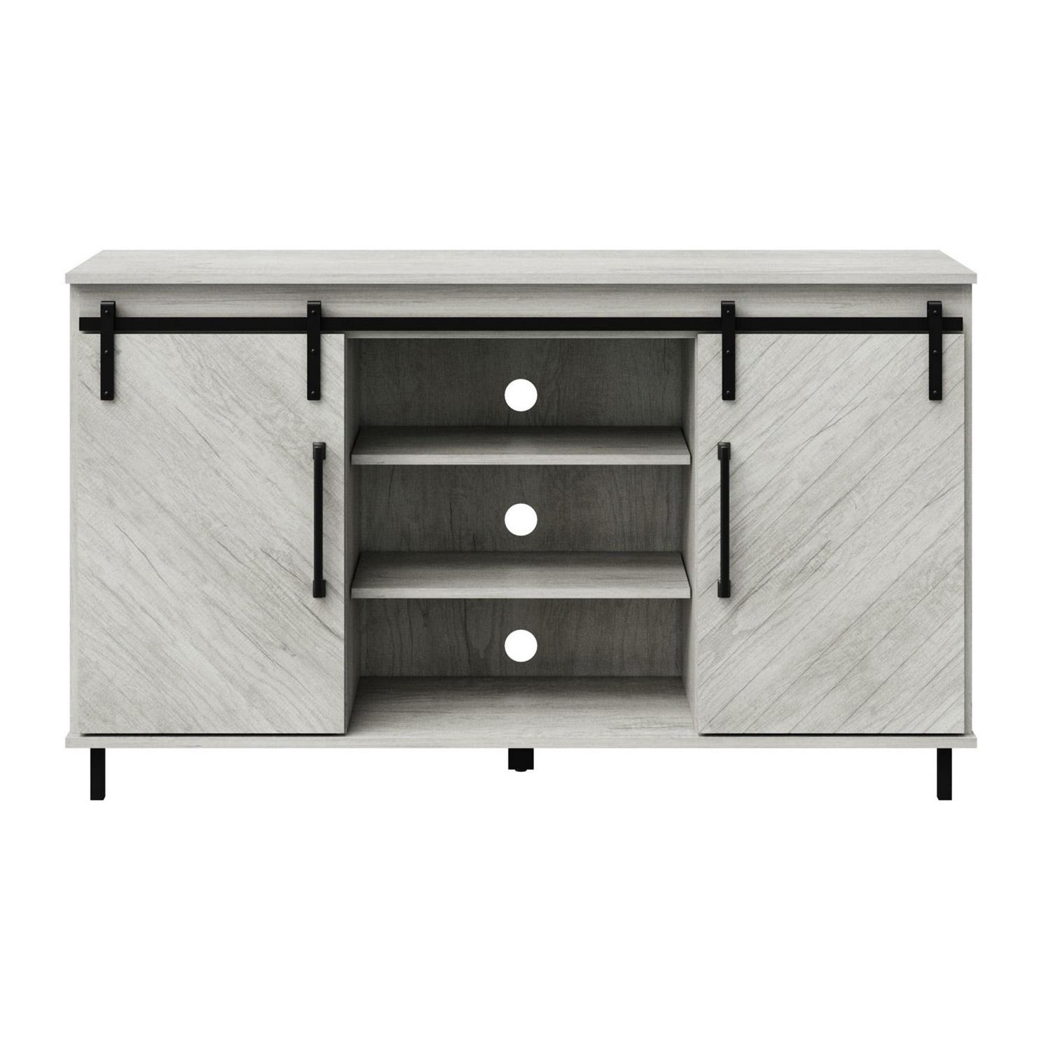 Get a more modern farmhouse look for your living room with this TV stand that offers style and function while accommodating your flat screen TV of up to 60″ inches and 50 pounds. The doors smoothly glide along with metal rail hardware and feature matching black metal handles and feet. Storage options include the center compartment with two adjustable shelves and two side storage cabinets with one adjustable shelf within each. Openings in the back panel of the TV stand allow cords from electronics to pass through and control tangles.