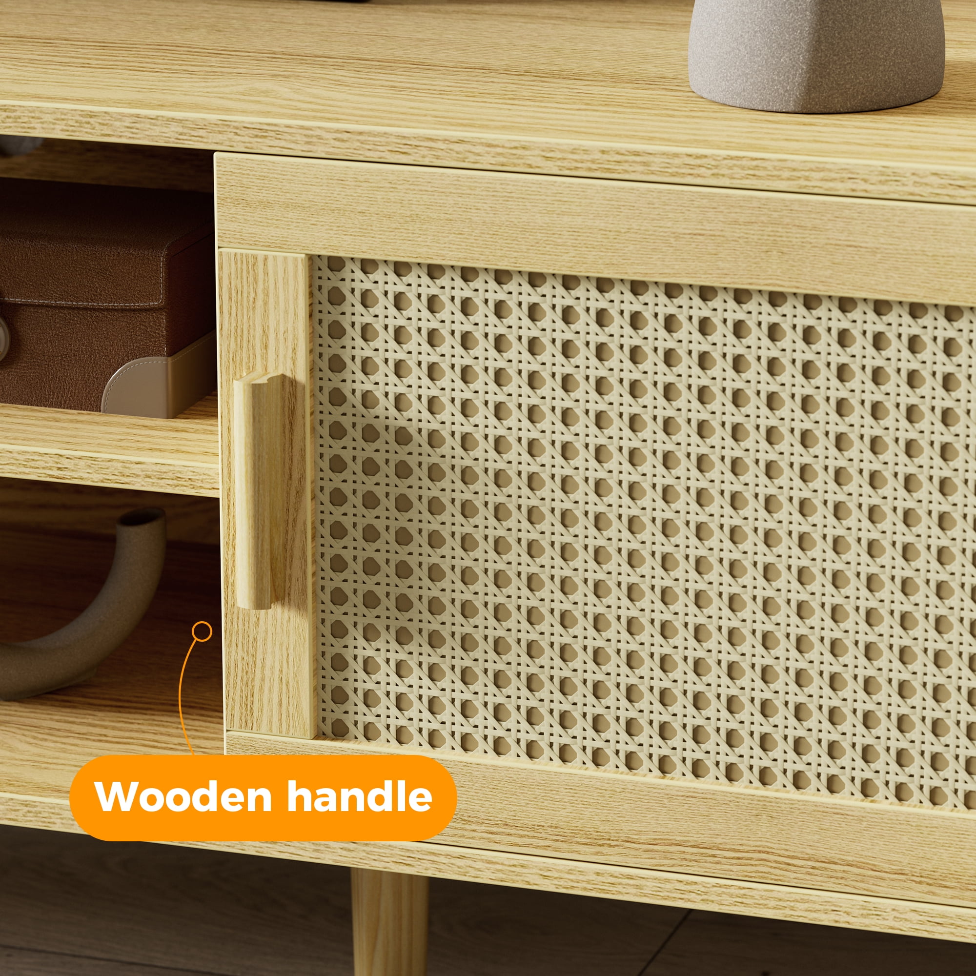 TV Stand Modern TV Console for TVs up to 60″, Media Console Table Entertainment Center with PE Rattan and Open Shelf, for Bedroom Living Room