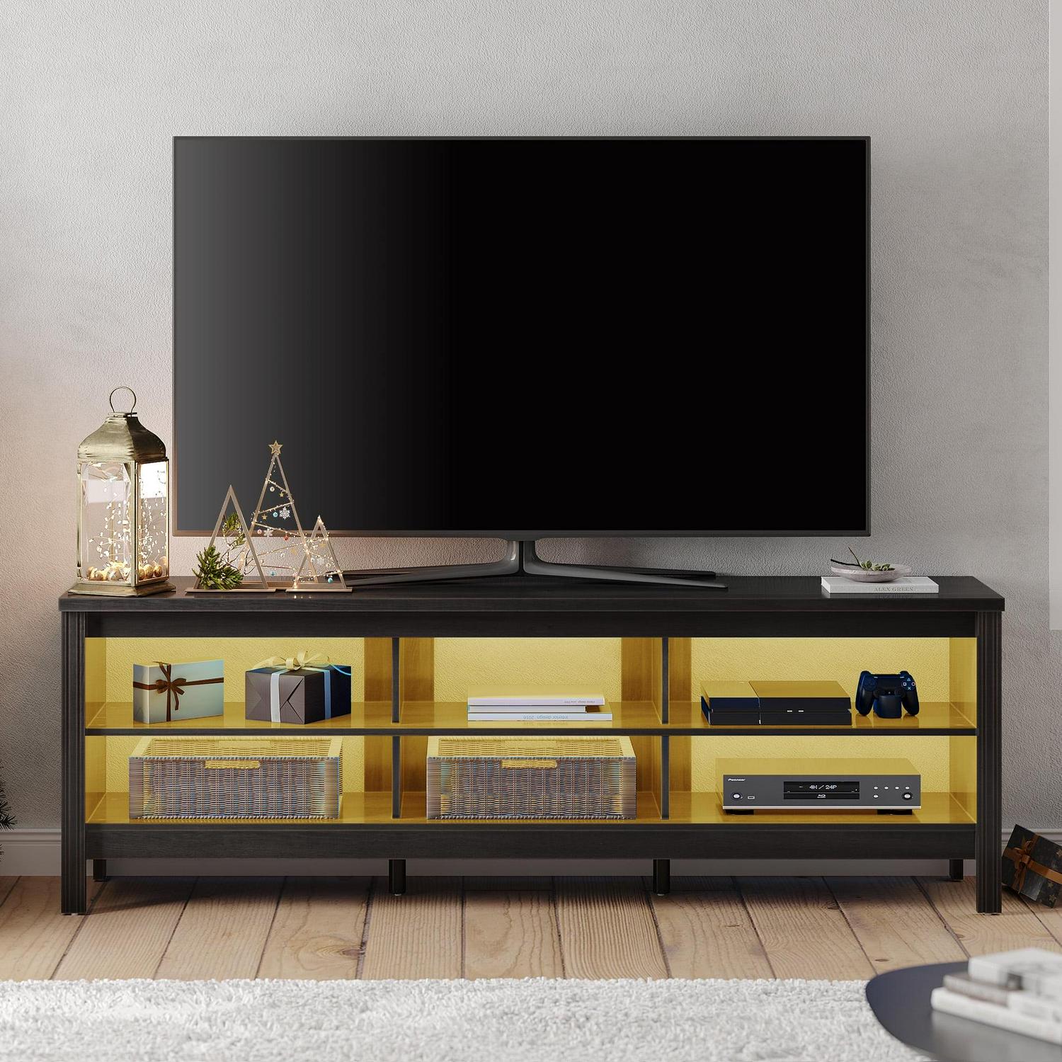 TV Stand with Warm White LED Lights and Open Storage Shelves for 75 Inch TV, Black