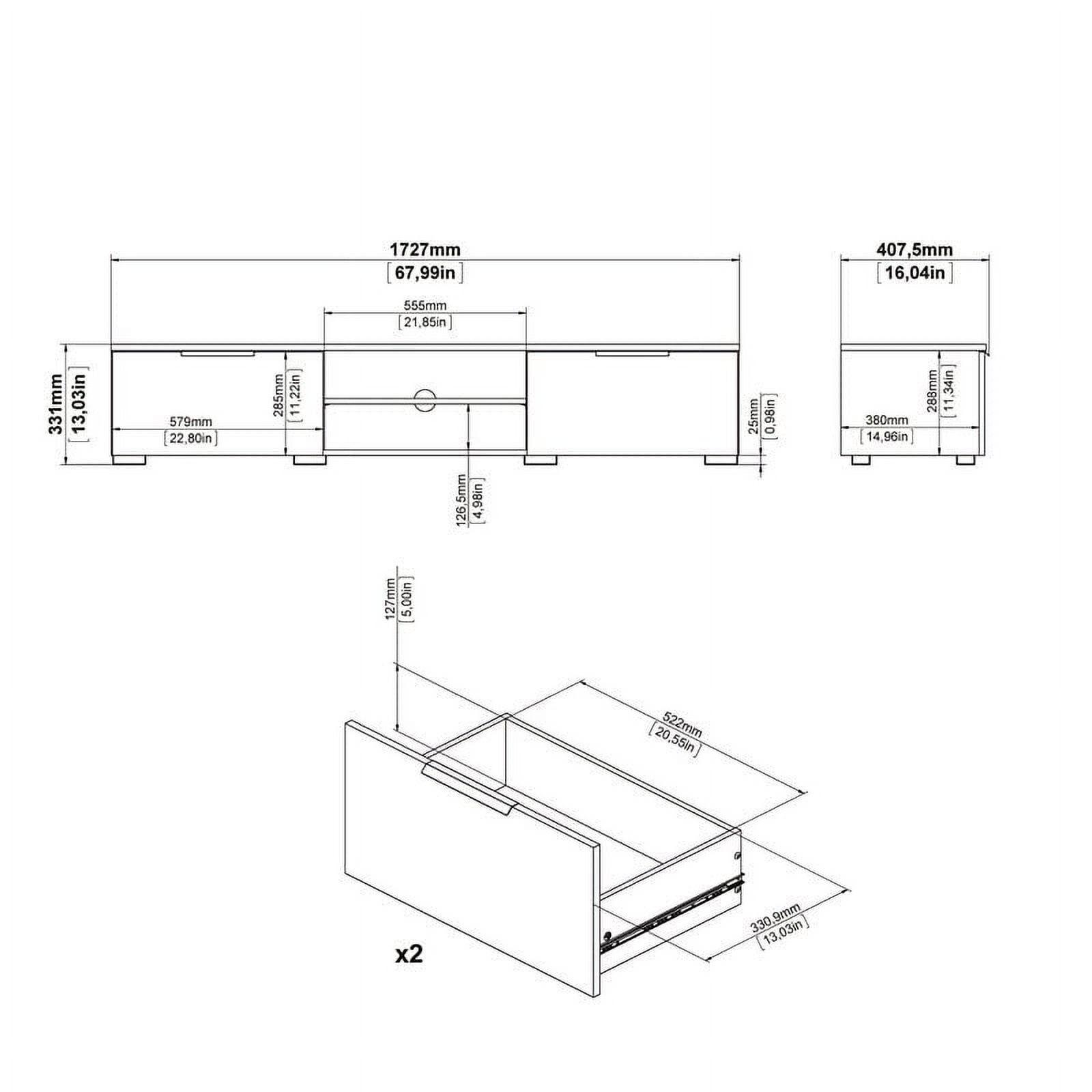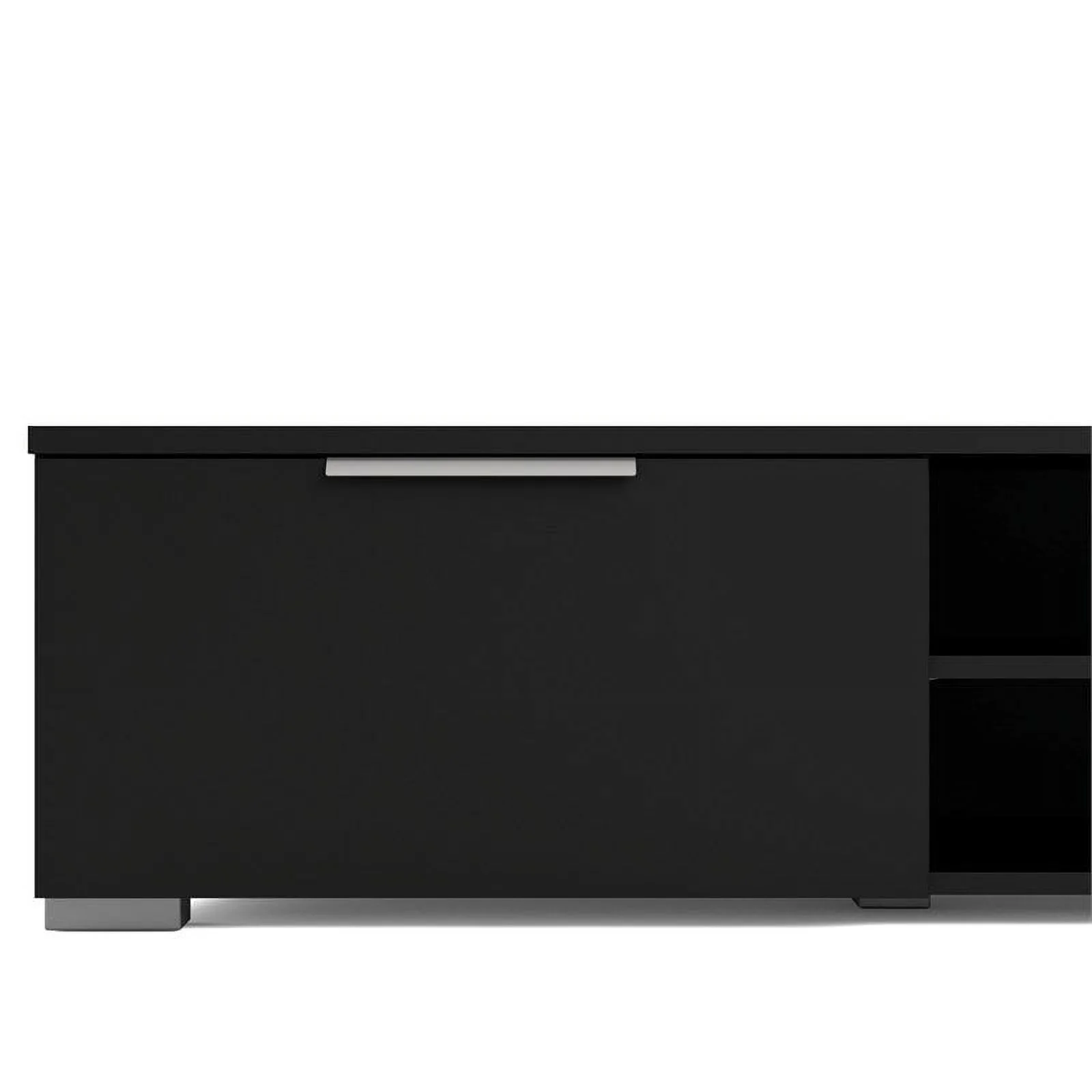 The Tvilum Match 2 Drawer 2 Shelf TV Stand in Black Matte color, steals the show with a low-profile design that can handle up to a 100 lb. TV and all your entertainment gear. Sleek storage includes two open media compartments for streaming devices and gaming consoles, two spacious drawers with minimalist metal handles, drawer runners and wire management to keep cords neatly out of view. The foil surface is fade resistant and easy to clean. All in a Danish modern style that blend seamlessly with any decorating style.