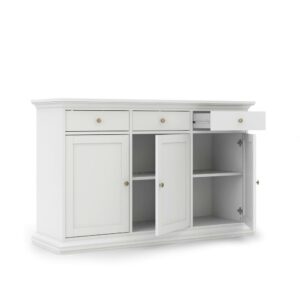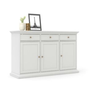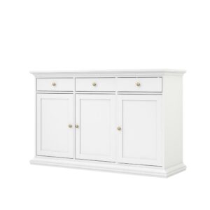 The Tvilum Maison Park Dining Sideboard gives you the practical elegance of a proper sideboard on a design that won’t overpower your space. This roomy table is crafted from engineered wood with an exterior of white, fade-resistant laminate. Across the top you have three drawers that are ideal for storing flatware, linens, and other utensils. Down below you’ll find a trio of framed doors that open on full-extension hinges. The deep interior is fitted with adjustable shelves so you can easily store plates and serving pieces.