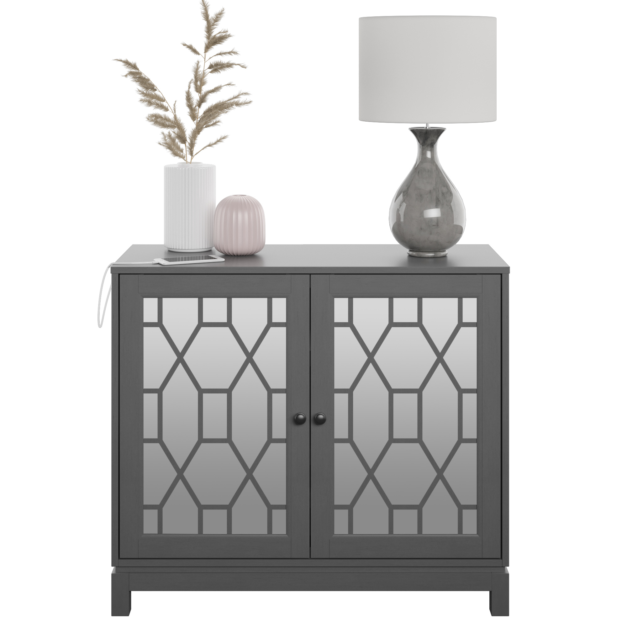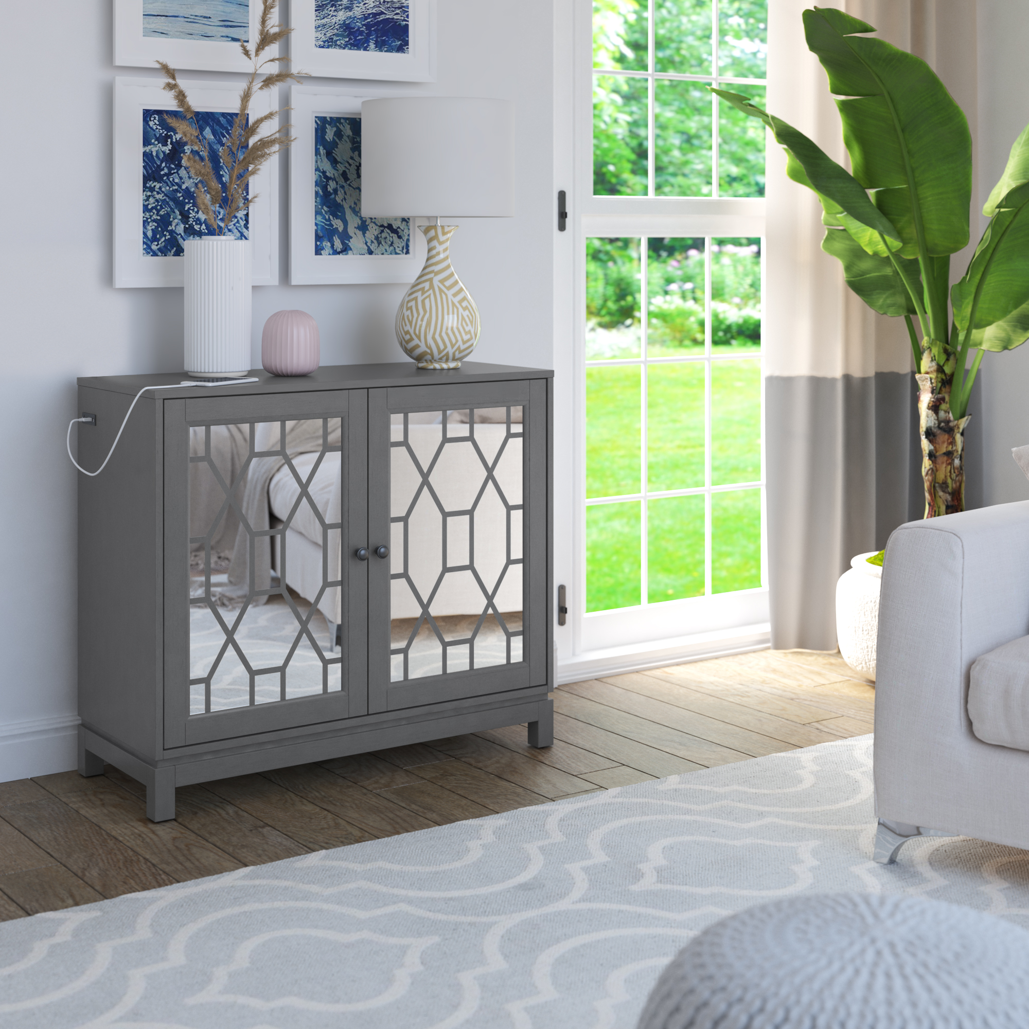 Mirrored doors with decorative pattern add a glam style to your space Spacious cabinet holds all sorts of items, like extra glasses and dishes for your kitchen Cabinet comes with an adjustable shelf, perfect for customizable storage Two USB ports help you charge your devices with ease Love the look? Consider getting the matching sideboard from this collection Simple assembly and easy-to-follow instructions included Tip-restraint hardware included