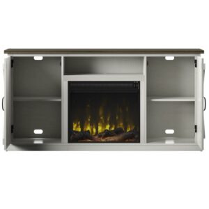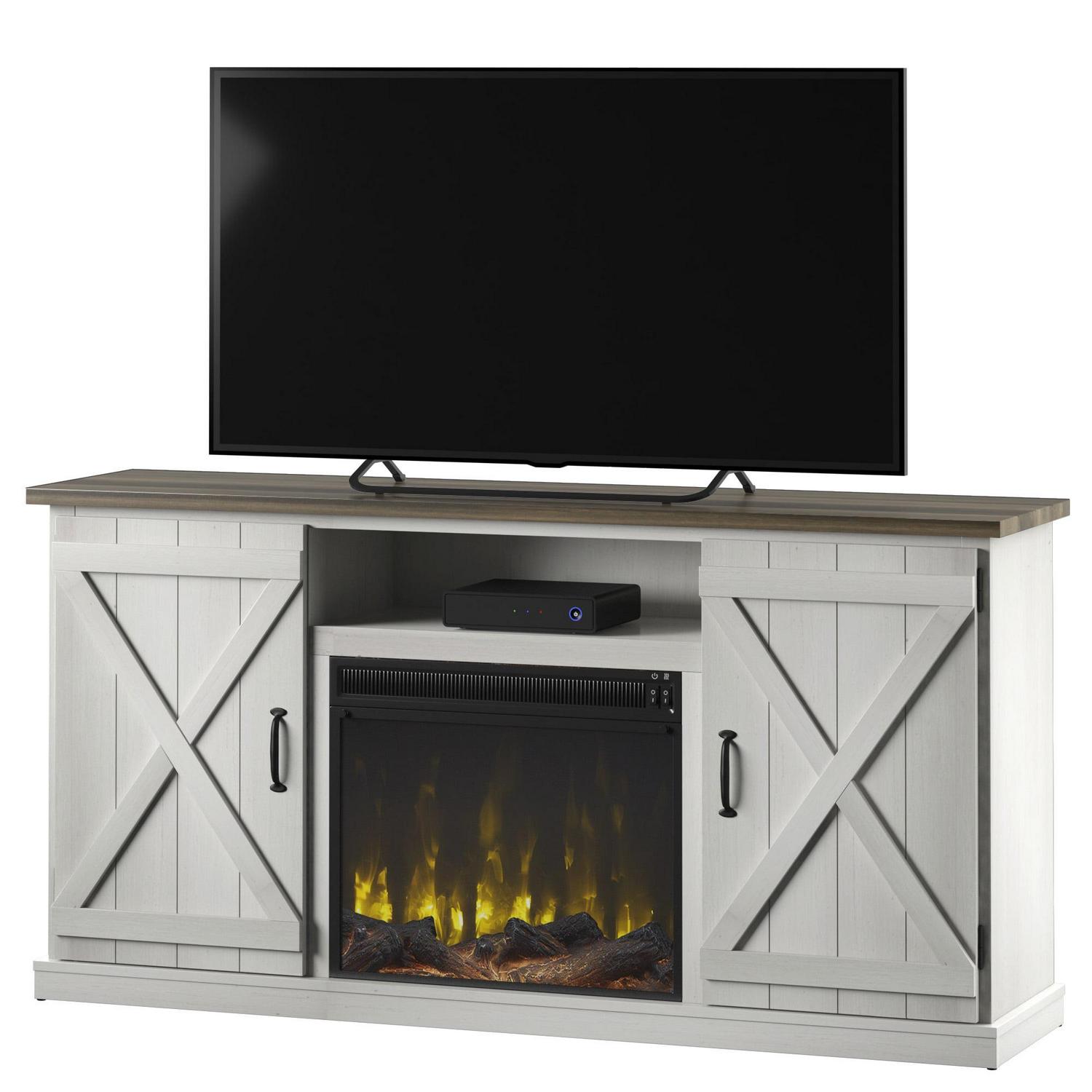 With this electric fireplace and TV stand combination, you can enjoy a stylish, modern farmhouse design during your family movie nights. An open media shelf holds your cable box, gaming console, or other AV components while side cabinets with adjustable shelves provide storage for your movie collection and electronic accessories. The cabinets and TV stand top feature a plank design with decorative saw cut X mullions on the doors for added rustic flair. For even more ambiance, use the electric fireplace to create a cozy atmosphere while warming up to 400 square feet of your home. The flame effects can be used with or without heat for the look of a gentle rolling fire all year long, even during warmer months. Choose between included contemporary fire crystals or a realistic log set with an ember bed to showcase the beautiful flames – both are included!