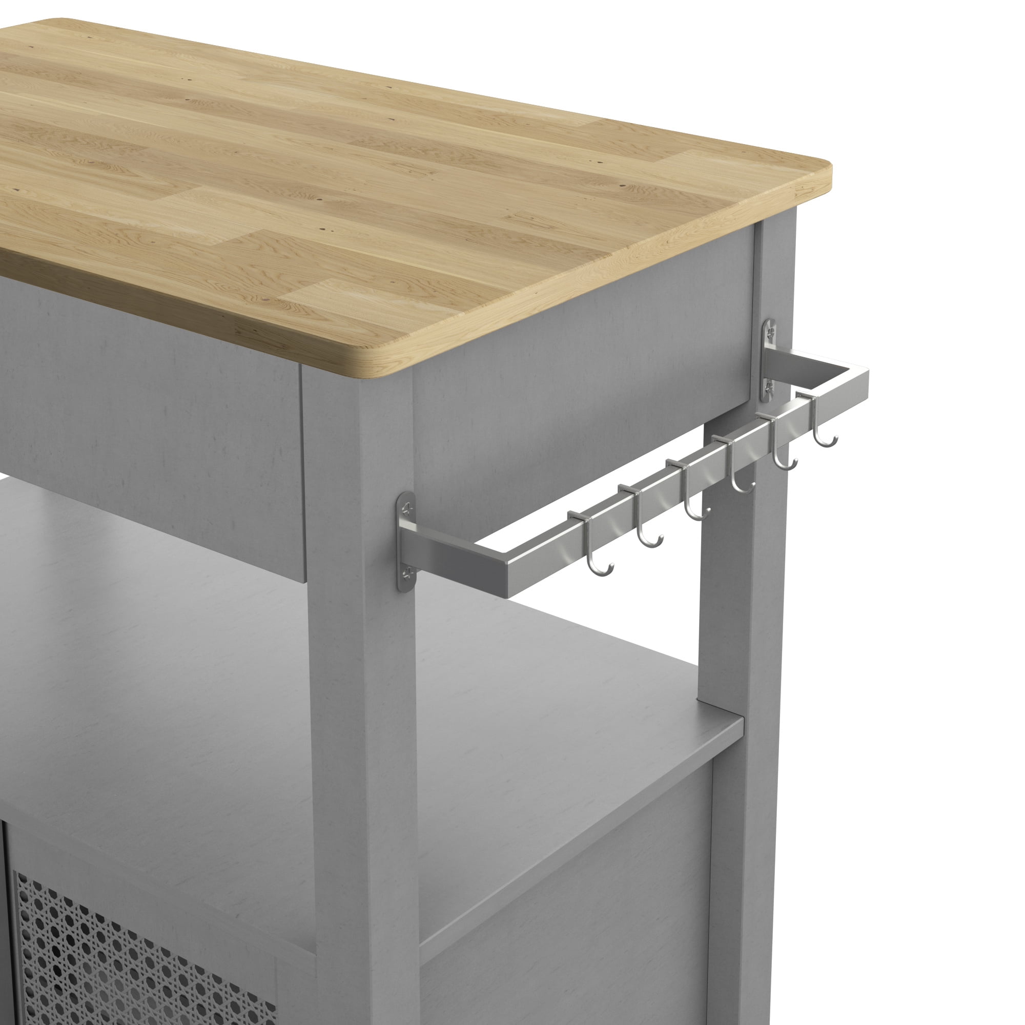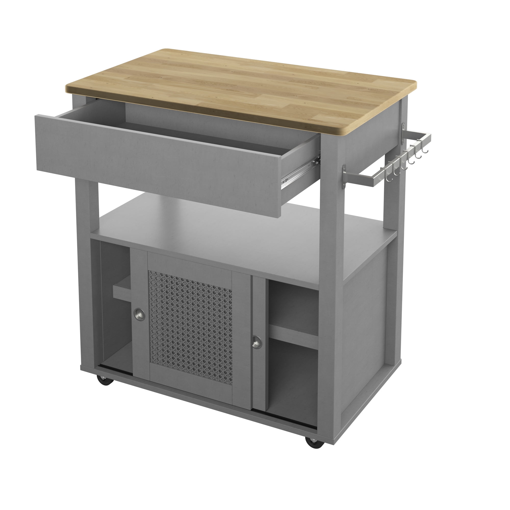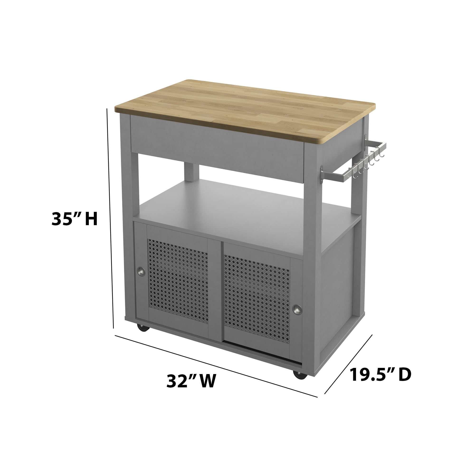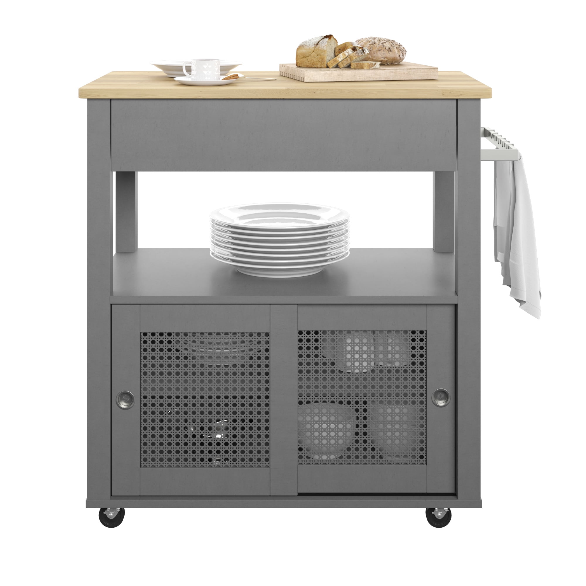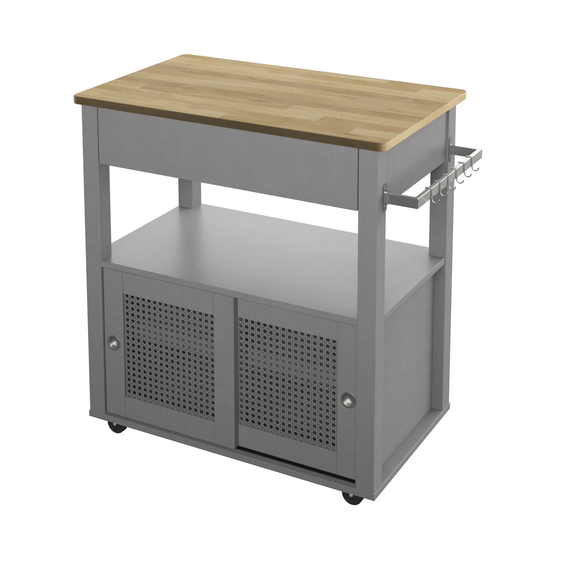 Add ease to your kitchen prep with this handy kitchen cart The boho sliding doors add a stylish look to any kitchen or dining room Wheels and locking casters provide easy positioning and security A convenient towel bar with six removable hooks is attached to help make clean up simple and quick Smooth butcher block top is easy to clean and provides plenty of space for bread or appetizers for your guests Easy-to-follow instructions included Simple assembly with just a Phillips head screwdriver
