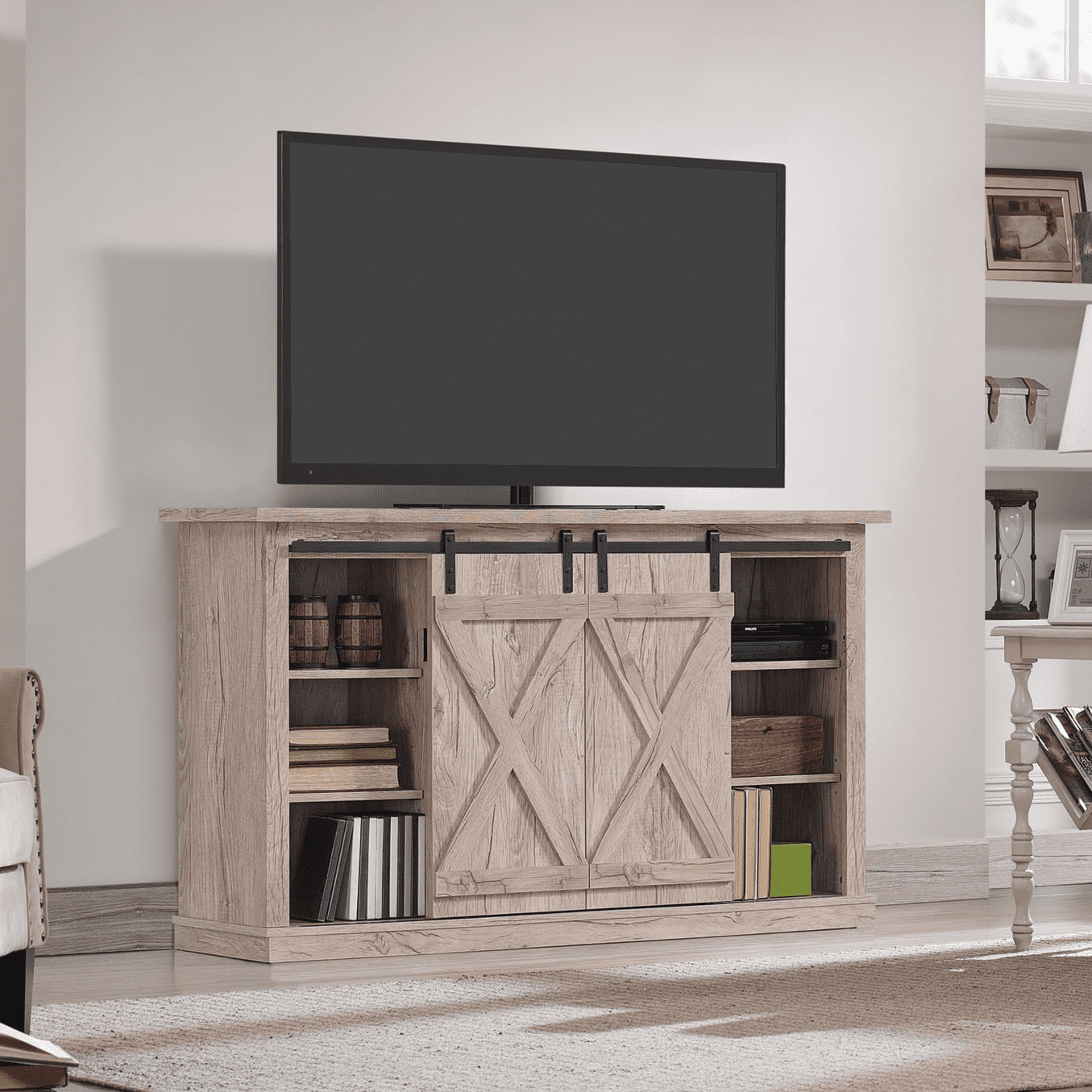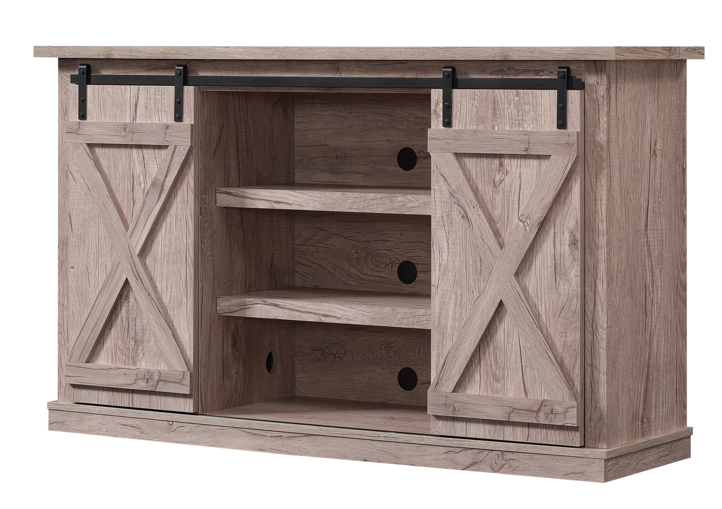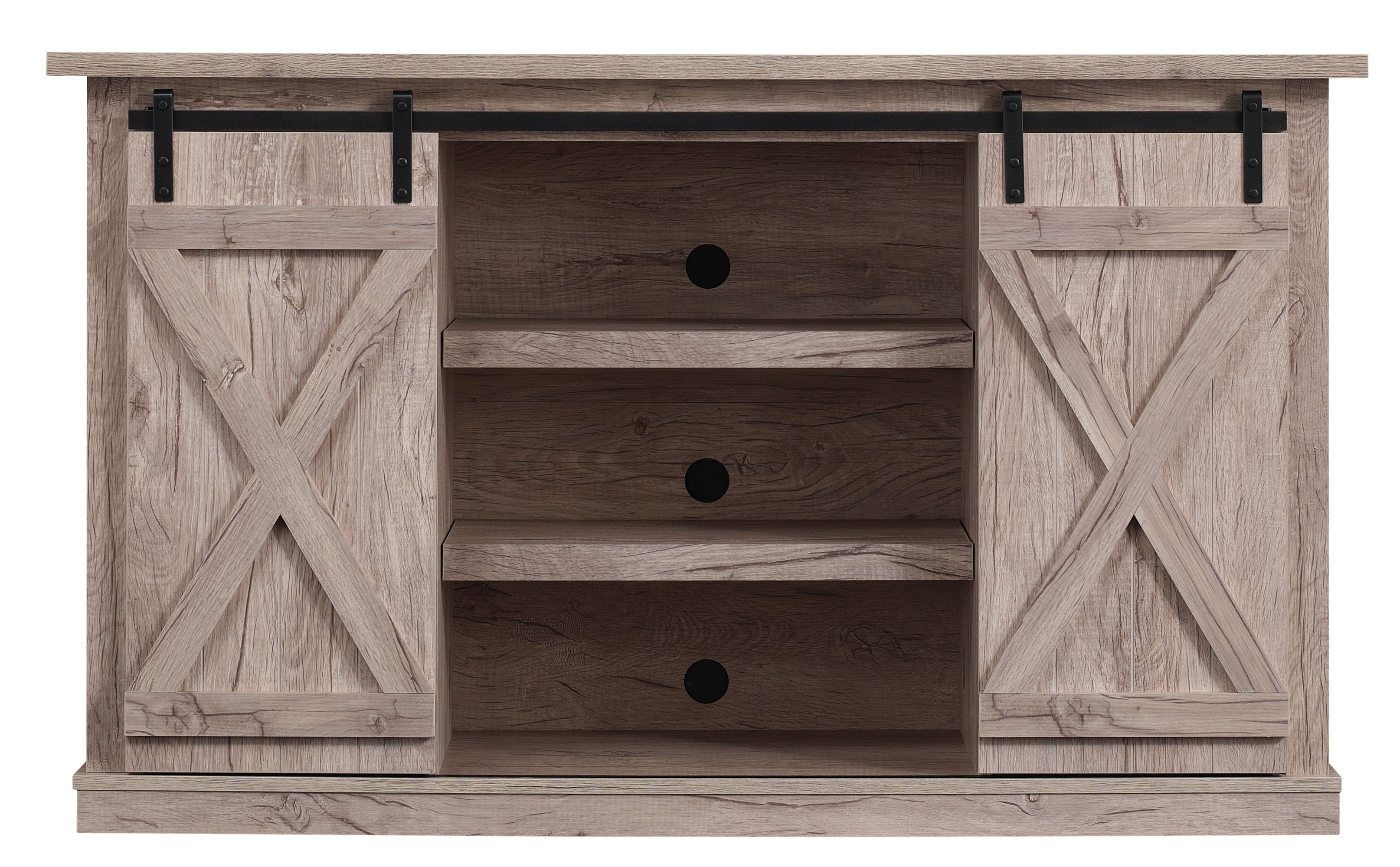 Enjoy modern farmhouse charm with this TV stand for flat screen TVs up to 60 inches and 50 pounds. Its unique saw cut style and innovative sliding barn doors will help you create a look everyone will love. Those unique doors conceal two side cabinets, each with two adjustable shelves for ample storage space. The open center shelf area also has two adjustable shelves, making more than enough room for gaming consoles, media components, and accent pieces you love to show off. Back panel cutouts help control wire tangles and provide ventilation for cooling components.