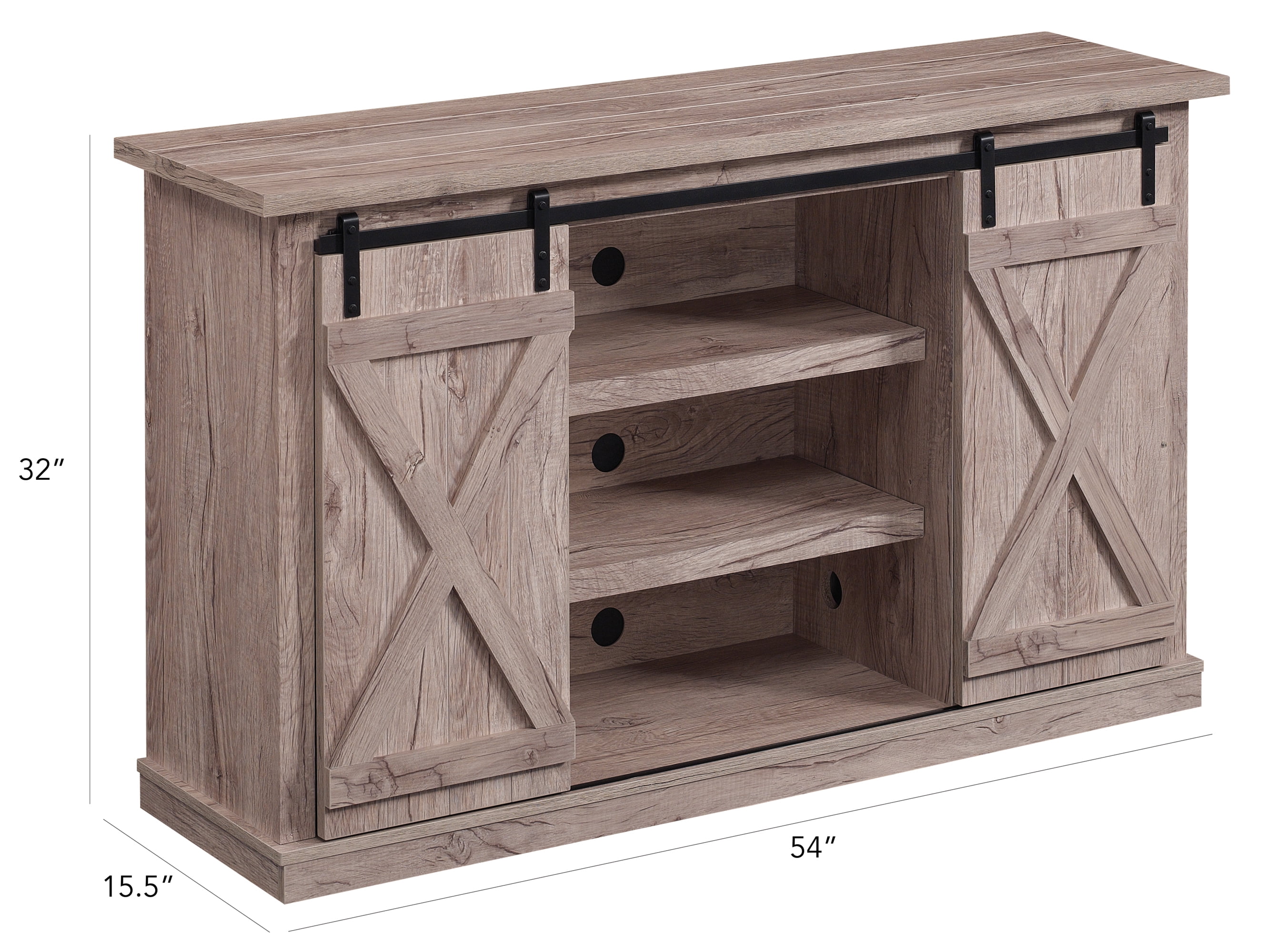 Accommodates most flat screen TVs up to 60″ and up to 50 lbs. Product Dimensions: 54.0″ W x 15.5″ D x 32.0″ H Shipping Box Dimensions: 58.75″ W x 18.1″ D x 11.4″ H Barn style doors glide along metal rail hardware for easy access to center shelves as well as side storage cabinets for storing gaming systems, cable boxes and other AV components Multipurpose piece that can be used in your living room, bedroom, or anywhere you need more storage Two adjustable center shelves and two adjustable shelves within each side cabinet Planked top for added rustic charm Back panel cutouts allow routing for electronic cords and prevent tangled wires