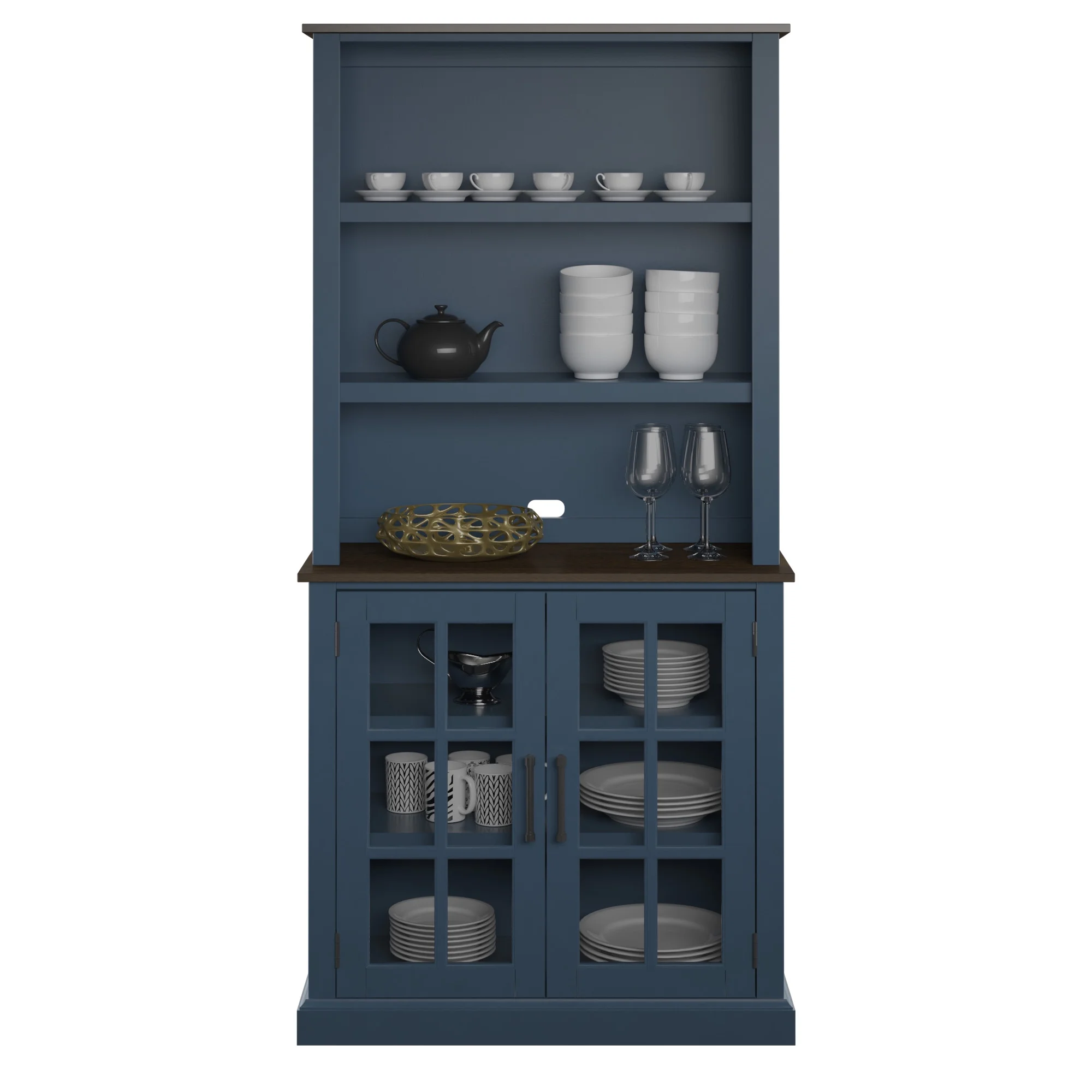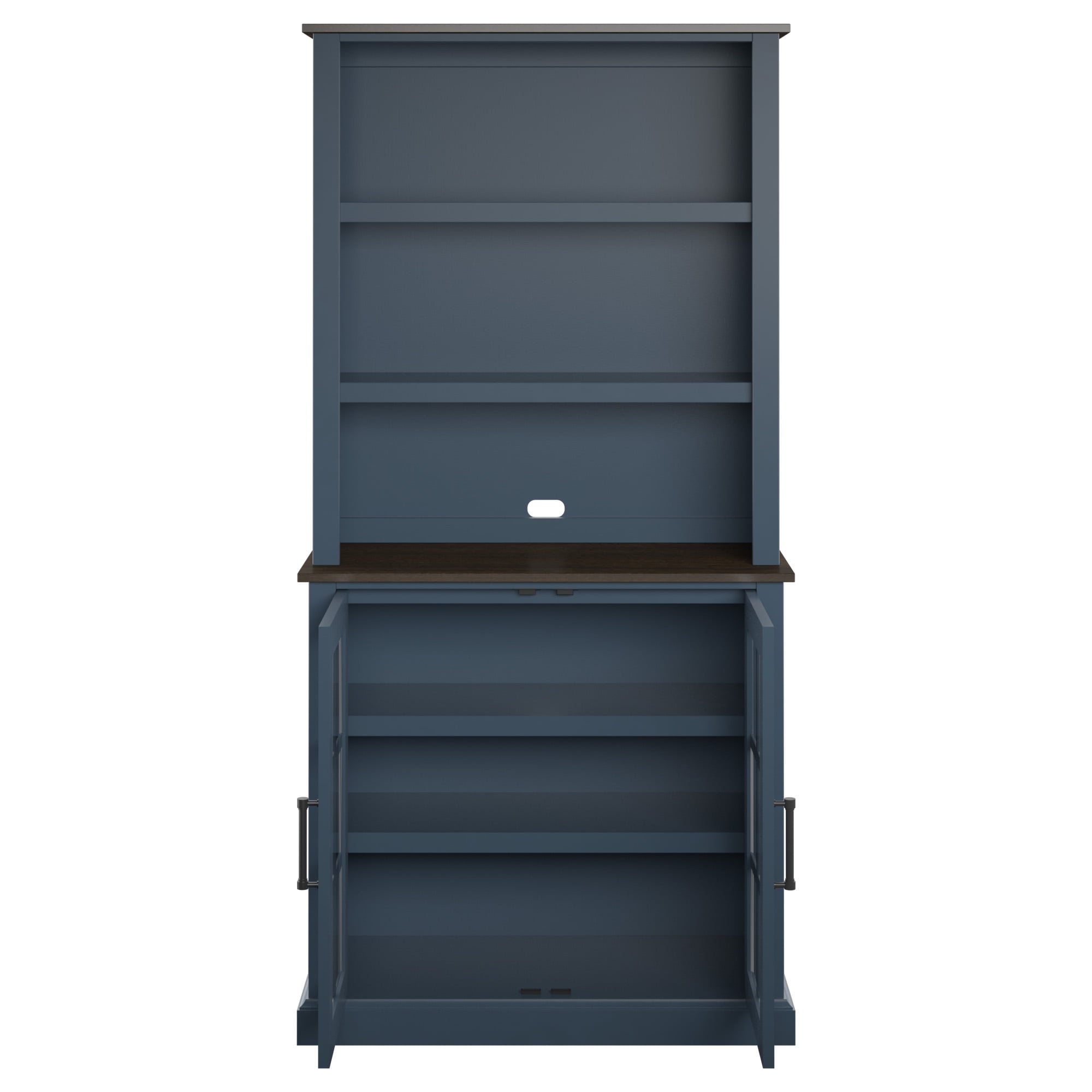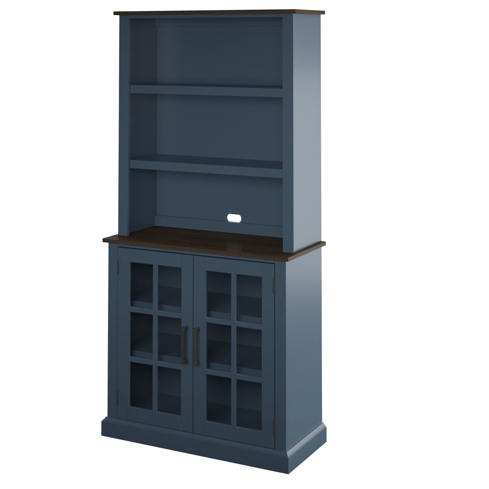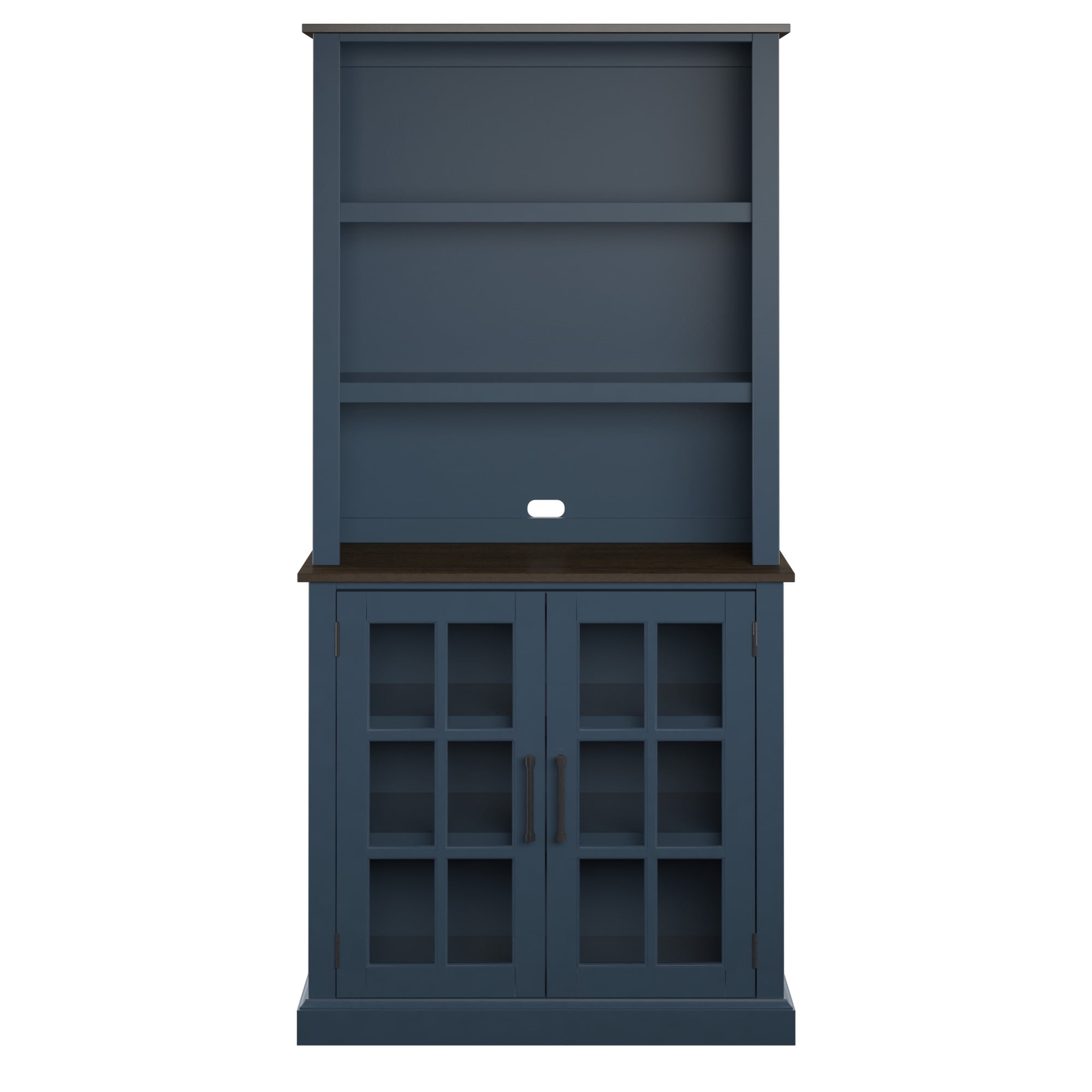 Lower storage cabinet features glass doors, perfect for enhancing a traditional look Spacious cabinet holds all sorts of items, such as flatware, placemats, napkins, and more The two shelves above the cabinet can be adjusted to different heights Upper shelves are perfect for displaying china plates, seasonal décor, and more Open counter offers a helpful space for serving appetizers, desserts, or coffee Hinges on cabinet doors are hidden when closed for a sleek, no-show look Tip restraint hardware included Twin Star Home Traditional Hutch for Kitchen and Dining Spaces