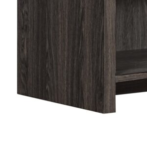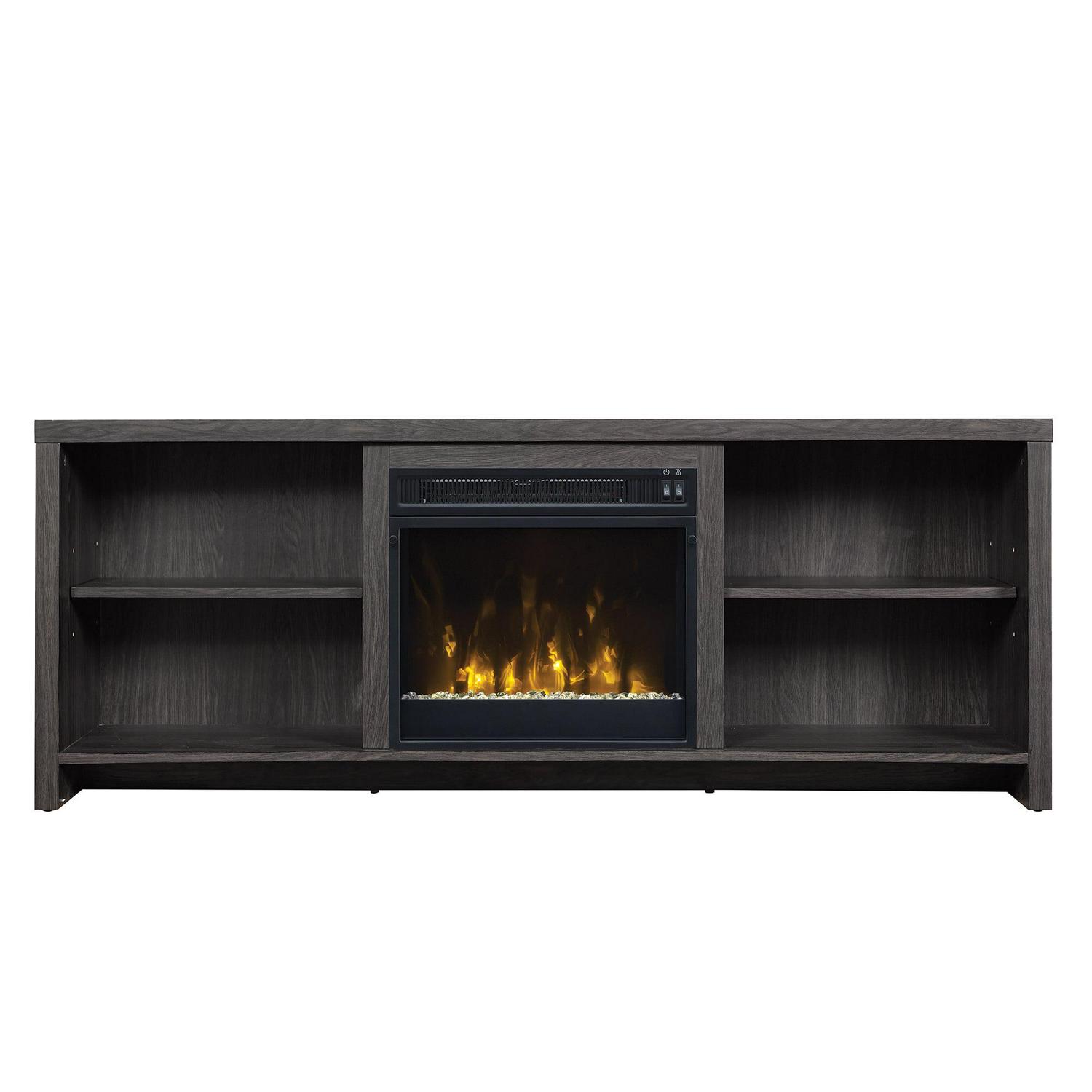 With a distinctive concave front design featuring open, adjustable wood shelves, and black walnut finish, this stylish Seasons Glen TV stand with electric fireplace is a great investment to update your room. Capable of holding your flat screen TV up to 65 inches and up to 90 pounds, this TV stand with electric fireplace can also provide supplemental zone heating for rooms up to 400 square feet to save you money. When you add heat to the room where everyone gathers, you can lower your thermostat and cut heating costs. This stand also offers ample storage for media components, gaming systems, books, and decorative items that will improve the decor of your living space. The flame effects can be used with or without heat for year-round ambiance. All hardware is included and it assembles easily for simple set-up and quick enjoyment. Tipping-restraint hardware included to help prevent accidents and damage to the TV stand. This product is MDF, so it is a wood product, but is not made of solid wood planks, although it is crafted to have that appearance. Product dimensions: 59.5″ L x 15.5 W x 23″ H.