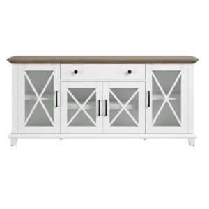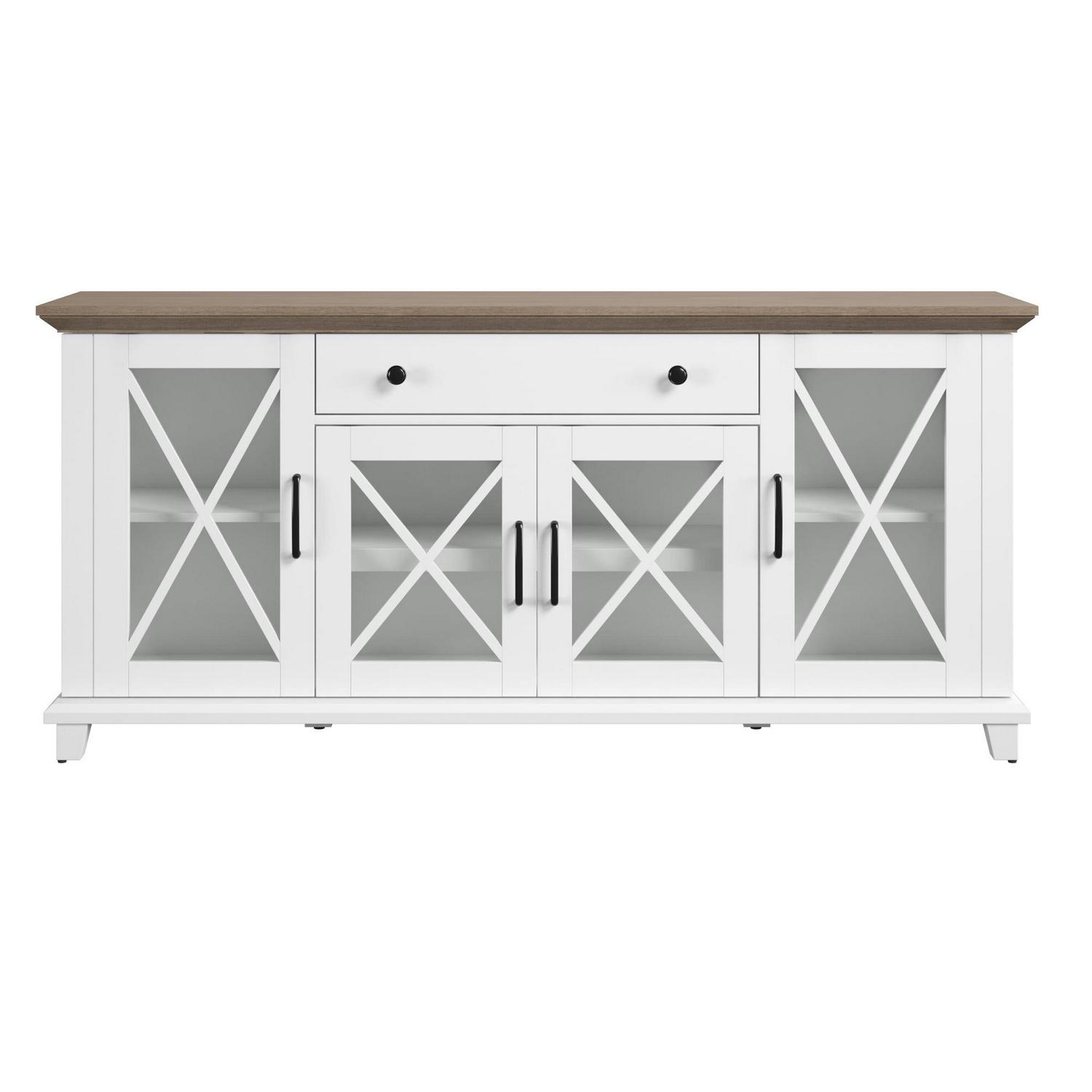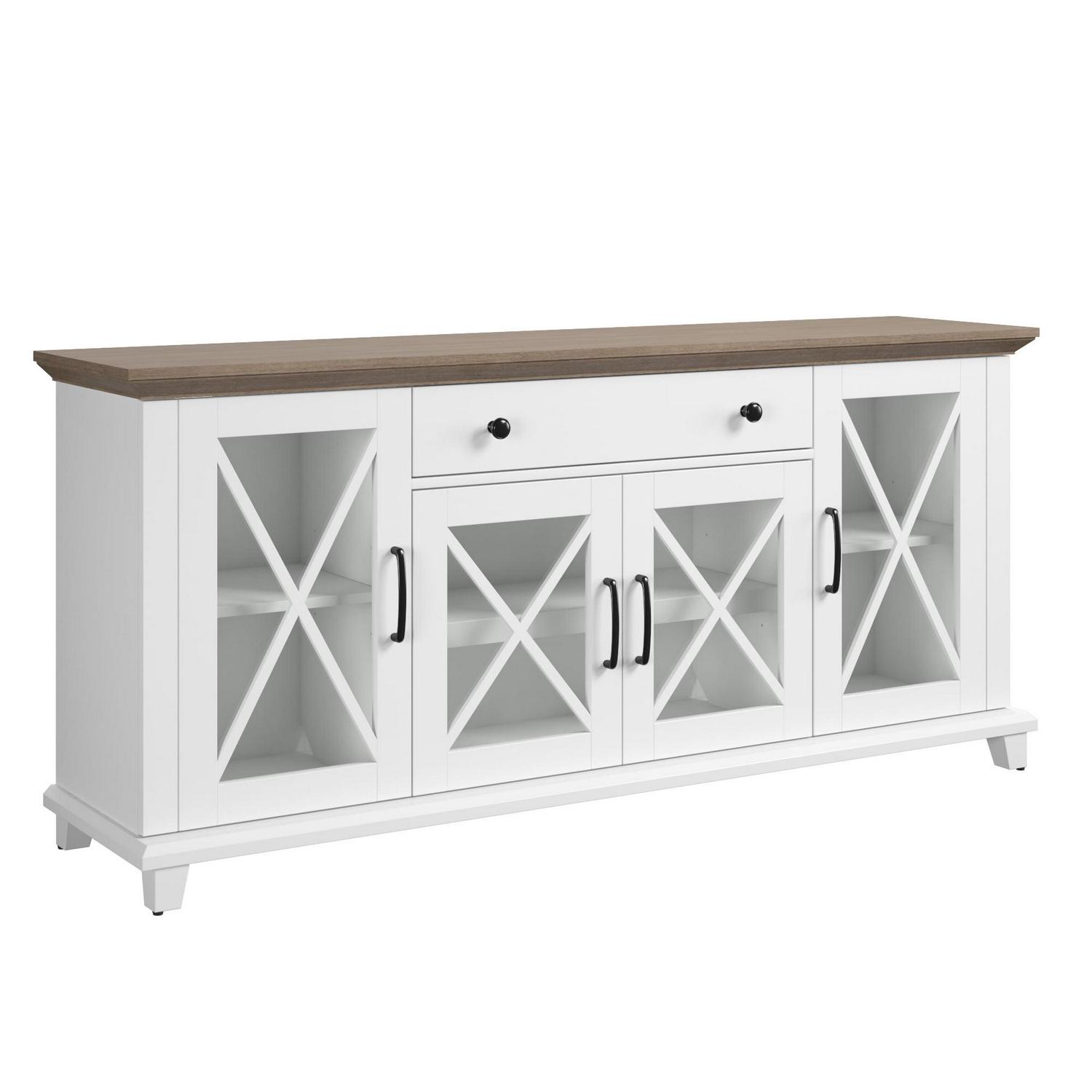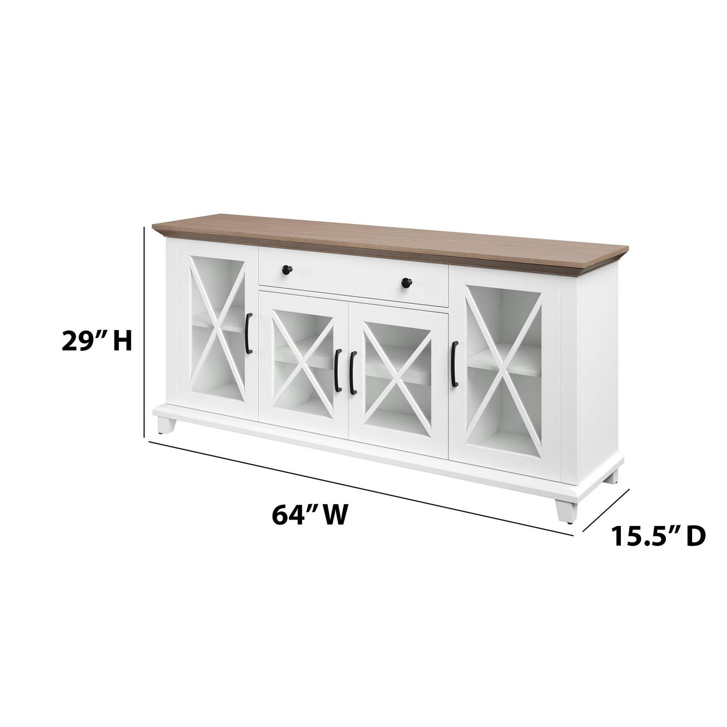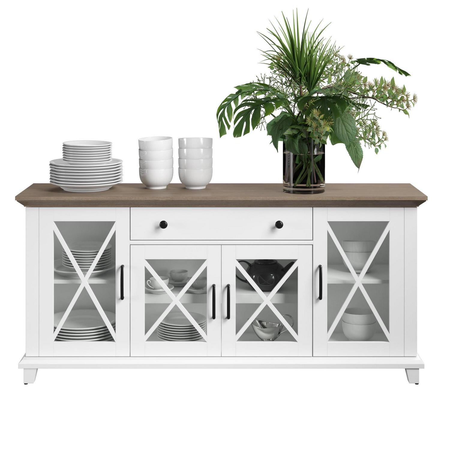 Collect the compliments all year long, thanks to this stylish sideboard. Your guests will be instantly charmed by the elegant glass cabinet doors with modern farmhouse accents. Store more than ever before when you use the adjustable shelves and center drawer, perfect for dishes, silverware, and dinner napkins. Best of all, the two-tone design makes for effortless style that s sure to enhance your space.