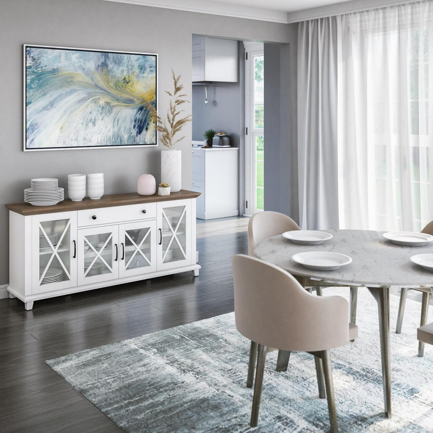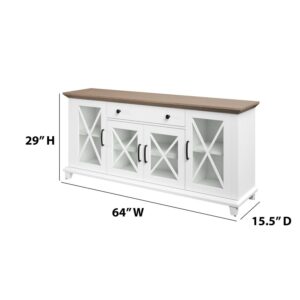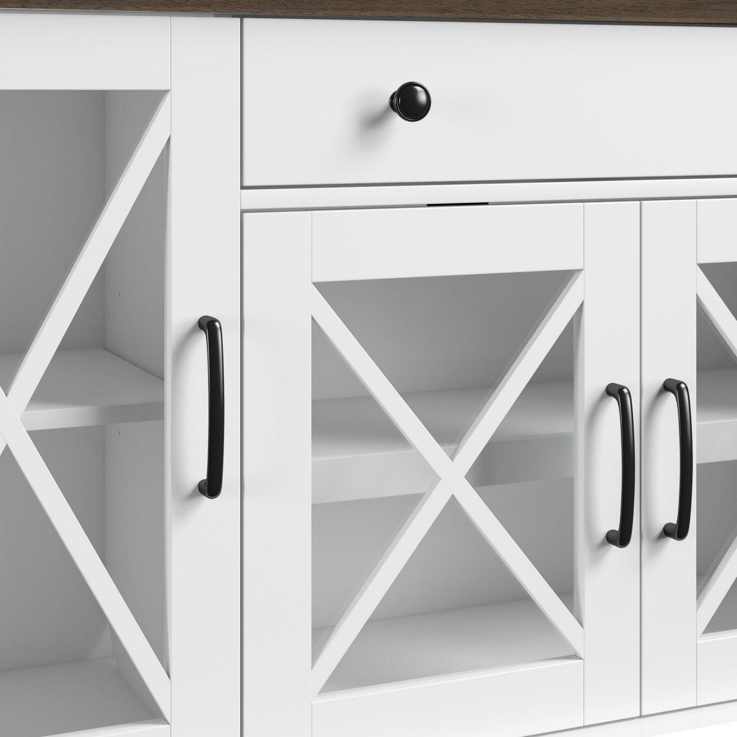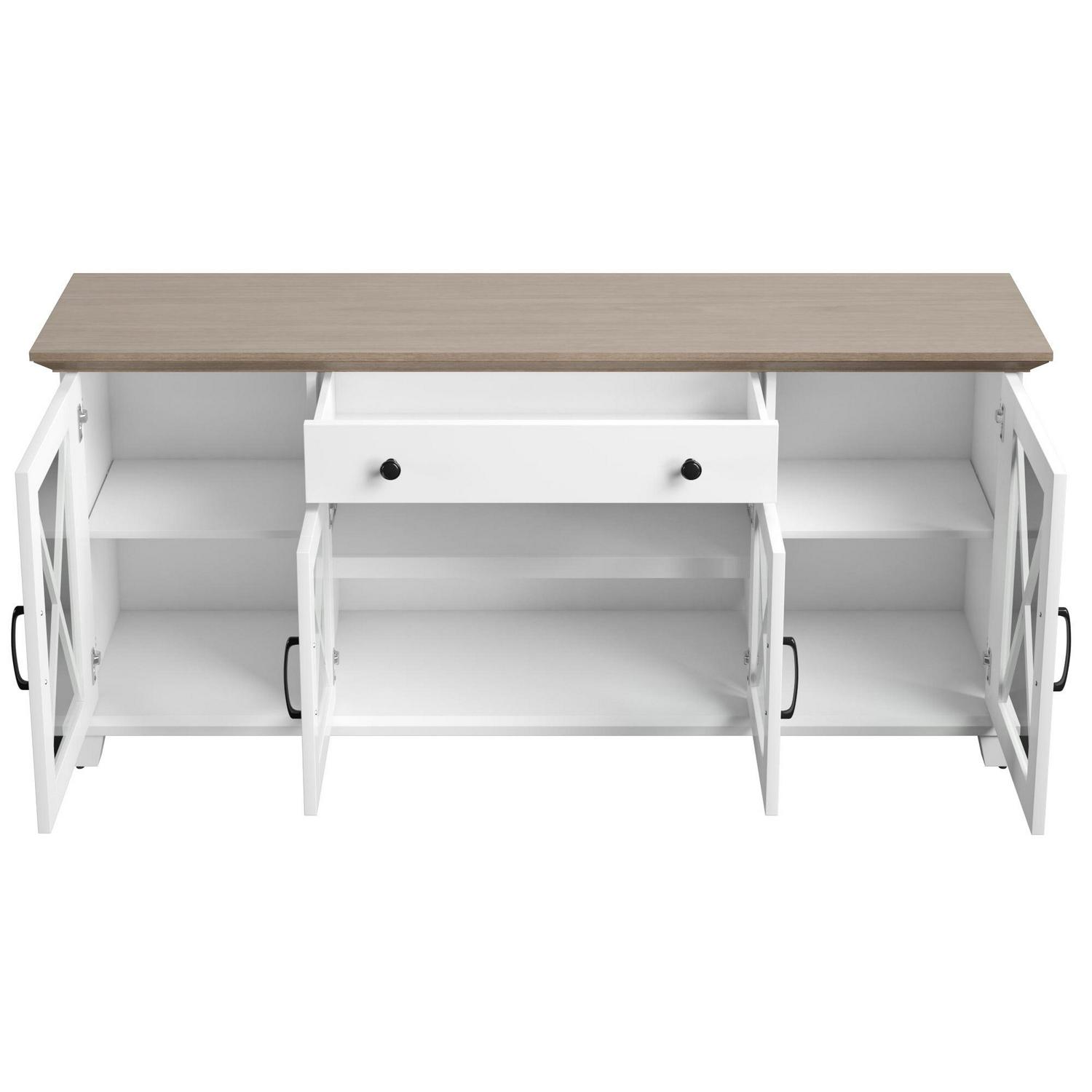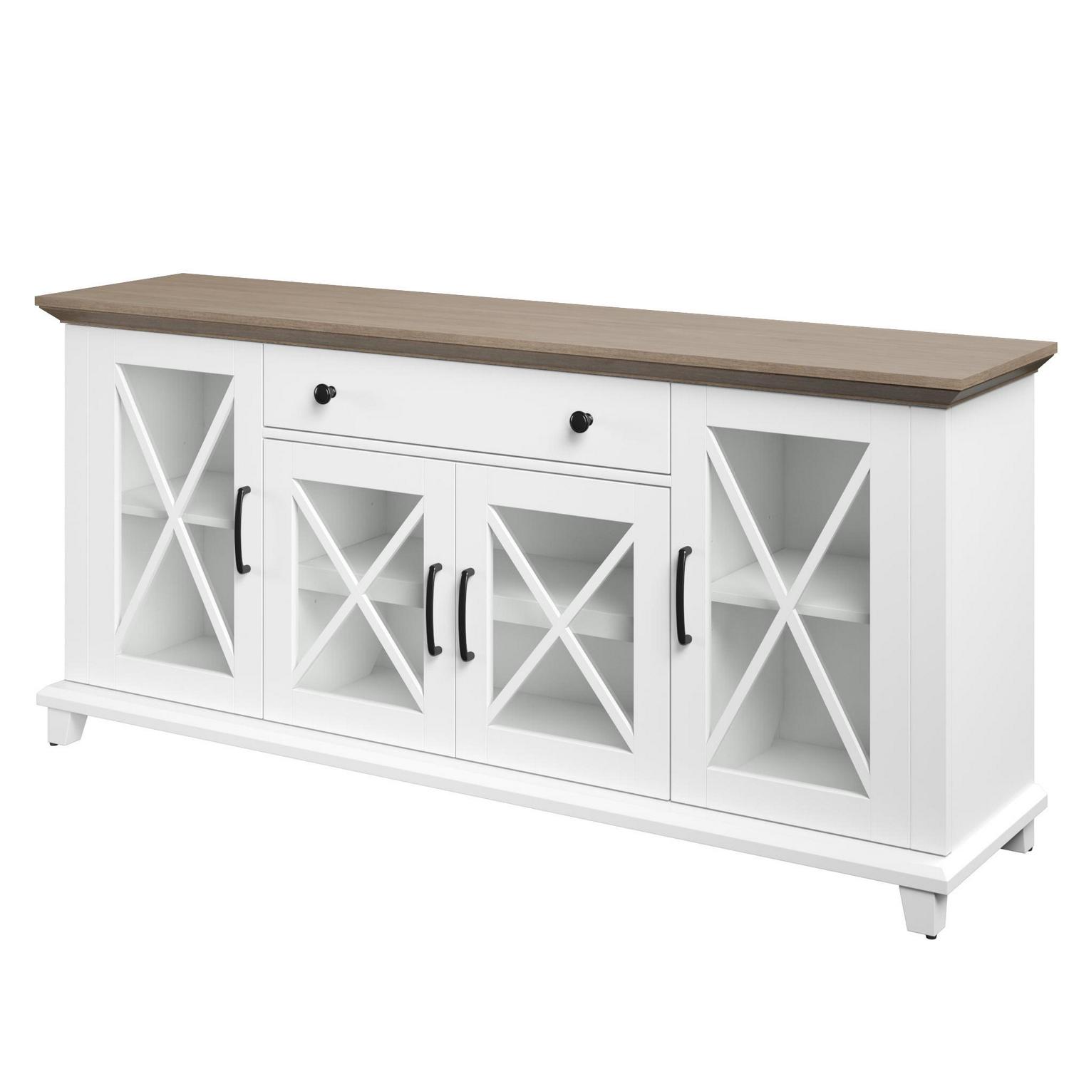 Collect the compliments all year long, thanks to this stylish sideboard. Your guests will be instantly charmed by the elegant glass cabinet doors with modern farmhouse accents. Store more than ever before when you use the adjustable shelves and center drawer, perfect for dishes, silverware, and dinner napkins. Best of all, the two-tone design makes for effortless style that s sure to enhance your space.