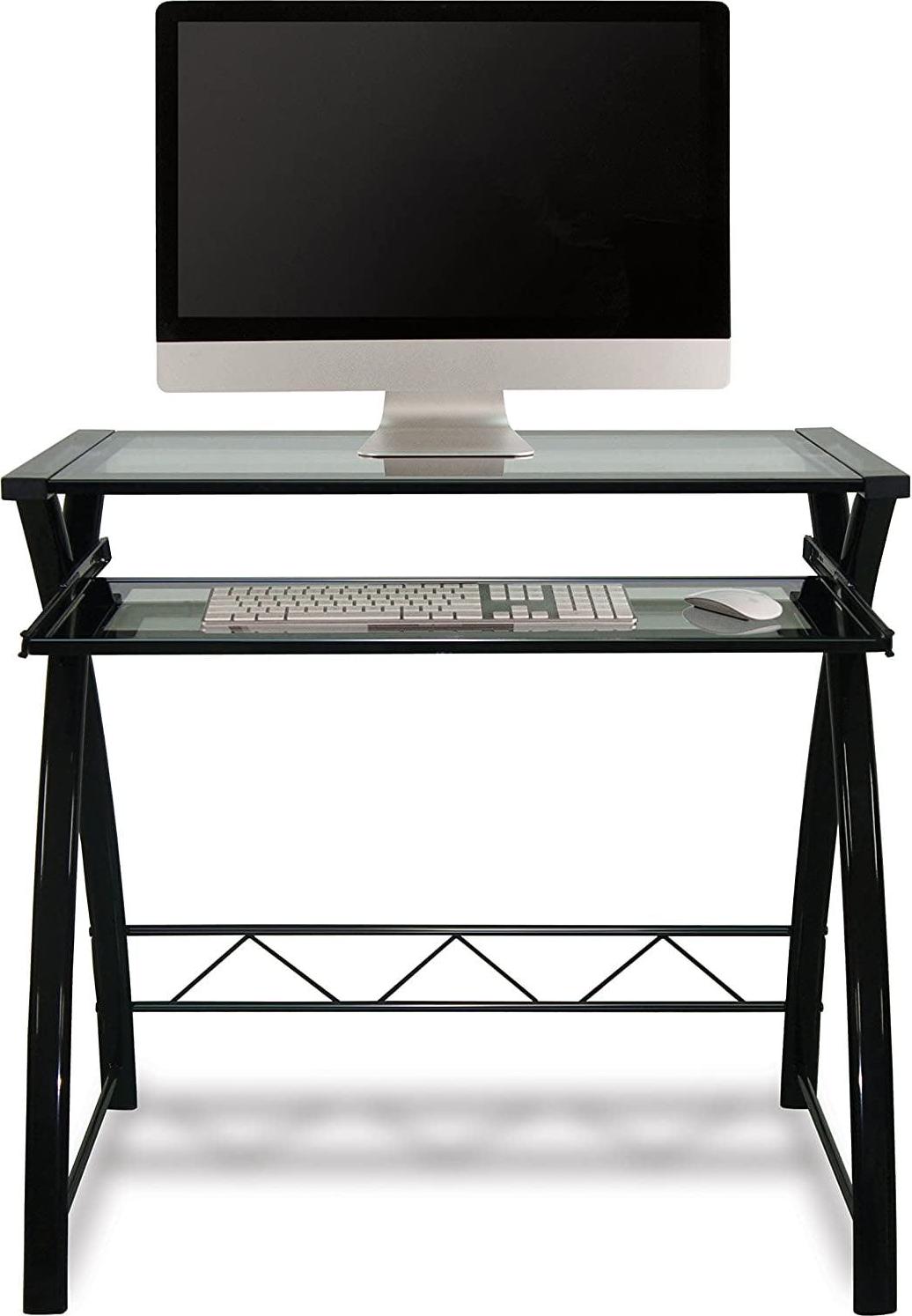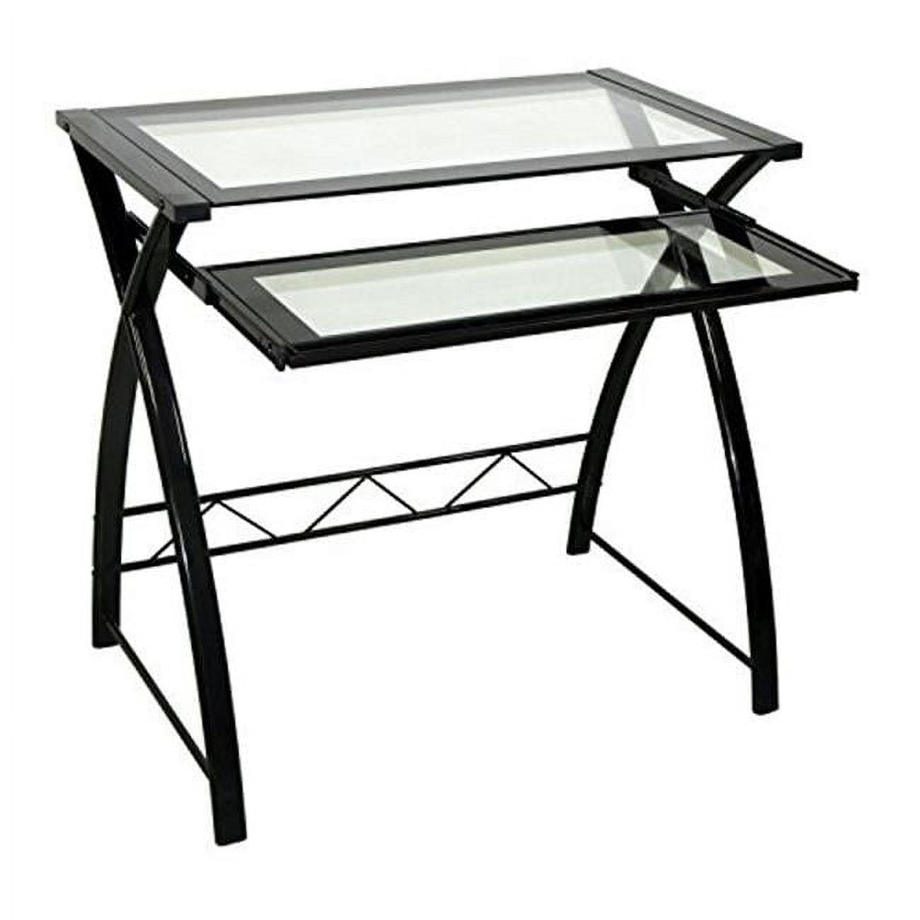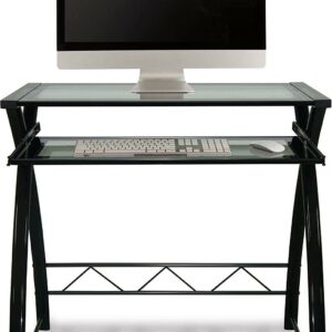 Sleek and modern, this stylish computer desk features a strong steel frame in a powder-coated, scratch resistant High Gloss Black finish. The clear tempered safety glass shelves are perfect for today’s newest computer monitors or laptops. There is a center pull-out shelf to accommodate a keyboard and mouse.
