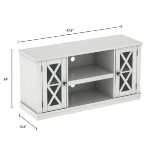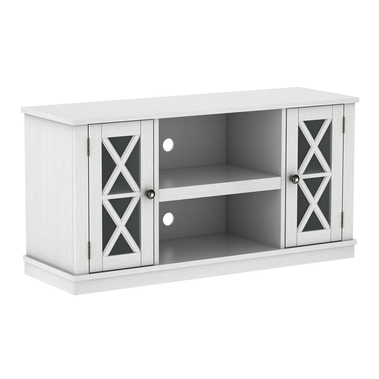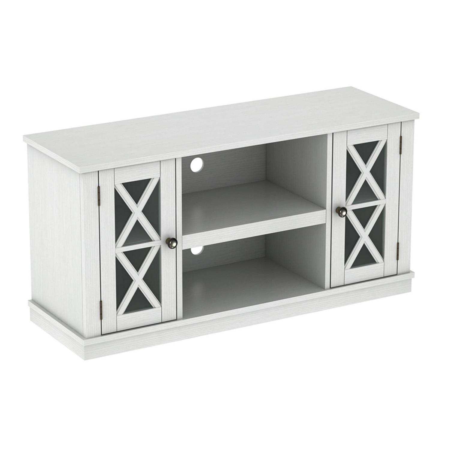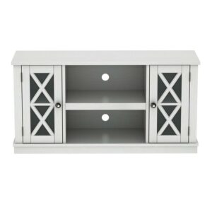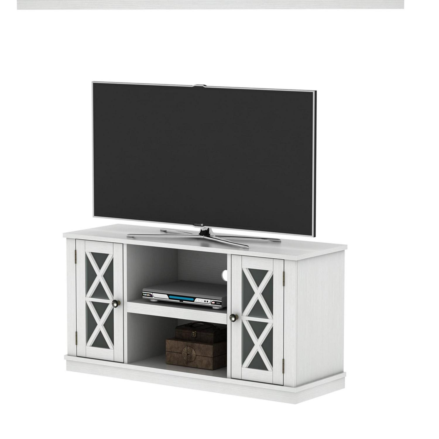 Add simple modern farmhouse charm to your living room, den, or any room with this TV stand that holds most flat screen TVs up 55 and up to 40 lbs. Large, open-front storage shelves in the center are perfect for holding media components or for displaying family photos and other treasured items. Tempered-glass doors offer attractive storage with adjustable shelves for blankets, pillows, and more, while rustic mullions add a welcoming feeling to any home. The side cabinets offer adjustable wood shelves for customized storage of movies, gaming system, remotes, and more. Rear pass-through holes make cable management easy and offer ventilation for electronics.