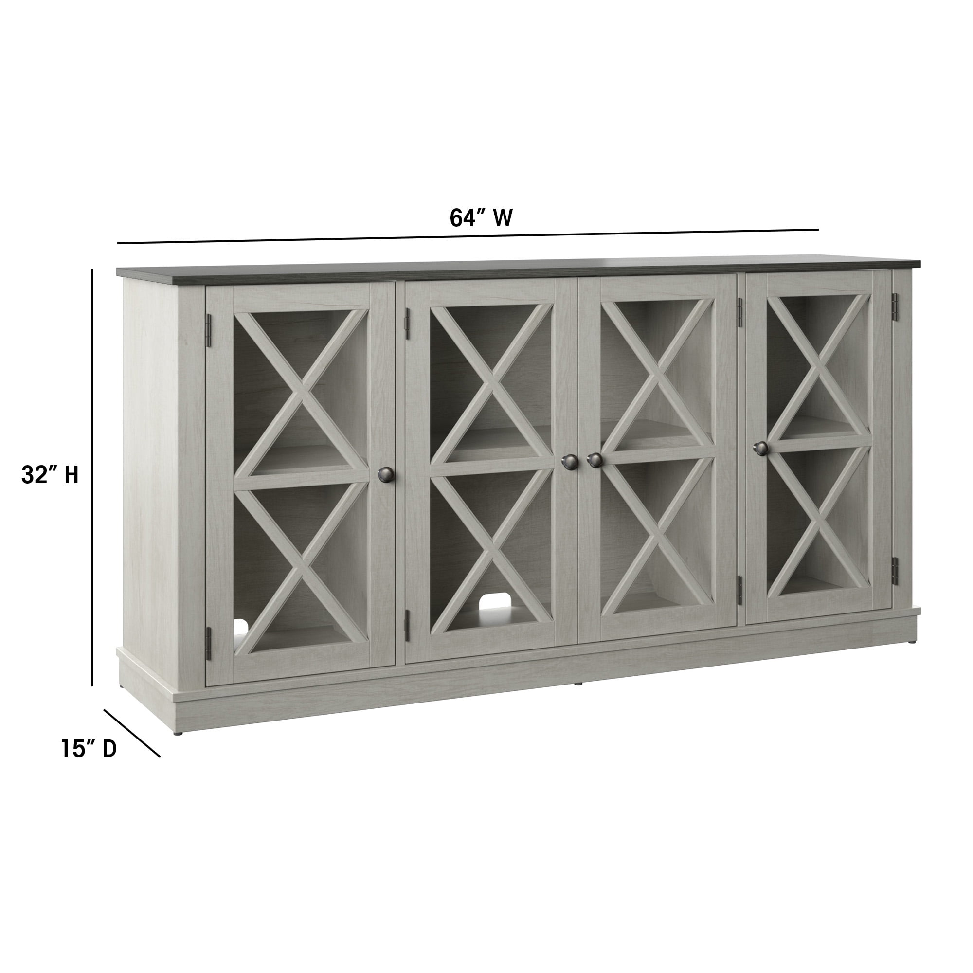 One double-door cabinet and two side single-door cabinets feature tempered glass doors with modern farmhouse style X mullions One interior shelf within each cabinet that can be adjusted to different heights Magnetic door latches keep cabinet doors securely closed Back panel cutouts allow for easier storage of electronics and prevent tangled cords Accommodates most flat screen TVs up to 70” and up to 70 lbs. when used as a TV stand May also be used as a console table, bedroom dresser, and more Tip restraint hardware included