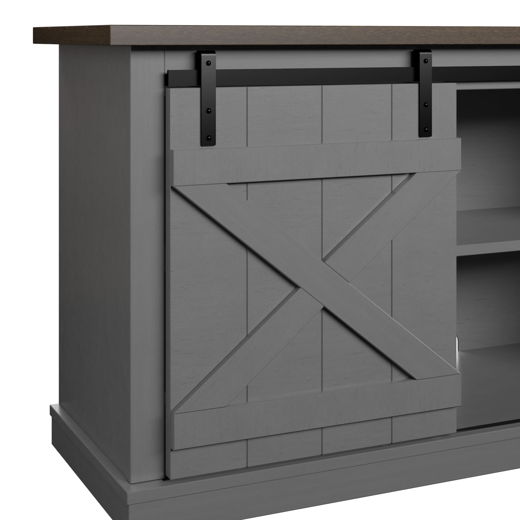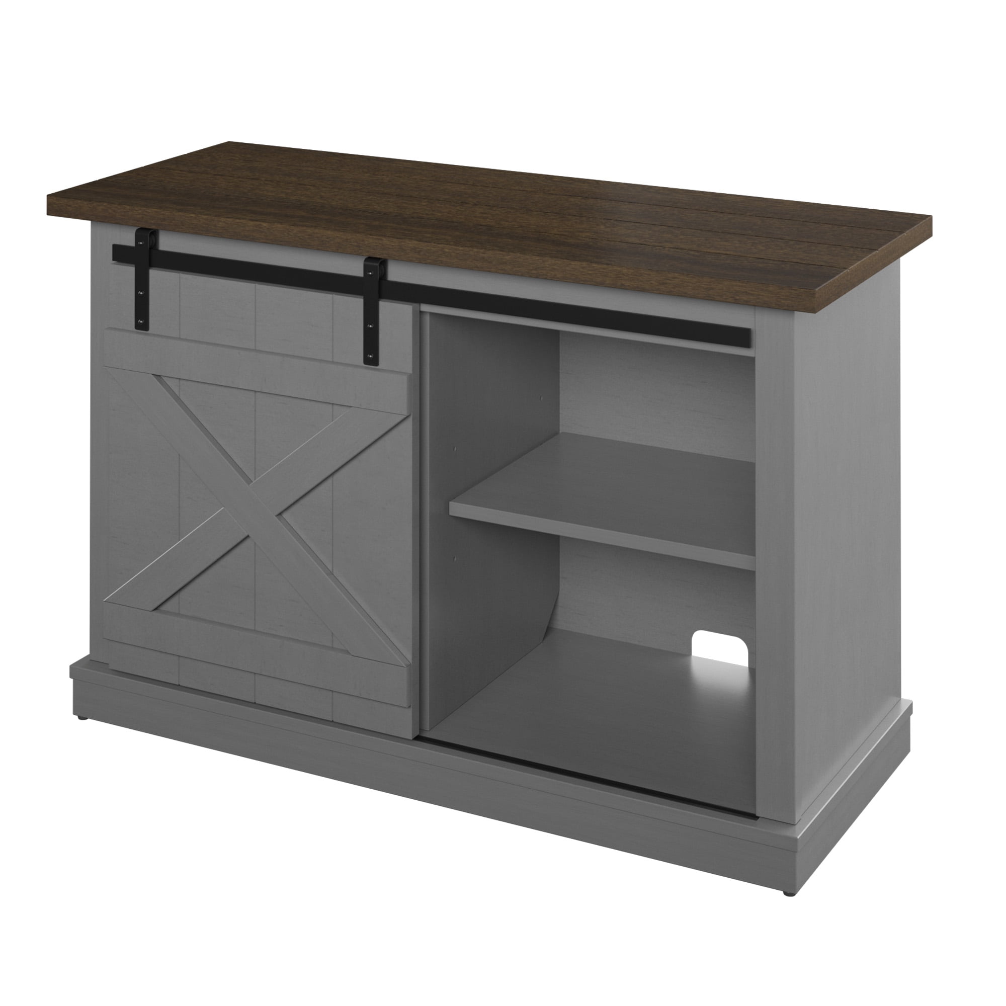 With this TV stand that can hold your flat screen TV of up to 49 inches and up to 35 pounds, you can enjoy modern farmhouse charm even in smaller living rooms. Its planked sliding barn door with rustic mullions offers modern farmhouse style that will be all your friends talk about after your next book club. Great for small space living, the sliding door glides across track hardware to save space and offer some concealed storage. Two adjustable shelves give you the freedom to customize how you store items and display home accents. To give your entire space a whole new look, get the matching coffee table, accent cabinet, side table with power, or storage bench (sold separately).
