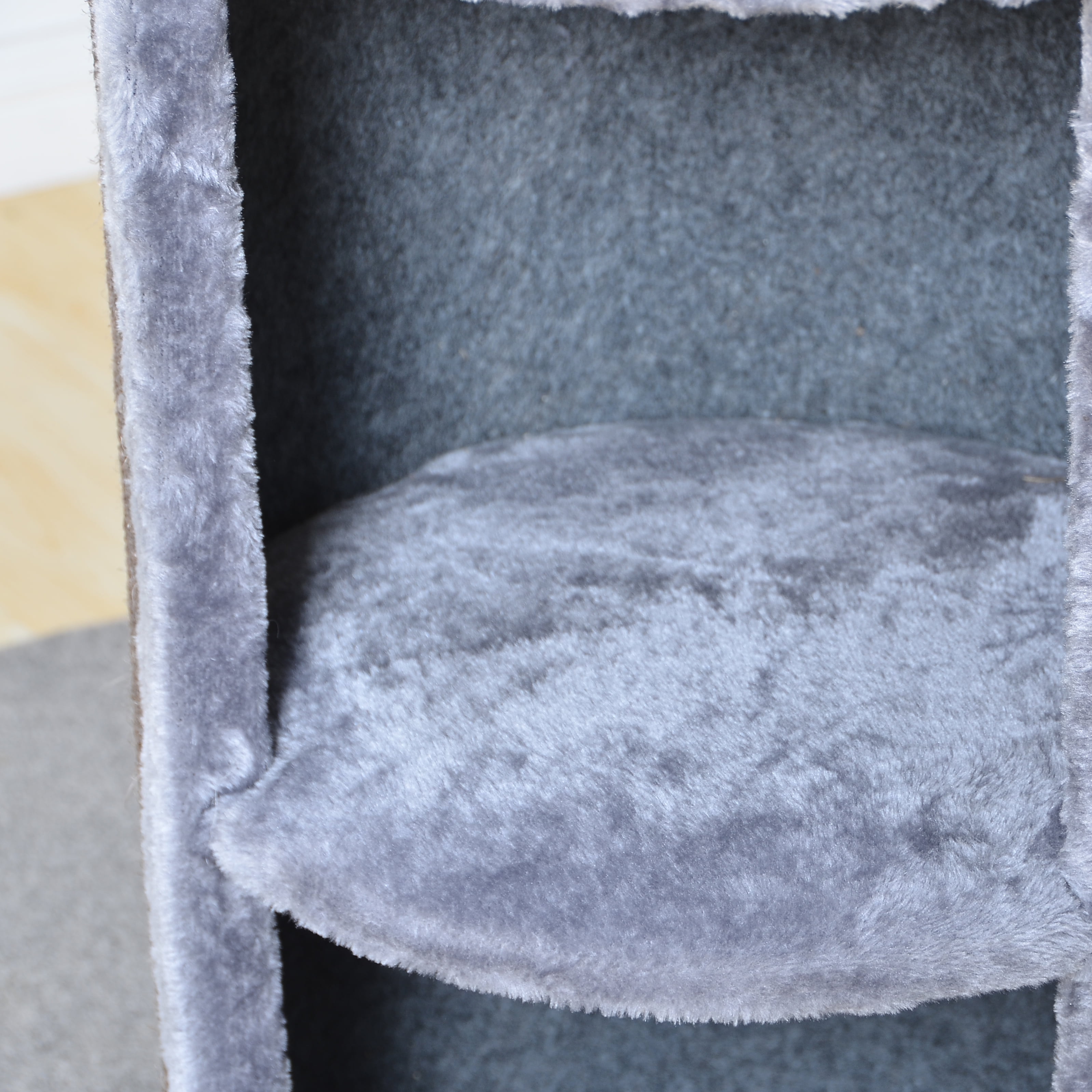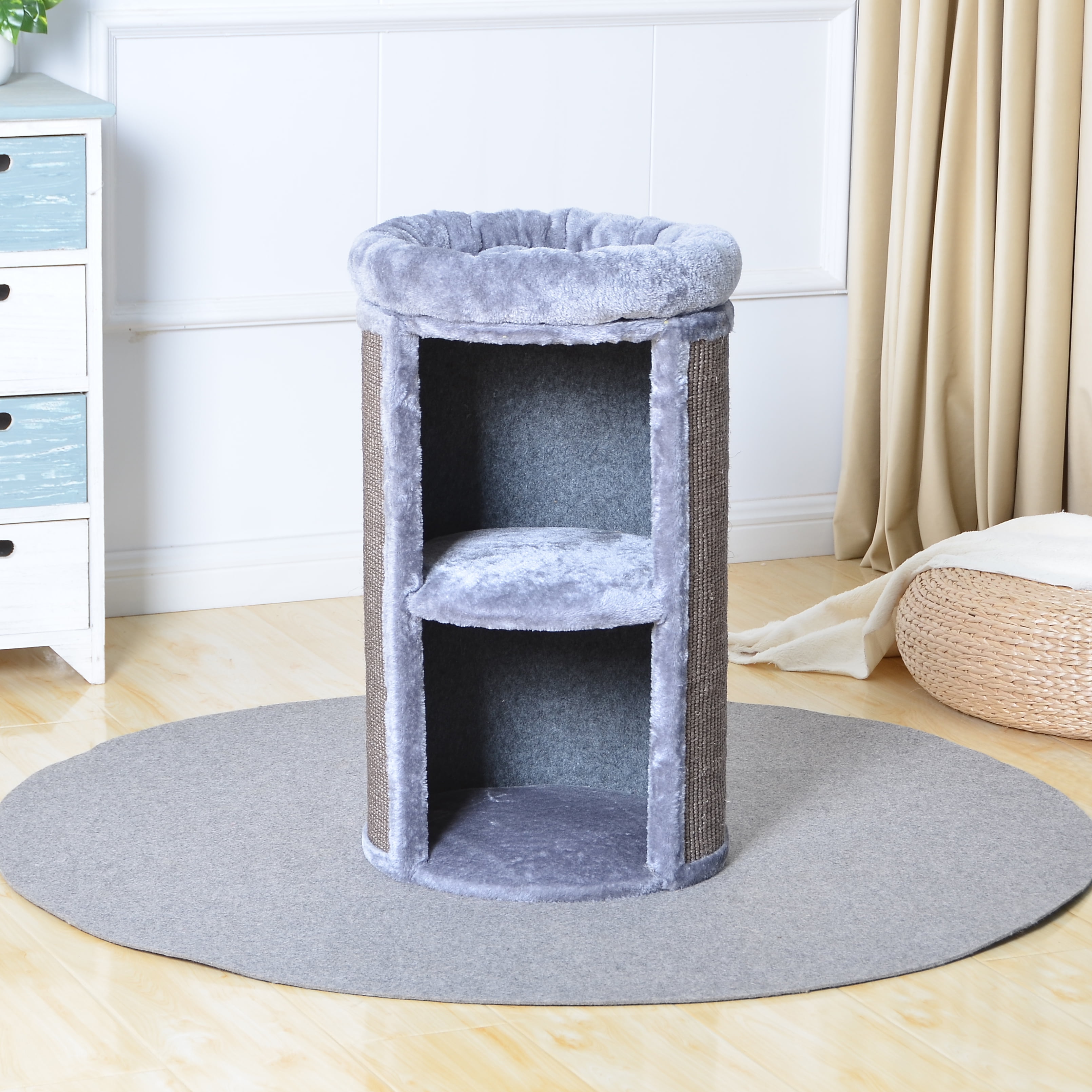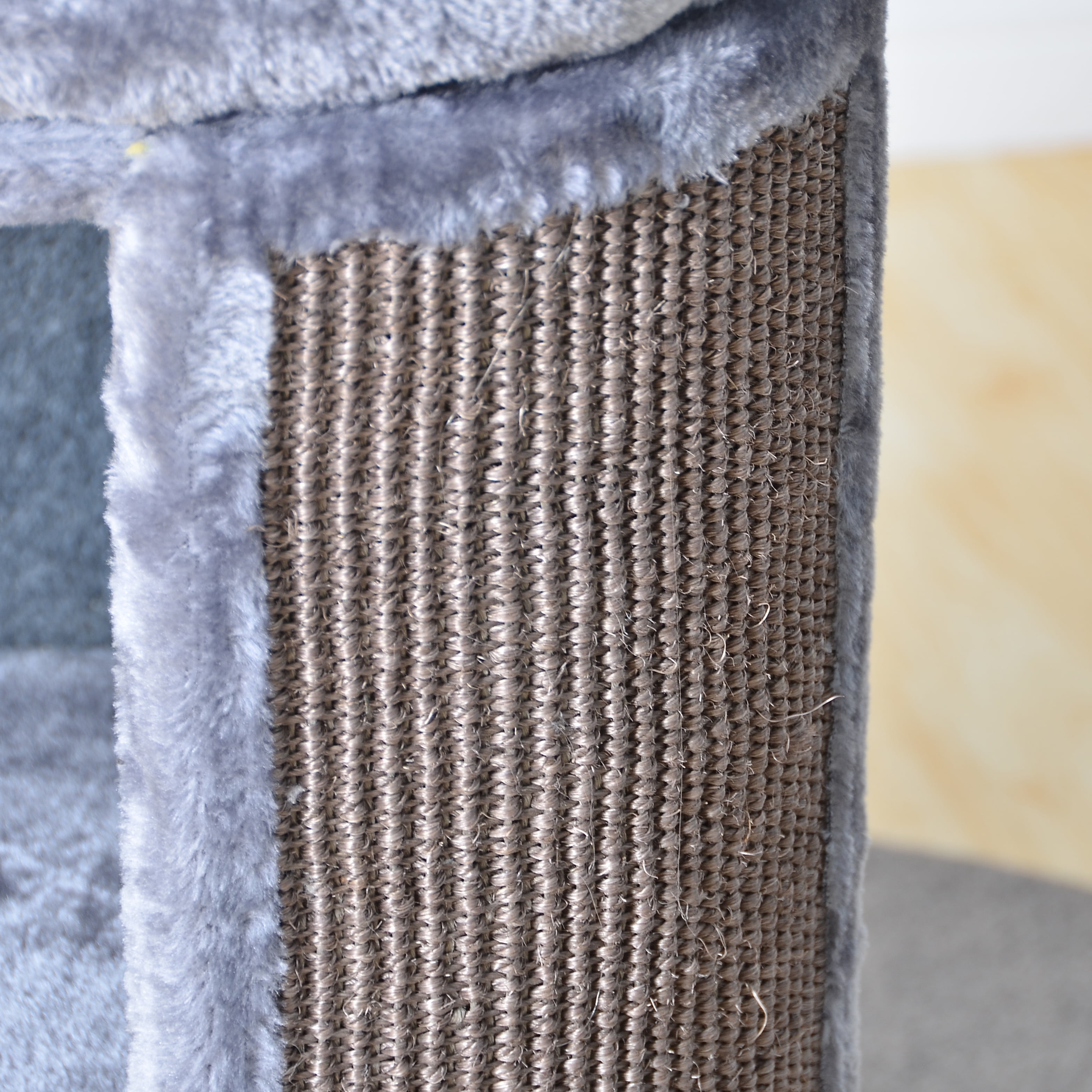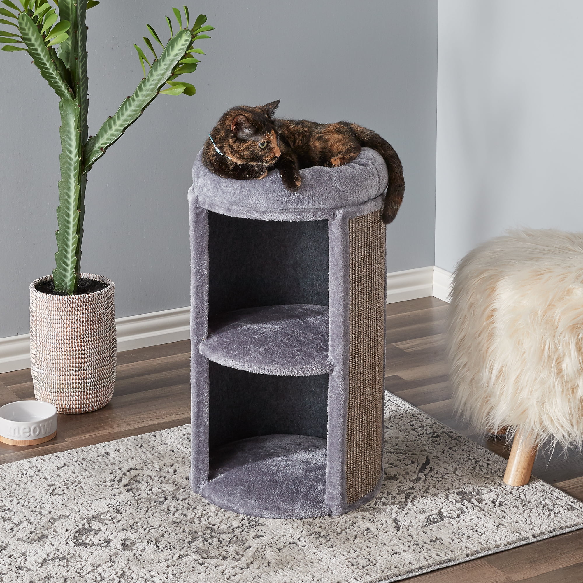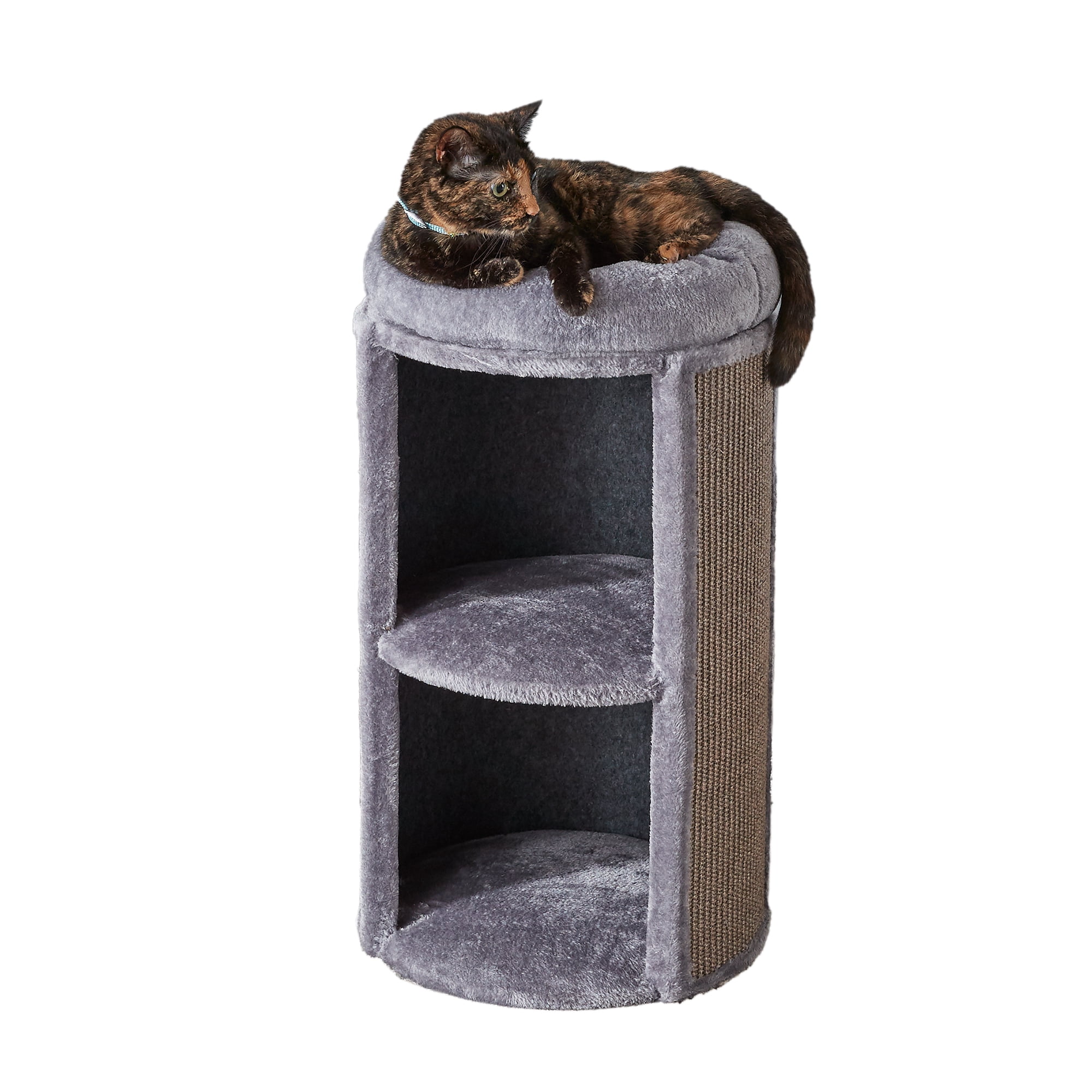 Two-level column-style cat condo with scratching boards and built-in pillow top bed gives your cat several places to get comfy. Cushy built-in bed is soft enough to sink into. Condo offers two levels to hide away. Scratching strips on both sides keep busy claws occupied. Soft grey goes with everything. Small enough to fit in any space. 25.5 x 14.9 Multi-level condo Built-in bed Two sisal scratching boards Grey plush fabric Small enough to tuck away 25.5 x 14.9 inches