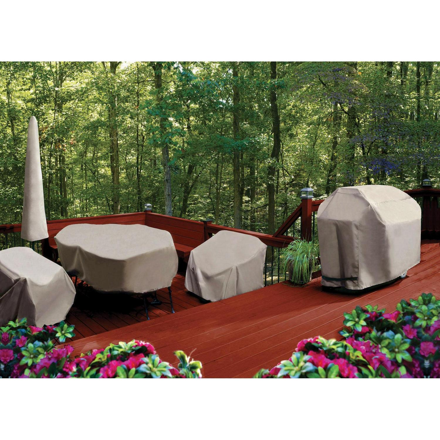 Protect your patio fire pit from the harsh outdoor elements with the Universal Table Set Cover by Two Dogs Designs. This industry-leading outdoor table set protector is constructed from heavyweight polyester and is equipped with PVC lining with enhanced UV protection. The heavy-duty material is weather-resistant against all elements including any standing water. With the durable double stitching, all water seepage is also prevented keeping your couch dry and fully operational. Unlike other furniture covers, this cover features hook and loop fasteners and an elasticized bottom to provide a secure fit. This universal table set cover effectively protects against all dust, dirt, sunlight, snow, rain, and much more. Each cover is made to last and is backed by a 1-year limited warranty. Whether it’s a hot sunny day or raining cats and dogs, the Universal Table Set Cover by Two Dogs Designs has you covered.