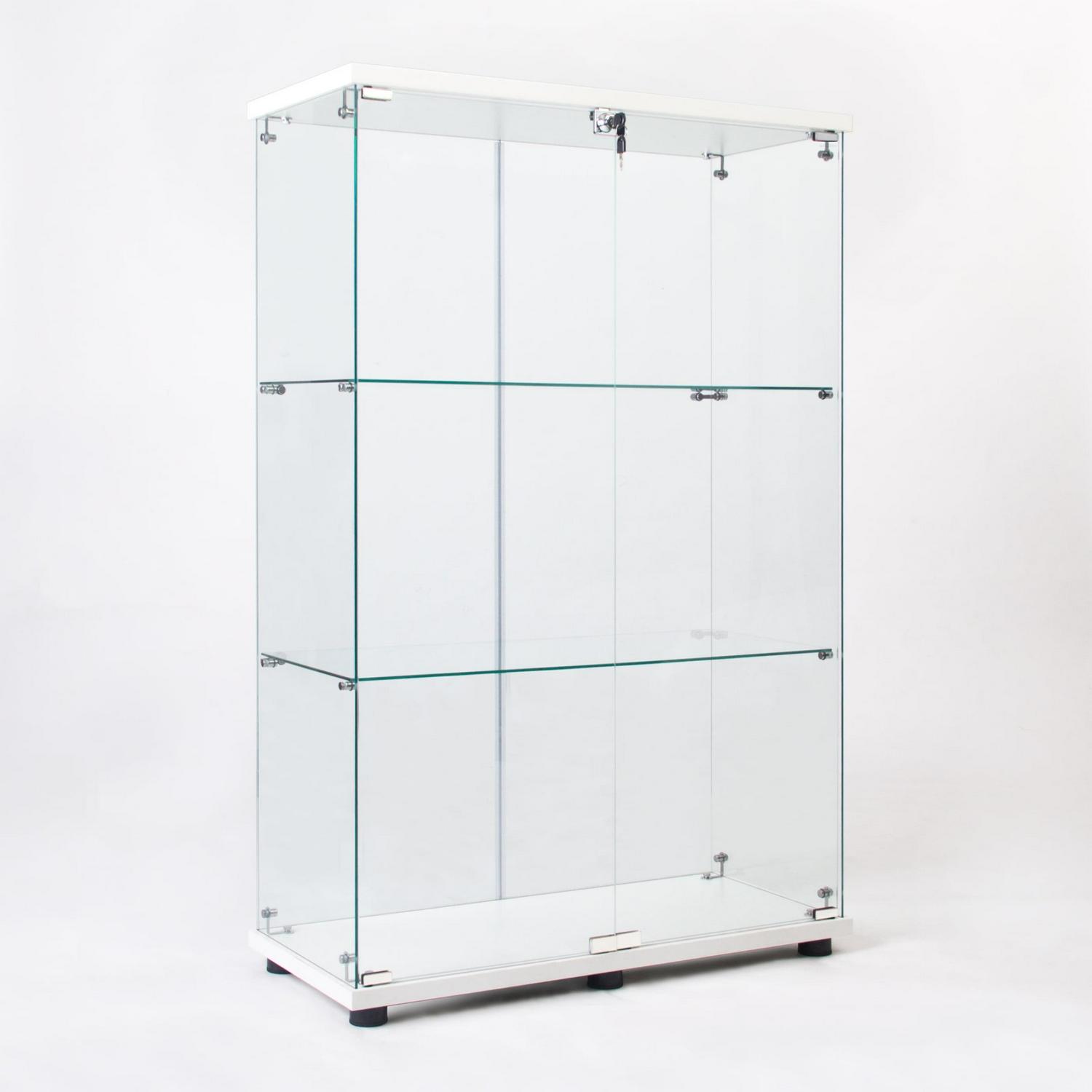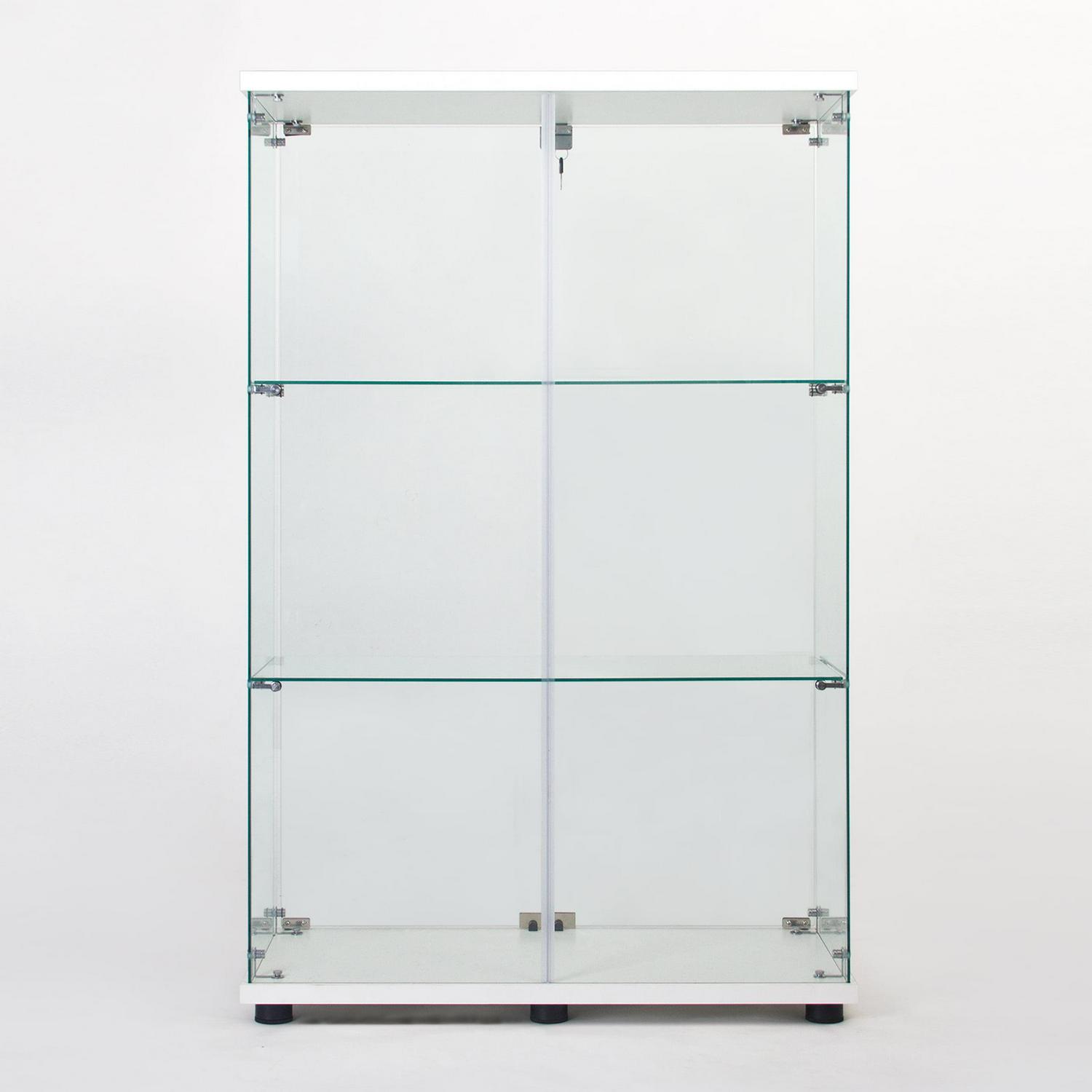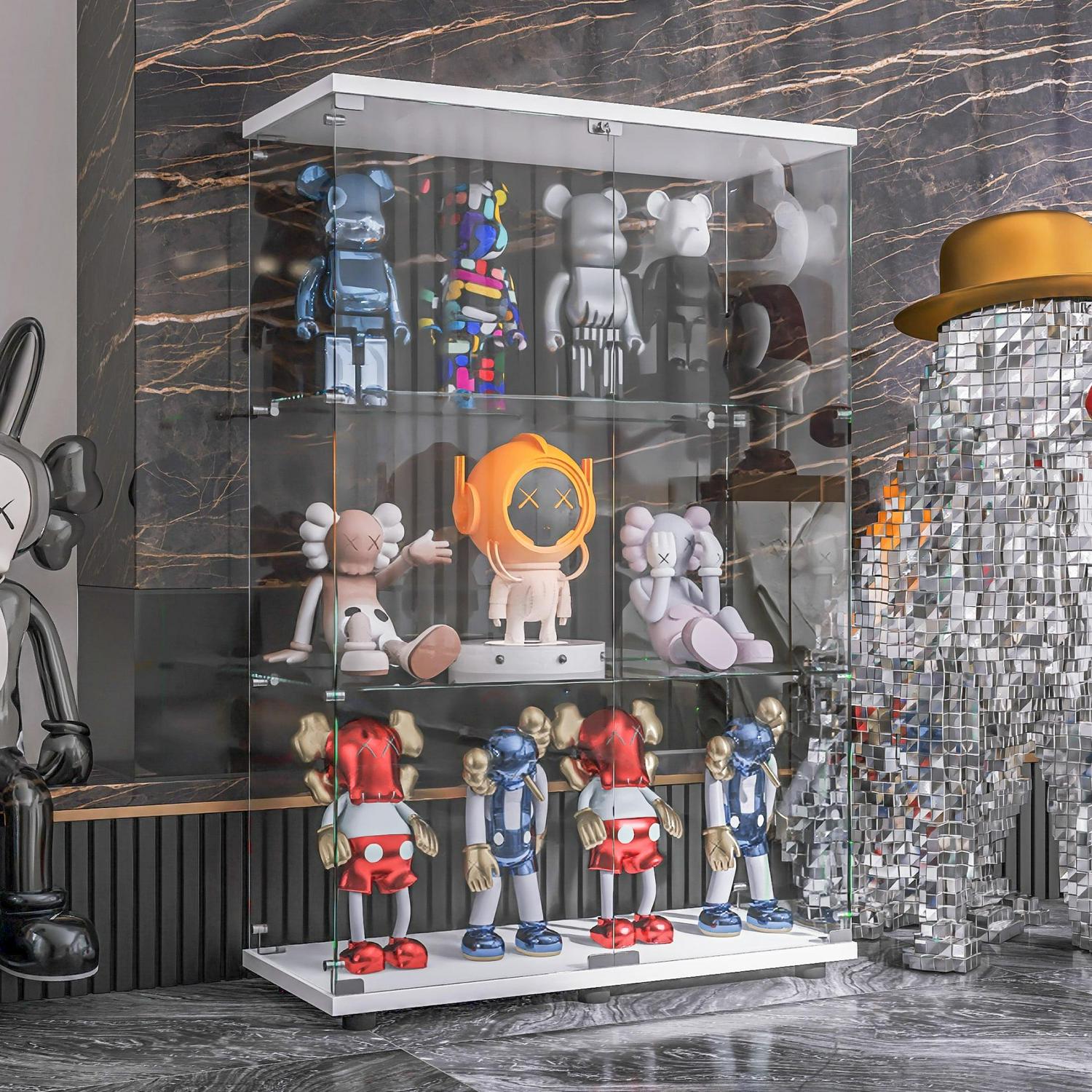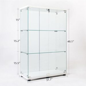 Two-door Glass Display Cabinet: Size 49.49 (H) x 31.77(L) x 14.37 (W) inches, each tempered glass is 4mm thick. 3-shelf design is sturdy and stylish to display Jewelry, Bags, Shoes, Figures,photos, books, action figures, wine and whisky; glass door is easy to open and close.