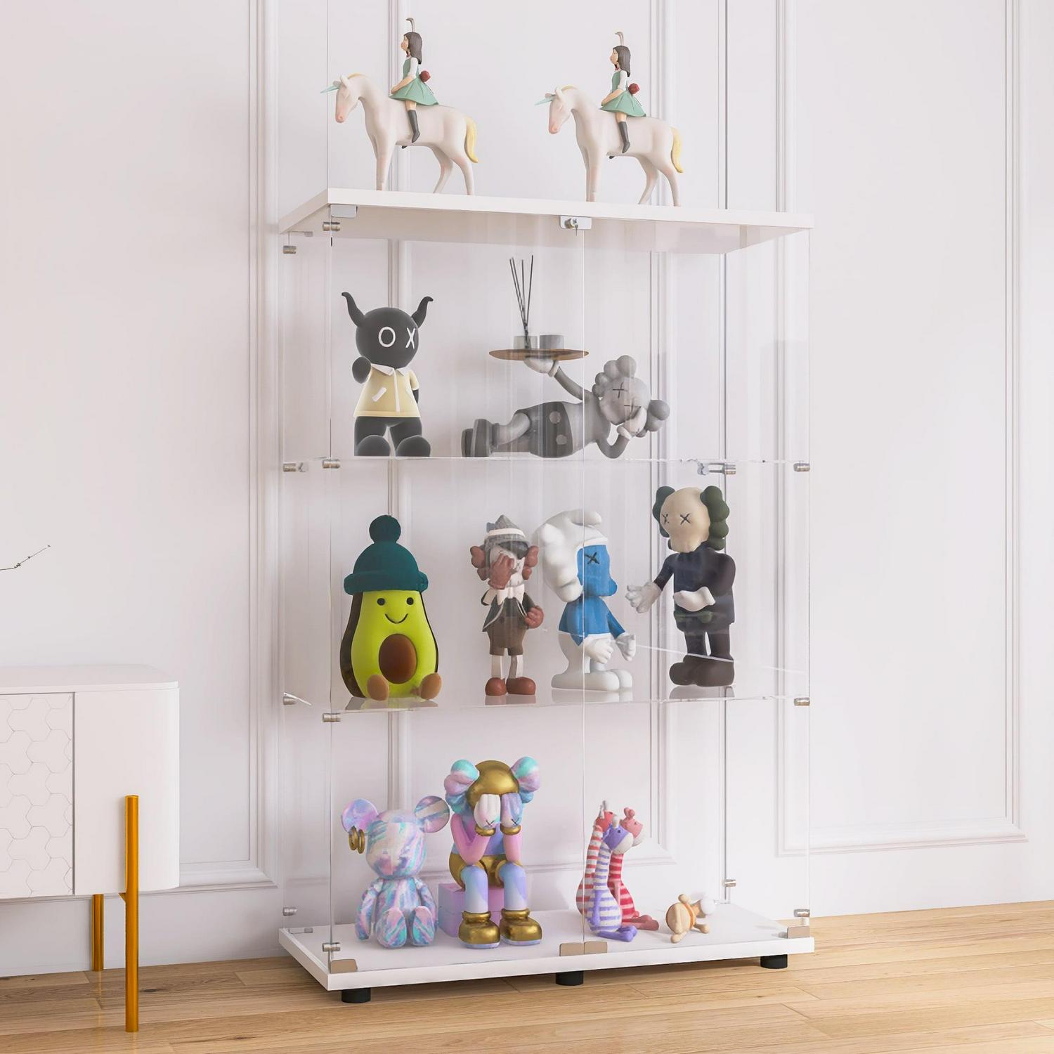 – Large Capacity: Each glass shelf level can withstand a maximum weight of 16pounds,The upper and lower decks can hold 84 pounds per floor. capacity in between is 15 (H) x 16.7 (L) x 14.4 (W), great for displaying Jewelry, Bags, Shoes, Figures,books, photos, medals, action figures, wine bottles, toys, artwork, decorations