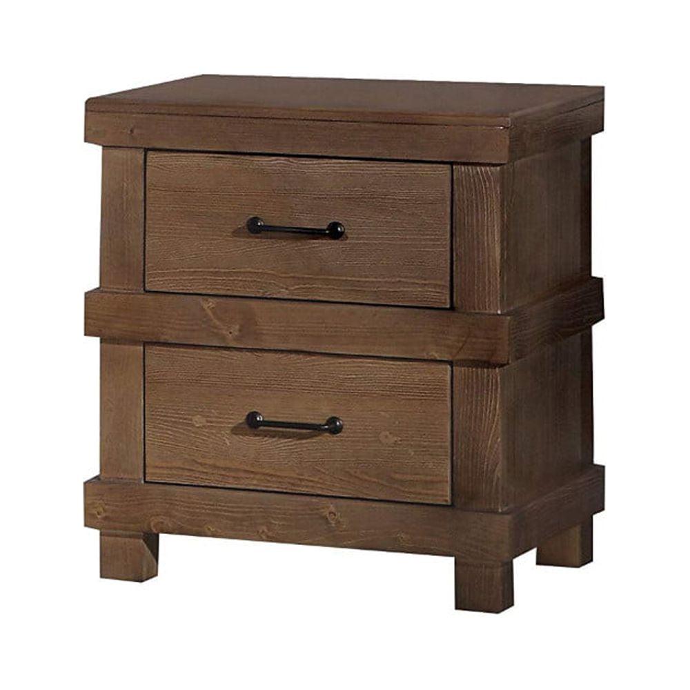 Two Drawer Nightstand With Metal Handle, Antique Oak- Saltoro Sherpi The visual appeal of this nightstand is featuring an antique oak finish giving a contemporary look the constructed body. With a complete one tone finish, this nightstand is a functional as well as a beautiful furniture piece. It also features two spacious drawers with metal handles so that it can hold all your bedtime essentials and other things easily. The flat table top can be used to place a sleek lamp, photo frame, vases, etc. to complete the bedroom setup. Does not include any featured product other than one nightstand only.