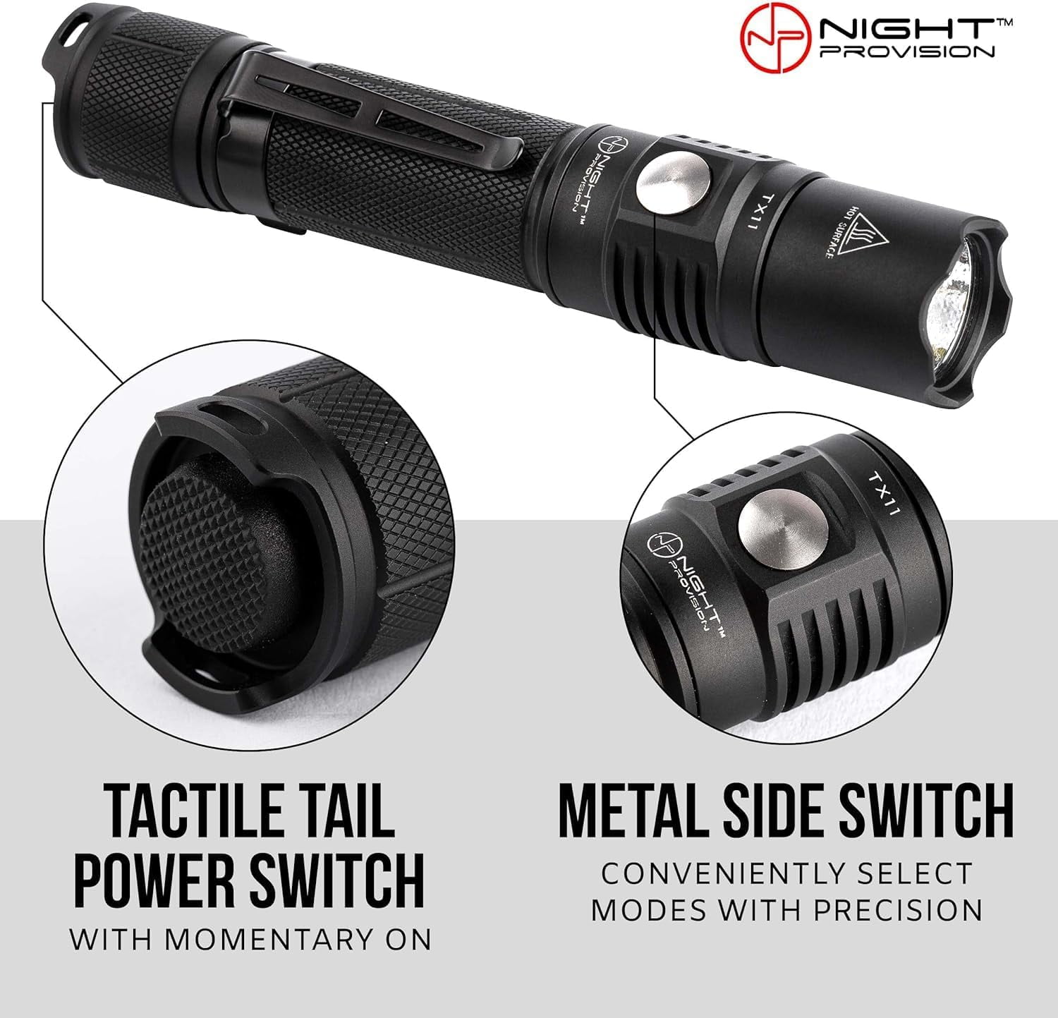 Never let the encroaching night keep you from crystal-clear vision; get the Night Provision LED flashlight and see whatâs ahead. Whether you work in the dark, need to react when the power goes out, or blow out a tire at night, you want to be able to see your surroundings clearly. Tough, Durable, and Ready for Action Cased in aircraft-grade aluminum, the TX11 offers 1600 lumens of pure, high-definition LED lighting and six operating modes to let you shine just the right amount of light for any situation. From output up to 268 meters of beam view for tracking or moving safely in the dark, you wonât find a tougher, more versatile means to see whatâs out there. Take it Everywhere: Up to 680 hours (fire-fly mode), the TX 11 is perfect for surviving, prepping, camping, bedside table, or even your tool belt. Thereâs nothing you canât handle no matter how dark it may get.