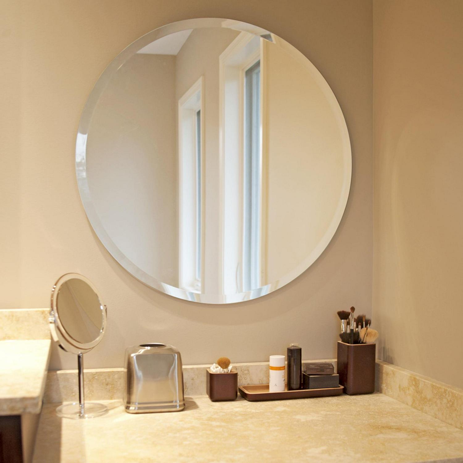This piece is all mirror. No frame, no decoration, no finishes. Just its simple, beautiful self. It is a circle with a simple beveled edge. Alone or in multiples, the Frameless Mirror is a perfect accent piece for an entryway, bathroom, bedroom or any room in your home. D-rings are affixed to the back of the mirror so it is ready to hang right out of the box! Other frameless sizes and shapes are available.