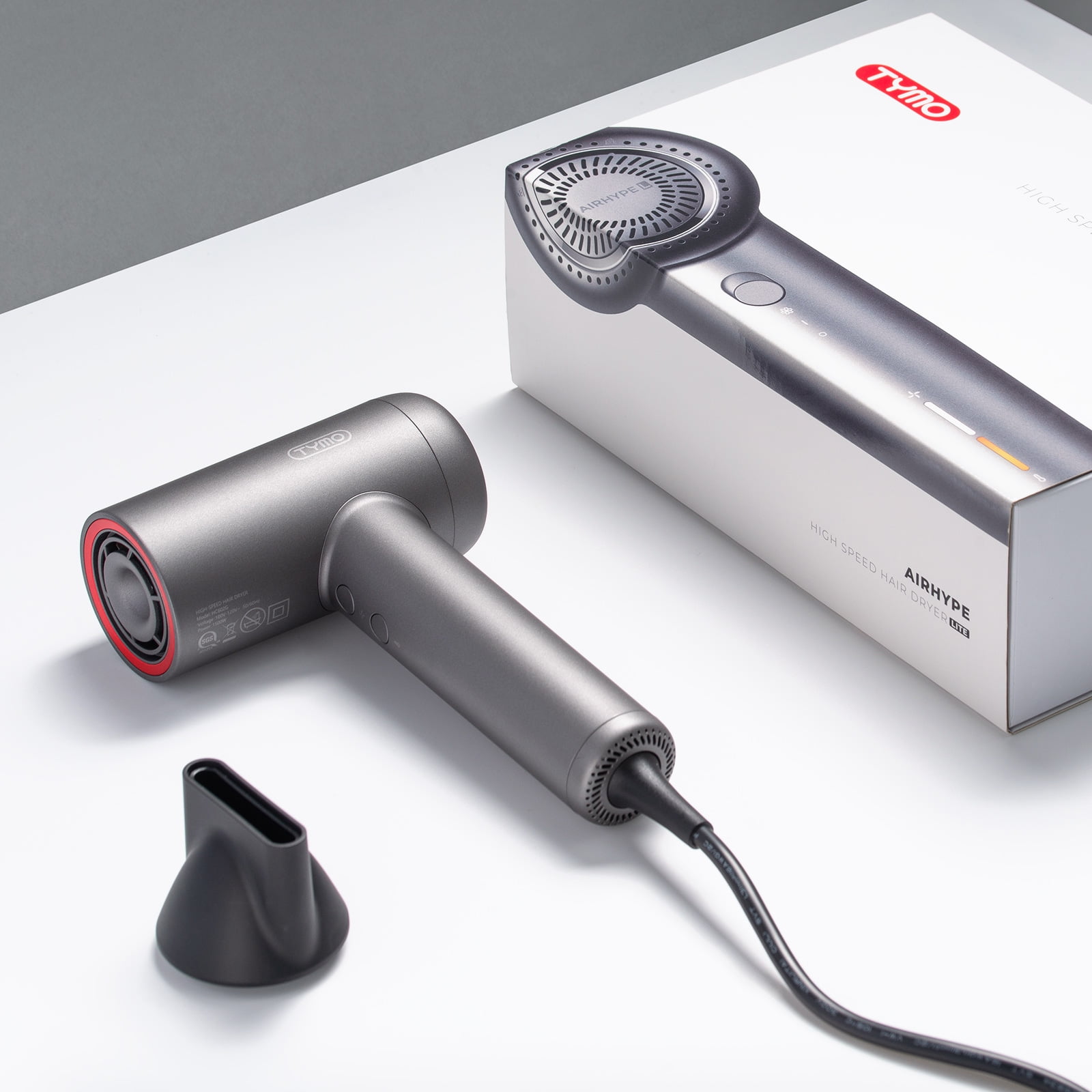 TYMO AIRHYPE Lite Hair Dryer with 110,000 RPM Motor For Fast Drying. The professional Ionic hair dryer releases 200 million negative ions to leave hair with a soft, glossy finish. Built-in dual smart T-Sensor which precisely monitors the temperature 500 times per second, preventing heat damage and maintaining fast drying experience. With a low noise level, you can enjoy a peaceful styling experience. Weighing just 0.83lb, it effortlessly fits into your on-the-go lifestyle.
