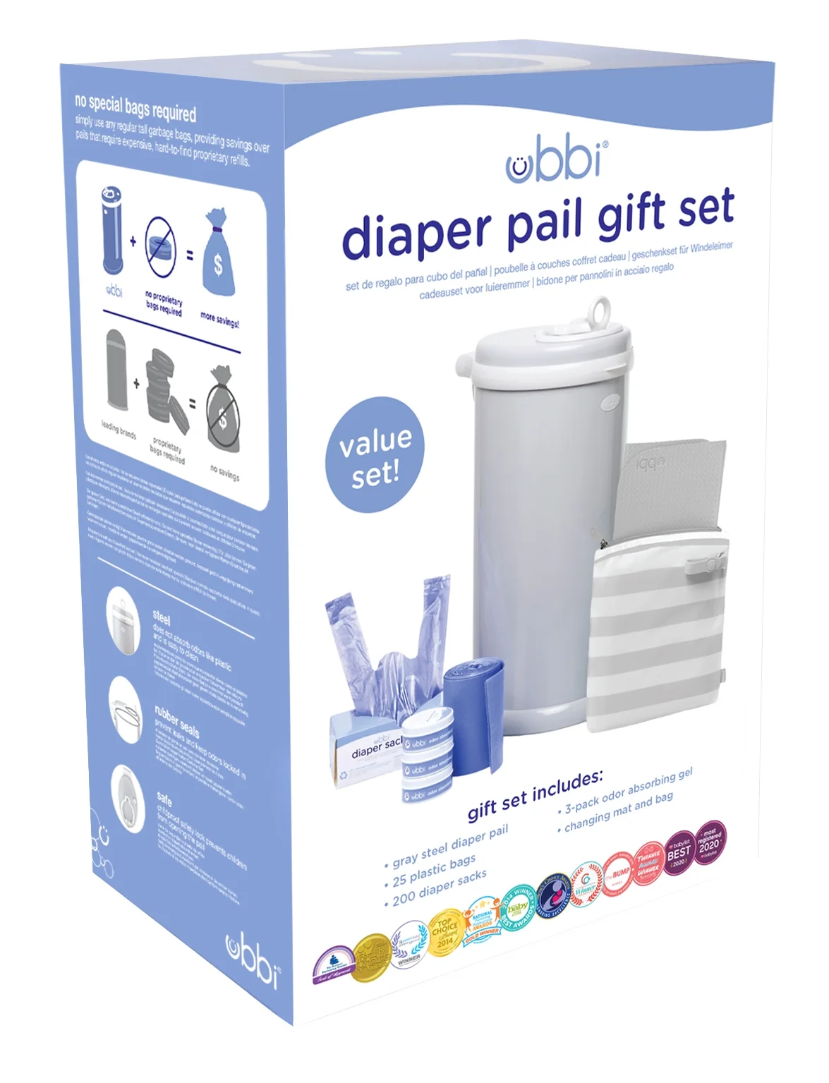 The Ubbi Diaper Changing Value Set includes a gray diaper pail, which unlike plastic, is made of steel and keeps the smell locked inside. No special bags or refills are required with the Ubbi diaper pail, saving time and money. Additionally, the pail holds up to 55 newborn diapers! The convenience of the included 25 pack of bags will get parents started at first and after, any bags can be used! Included in the kit are the value 3 pack of odor absorbing gels that subtle mitigate foul odors with a pleasant lavender scent. The gels are just a plus, not a must! The changing mat and bag is a great on-the-go diapering solution for quick and easy diaper changes, as it can hold a few diapers, travel size wipes dispenser, as well a phone, keys, or whatever else is needed for busy parents on-the-go. To round out the set are the 200 count diaper sacks, which provide a convenient disposal of stinky diapers with easy-to-tie tabs at home or on-the-go. This set makes the perfect registry essential or baby shower gift.
