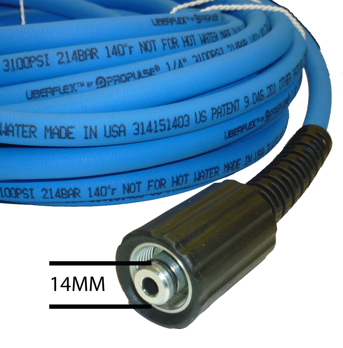ProPulse® UBERFLEX™ Kink Resistant 1/4″ x 50′ 3,100 PSI Pressure Washer Hose with 22MM-14 Twist Connects. The most flexible hose in the industry! The latest technology from ProPulse® delivers a revolutionary upgrade from the standard consumer grade and light commercial duty cold water pressure washer hose. UBERFLEX™ possesses the unique properties of superior resistance to permanent kinking and abrasion Designed for use on gas or electric pressure washers with operating pressures of 3,100 PSI or less. Works on many Briggs & Stratton, Craftsman, Delta, Devilbiss, Excell, Generac, Karcher, Ryobi, Sears & Troy Bilt units with dual 22mm-14 female twist connects. NOT FOR HOT WATER OR STEAM UBERFLEX™ Hose on YouTube Features: • MADE IN THE USA: Every foot of ProPulse® UBERFLEX™ is designed, engineered and manufactured in the USA, assembled using imported and/or domestic end fittings • PERMANENT KINK RESISTANCE: Let’s face it—all hoses can be kinked under the right conditions, but the unique UberFlex technology ensures that if the hose is pinched or kinked, it won’t stay that way permanently • FLEXIBILITY: UberFlex feels more like an extension cord than a hose, and possesses the smallest bend radius in its class • TEXTURED COVER: The textured cover upgrade reduces tack and snag tendencies during handling, dragging and reeling • UNMATCHED ABRASION, OZONE, UV AND CHEMICAL RESISTANCE: The proprietary high performance of the UberFlex cover is at least five times more abrasion resistant than traditional PVC covered hose Hose Construction • Inner Tube: Proprietary water and chemical resistant rubberized thermoplastic blend • Reinforcement: Dual-ply high tenacity polyester with ProPulse® exclusive length stabilizing technology • Cover: Abrasion resistant polyurethane, ProPulse exclusive low tack, low friction finish Specifications: • Hose: 1/4″ ID x 50′ Long • Working Pressure: 3,100 PSI • Color: Blue • Max. Water Temperature: 140° F. • Ends: (2) 22mm-14 Female twist connects • Black bend restrictors on both ends • Weight 3.45 lbs