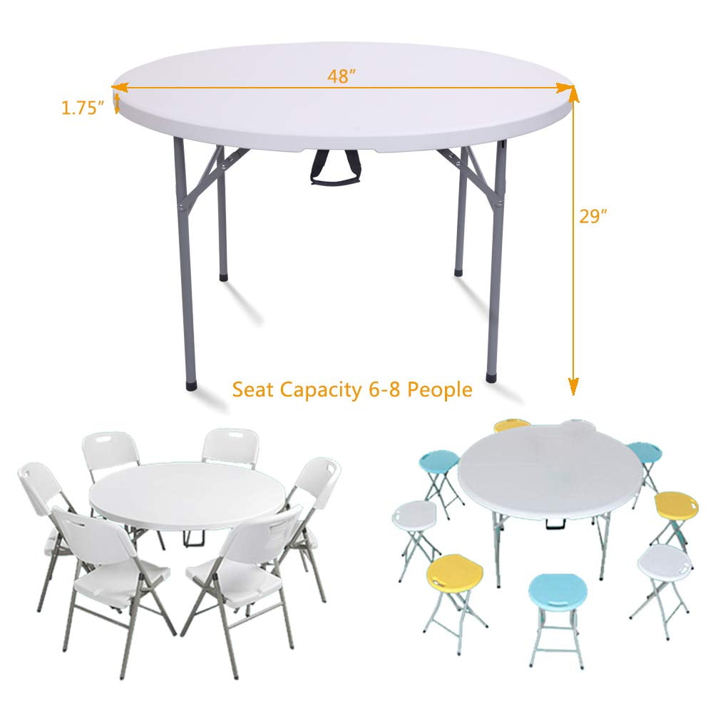 Features: Foldable and Lightweight Design: This table is designed with foldable top and legs. When you are not in need, you can put it in the corner and it does not take up much space. With the light weight, it is also very easy for you to remove. MDF and Steel Material: It is made of sturdy material, which is very durable and stable. The max loading weight capacity of the table is 400kg. It will be enough for daily life. Easy to Clean: The top of the table is made of aluminum, which is waterproof, scratchproof and not easy to get rusty. Because of this feature, it makes much easier for you to clean after use. No assemble needed: This table is not needed for assemble. It can be easily set up and folded within several minutes. Multifunctional Use: This portable table is a good choice for family reunions, picnics, camping trips, buffets or barbecues. It is perfect for both indoors and outdoors use. Specifications: Material: HDPE & Steel Color: White Table Top and Gray Plastic-Sprayed Steel Pipe Dimension: (48.03 x 48.03 x 29.13)” / (122 x 122 x 74)cm (L x W x H) Fold Dimension: (48.03 x 24.02 x 3.54)” / (122 x 61 x 9)cm (L x W x H) Weight: 30.86lb / 14kg Load Capacity: 881.85lb / 400kg Package Includes: 1 x 48inch Round Folding Table 1 x Manual