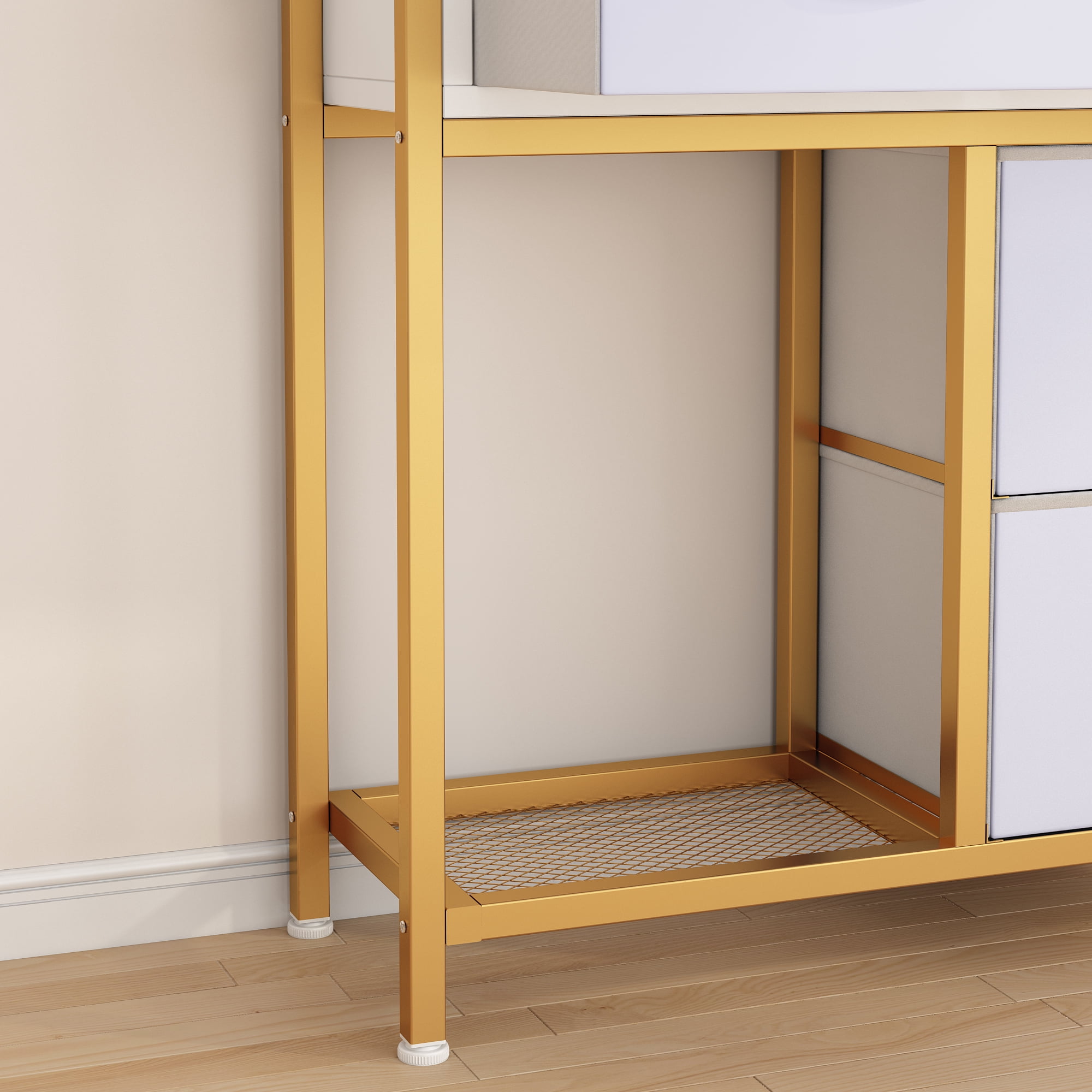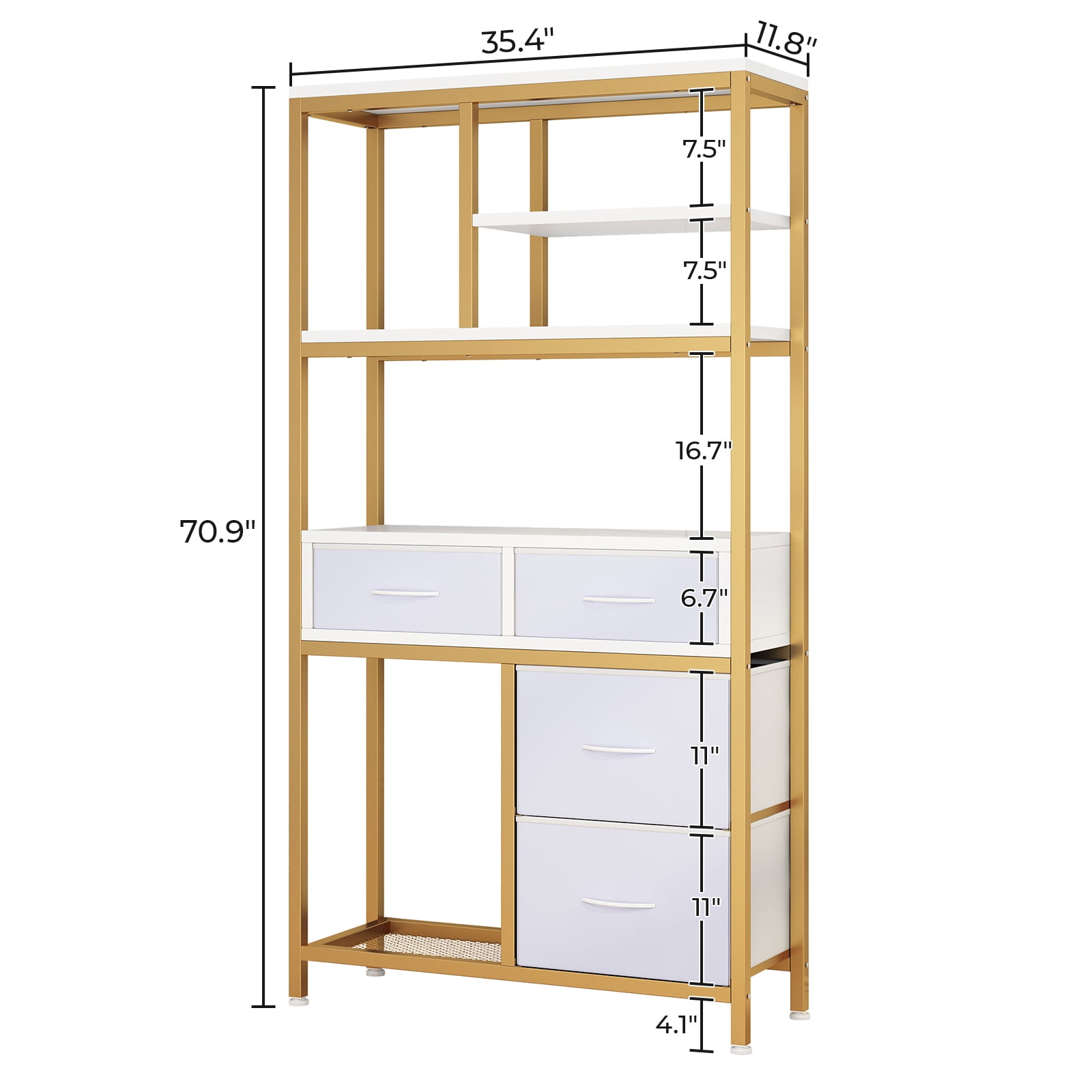 Metal frame builds a solid constryuction that makes sturdy bookshelf evenly stressed and can withstand more weight Thickened board with waterproof coating boasts its excellent durability and easy-to-clean Open shelf makes it super convenient to view all stored and displayed items and effortlessly fetch the items you need. 3 fabric drawers make it is an easy way to collect and display your favorite photos, books, collectibles